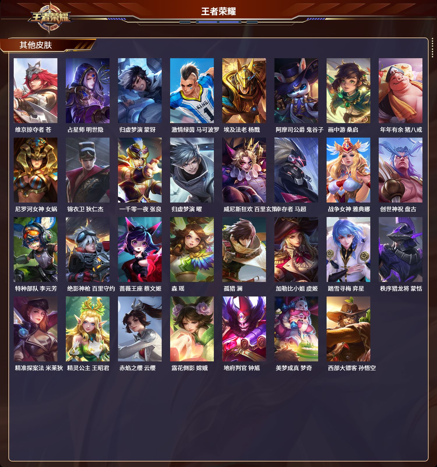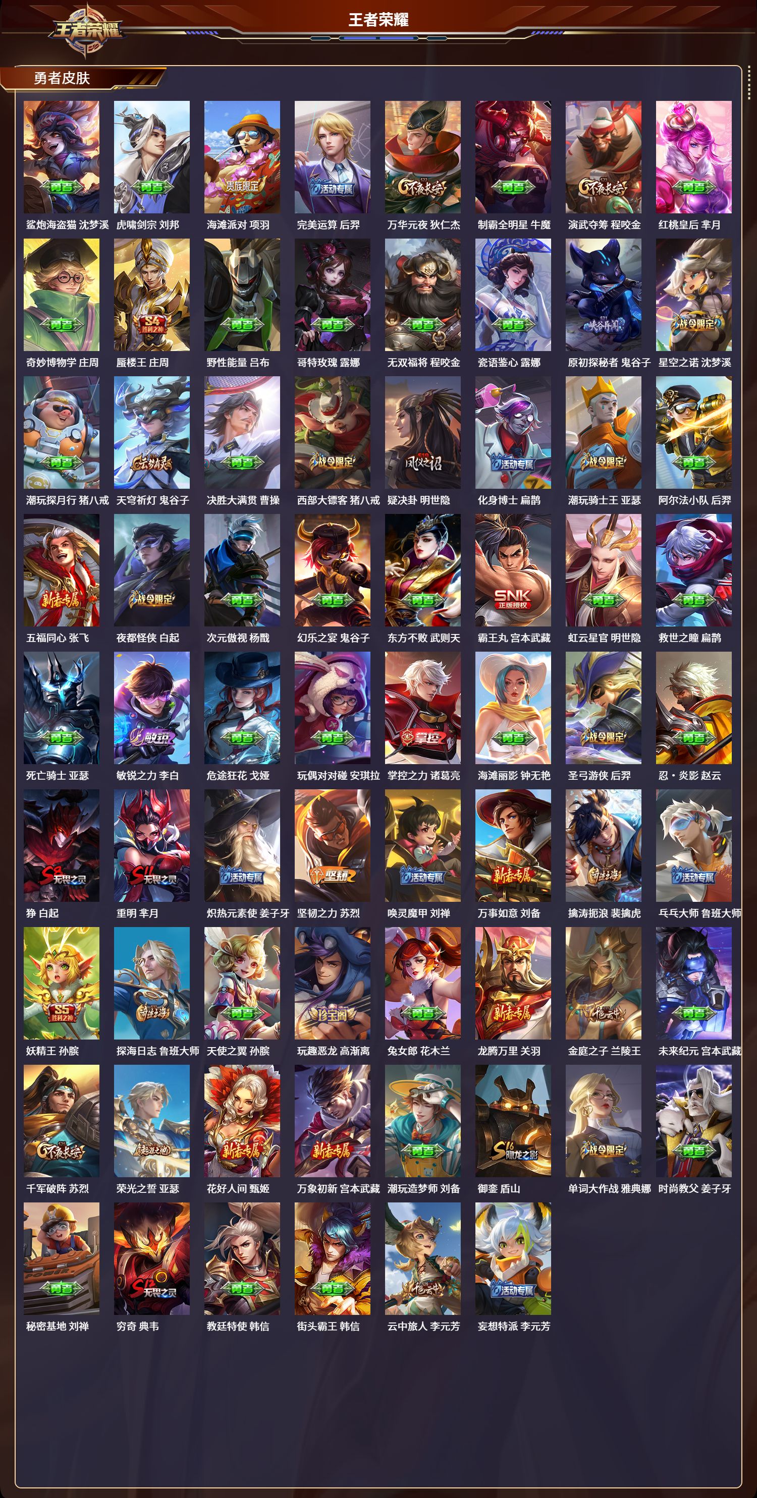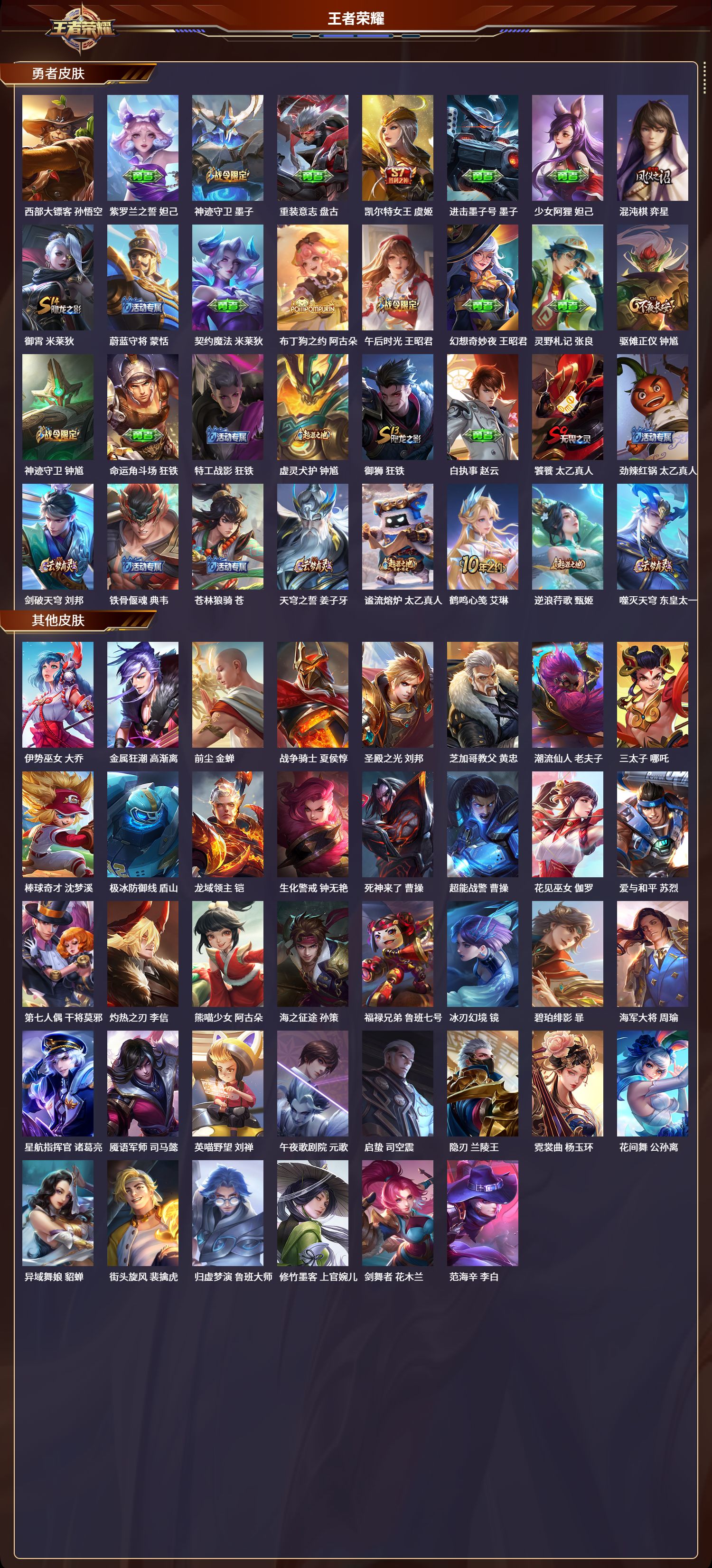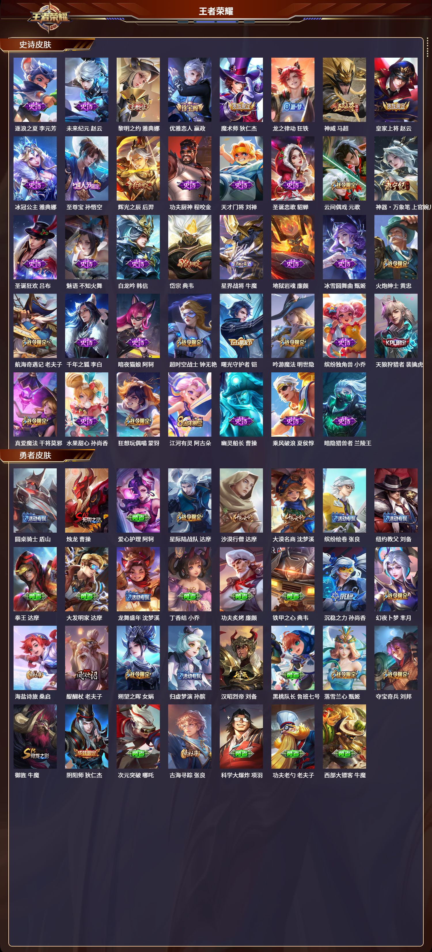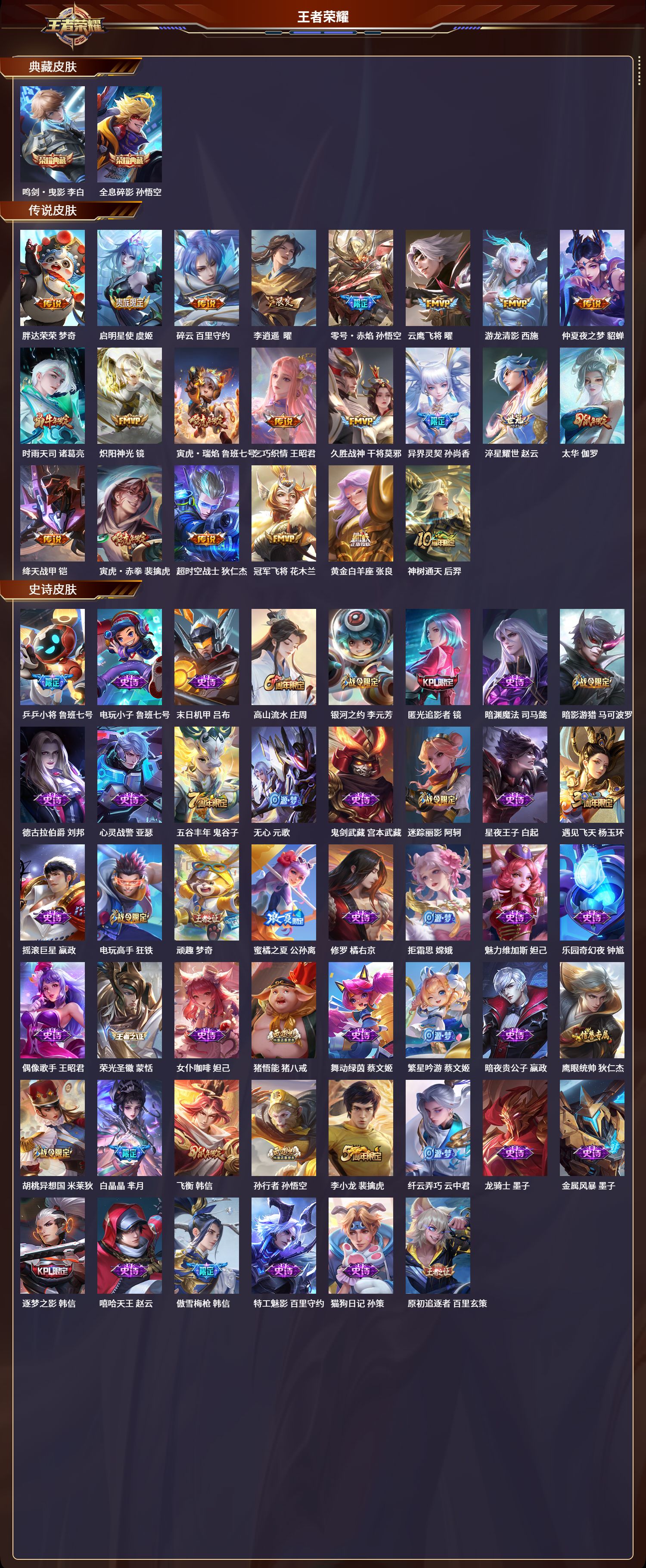 安卓qq/绝世王者/310皮肤/124英雄/2典藏/0珍品无双/0无双/0珍品传说/22传说/85史诗/8稀有英雄【2 典藏皮肤】鸣剑·曳影 李白全息碎影 孙悟空【22 传说皮肤】胖达荣荣 梦奇启明星使 虞姬碎云 百里守约李 曜零号·赤焰 孙悟空云鹰飞将 曜游龙清影 西施仲夏夜之梦 貂蝉时雨天司 诸葛亮炽阳神光 镜寅虎·瑞焰 鲁班七号乞巧织情 王
