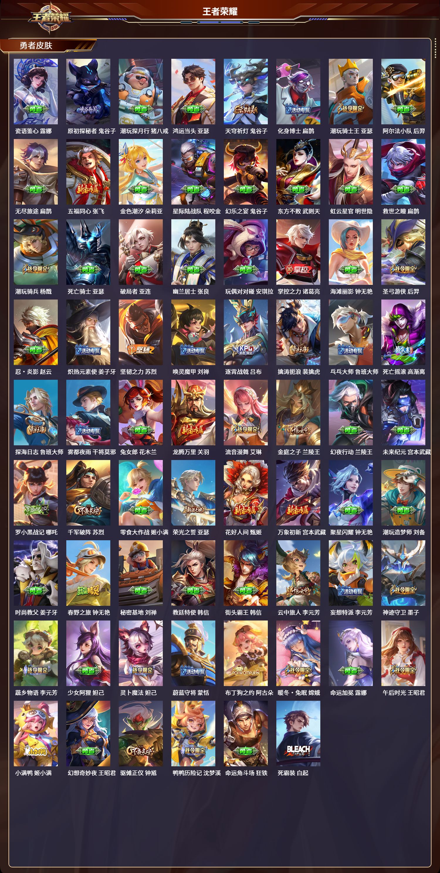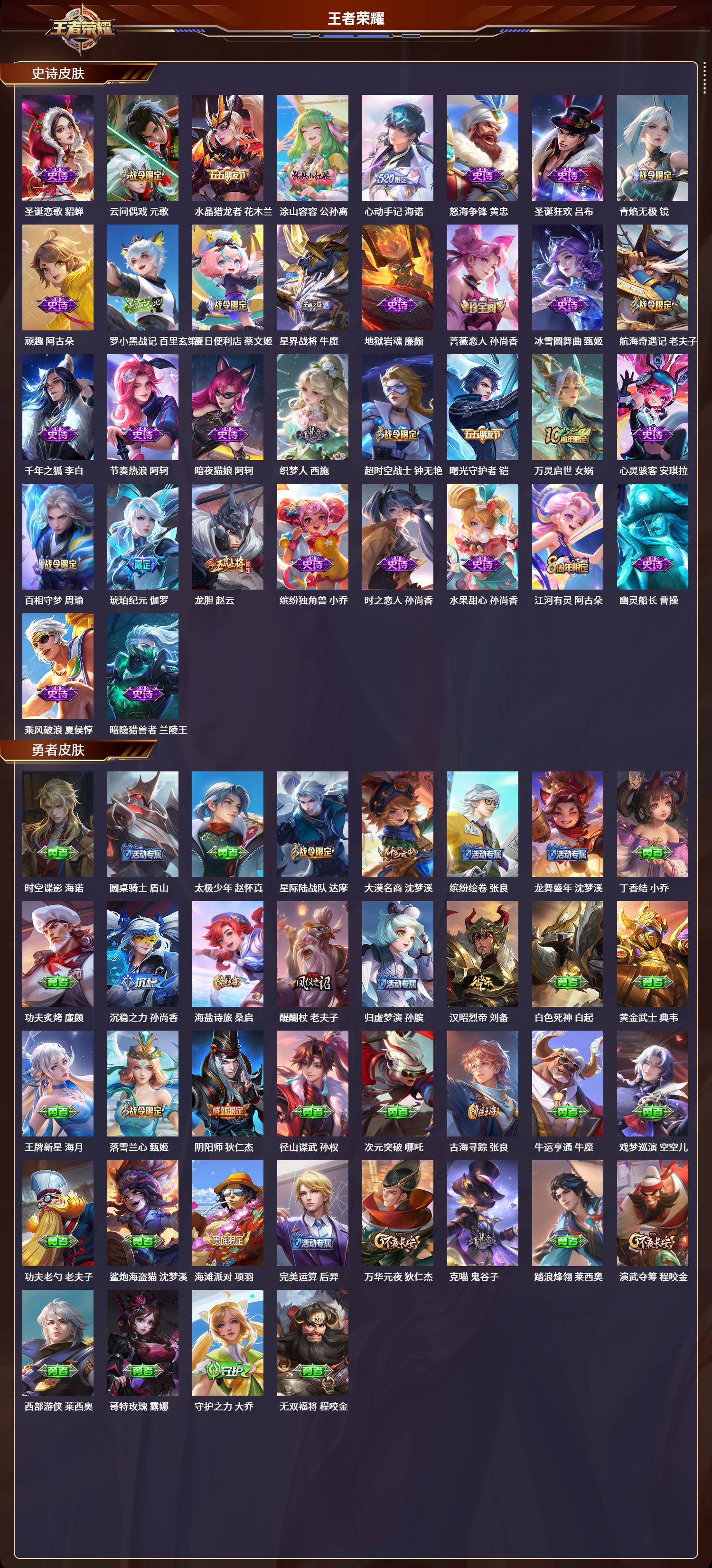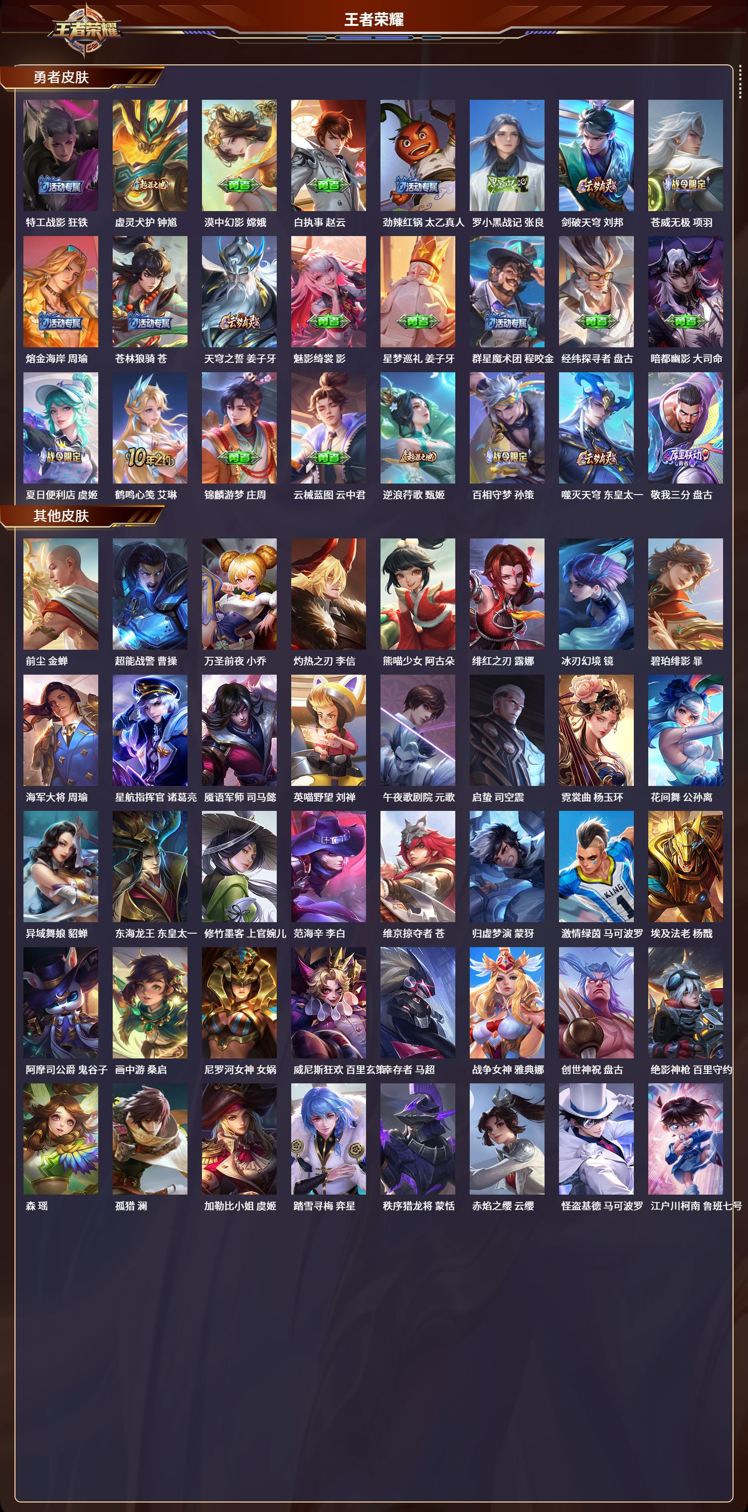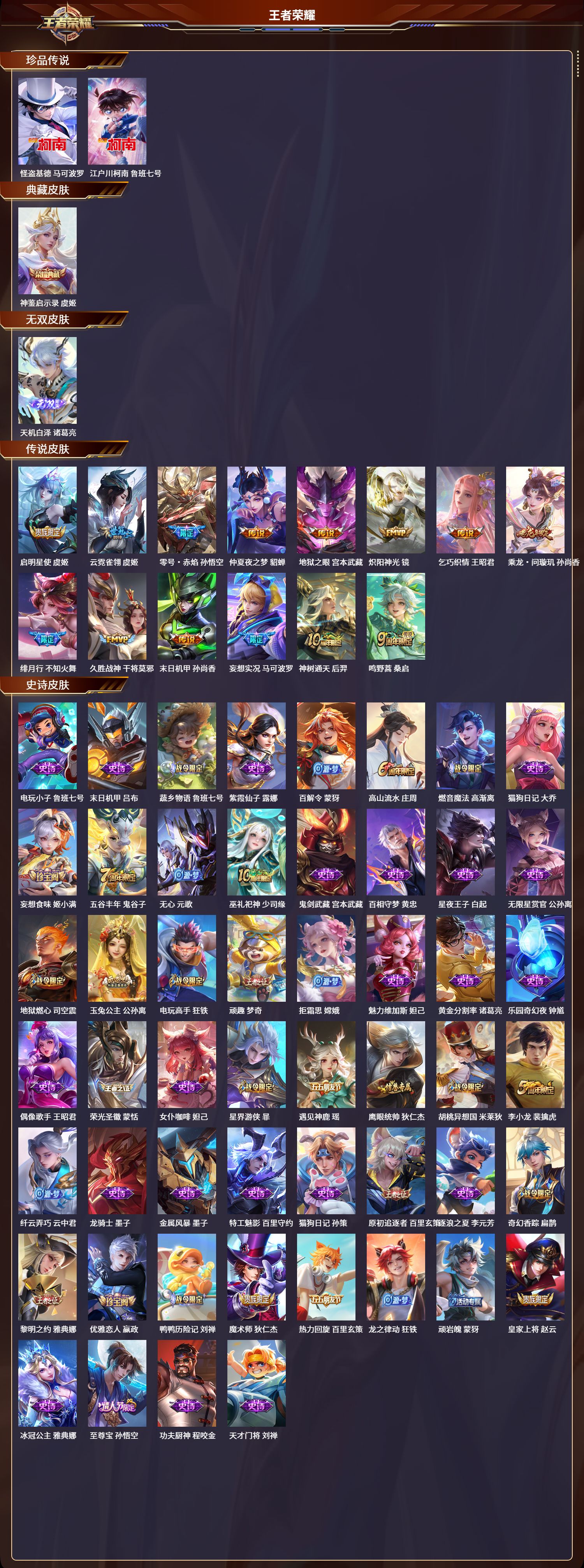 安卓qq/非凡王者/272皮肤/125英雄/1典藏/0珍品无双/1无双/2珍品传说/14传说/86史诗/9稀有英雄【2 珍品传说】怪盗基德 马可波罗江户川柯南 鲁班七号【1 典藏皮肤】神鉴启示录 虞姬【1 无双皮肤】天机白泽 诸葛亮【14 传说皮肤】启明星使 虞姬云霓雀翎 虞姬零号·赤焰 孙悟空仲夏夜之梦 貂蝉地狱之眼 宫本武藏炽阳神光 镜乞巧织情 王昭君乘龙·问璇玑 孙尚香