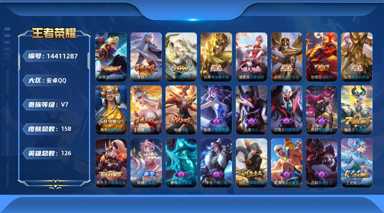 [14411287]安卓q-v0-永恒钻石iv段位-126英雄-158皮肤-1典藏-0珍品无双-0无双-0珍品传说-7传说-37史诗 【荣耀典藏】:孙悟空全息碎影 【传说皮肤】:镜炽阳神光,张良黄金白羊座,达摩黄金狮子座,后羿黄金射手座,诸葛亮武陵仙君,李白凤求凰,孙悟空地狱火 【限定皮肤】:白起狰,狄仁杰阴阳师,赵云皇家上将,嬴政优雅恋人,鲁班七号狮舞东方,芈月重明,周瑜赤莲之焰,元歌无心,夏侯惇朔风刀,甄姬游园惊梦,曹操烛龙,典韦穷奇,典韦蓝屏警告,狄仁杰魔术师,达摩沙漠行僧,项羽海滩派对,老夫子醍醐杖,韩信飞衡,王昭君凤凰于飞,兰陵王驯魔猎人,兰陵王金庭之子,牛魔御旌,李元芳云中旅人,钟馗神迹守卫,杨玉环遇见飞天,女娲朔望之晖,蔡文姬繁星吟游,太乙真人饕餮,鬼谷子原初探秘者,鬼谷子五谷丰年,诸葛亮武陵仙君,弈星混沌棋,沈梦溪大漠名商,明世隐疑决卦,裴擒虎擒涛扼浪,狂铁御狮,米莱狄御霄,盾山御銮,上官婉儿梁祝,嫦娥拒霜思,鲁班大师探海日志,桑启海盐诗旅 【年限皮肤】:王昭君凤凰于飞,李白凤求凰,韩信飞衡 【赛季限定】:白起狰,芈月重明,夏侯惇朔风刀,曹操烛龙,典韦穷奇,达摩沙漠行僧,老夫子醍醐杖,兰陵王金庭之子,牛魔御旌,李元芳云中旅人,太乙真人饕餮,鬼谷子原初探秘者,弈星混沌棋,沈梦溪大漠名商,明世隐疑决卦,裴擒虎擒涛扼浪,狂铁御狮,米莱狄御霄,盾山御銮,鲁班大师探海日志,桑启海盐诗旅 【战令限定】:鲁班七号狮舞东方,周瑜赤莲之焰,典韦蓝屏警告,兰陵王驯魔猎人,钟馗神迹守卫,女娲朔望之晖 【史诗皮肤】:阿轲暗夜猫娘,赵云皇家上将,貂蝉圣诞恋歌,甄姬冰雪圆舞曲,王昭君偶像歌手,狄仁杰魔术师,宫本武藏鬼剑武藏,孙尚香水果甜心,嬴政优雅恋人,妲己魅力维加斯,墨子金属风暴,曹操幽灵船长,李白千年之狐,王昭君凤凰于飞,花木兰水晶猎龙者,刘邦德古拉伯爵,夏侯惇乘风破浪,小乔缤纷独角兽,甄姬游园惊梦,百里守约特工魅影,蔡文姬舞动绿茵,刘禅天才门将,李元芳逐浪之夏,程咬金功夫厨神,白起星夜王子,杨玉环遇见飞天,孙策猫狗日记,典韦蓝屏警告,鲁班七号狮舞东方,狄仁杰鹰眼统帅,兰陵王驯魔猎人,上官婉儿梁祝,蔡文姬繁星吟游,韩信飞衡,嫦娥拒霜思,鬼谷子五谷丰年,元歌无心 【其他皮肤】:项羽海滩派对,韩信教廷特使,韩信街头霸王,露娜哥特玫瑰,阿轲爱心护理,达摩大发明家,赵云忍炎影,程咬金星际陆战队,白起