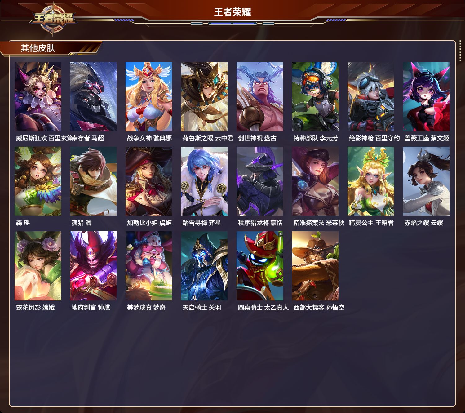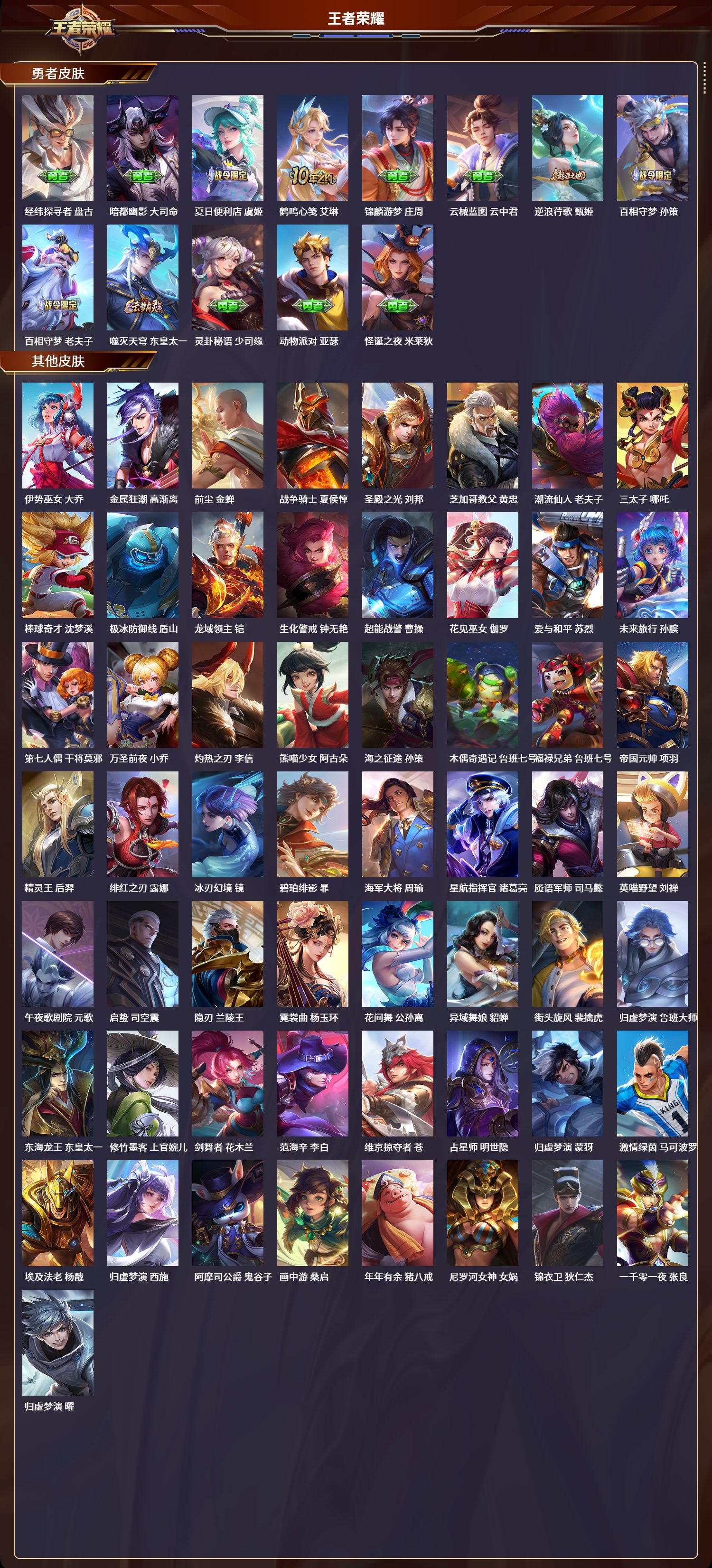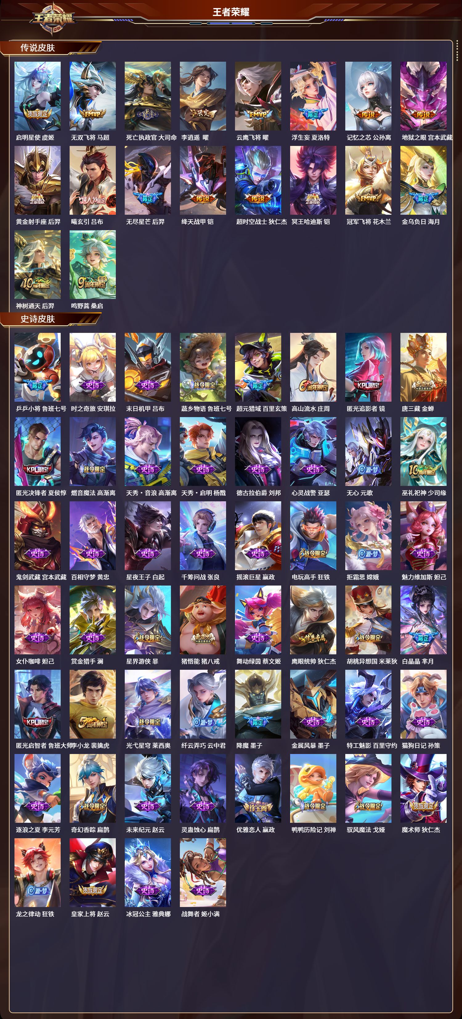 安卓微信/非凡王者/372皮肤/125英雄/0典藏/0珍品无双/0无双/0珍品传说/18传说/101史诗/9稀有英雄【18 传说皮肤】启明星使 虞姬无双飞将 马超死亡执政官 大司命李 曜云鹰飞将 曜浮生妄 夏洛特记忆之芯 公孙离地狱之眼 宫本武藏黄金射手座 后羿曦玄引 吕布无尽星芒 后羿绛天战甲 铠超时空战士 狄仁杰冥王哈迪斯 铠冠军飞将 花木兰金乌负日 海月