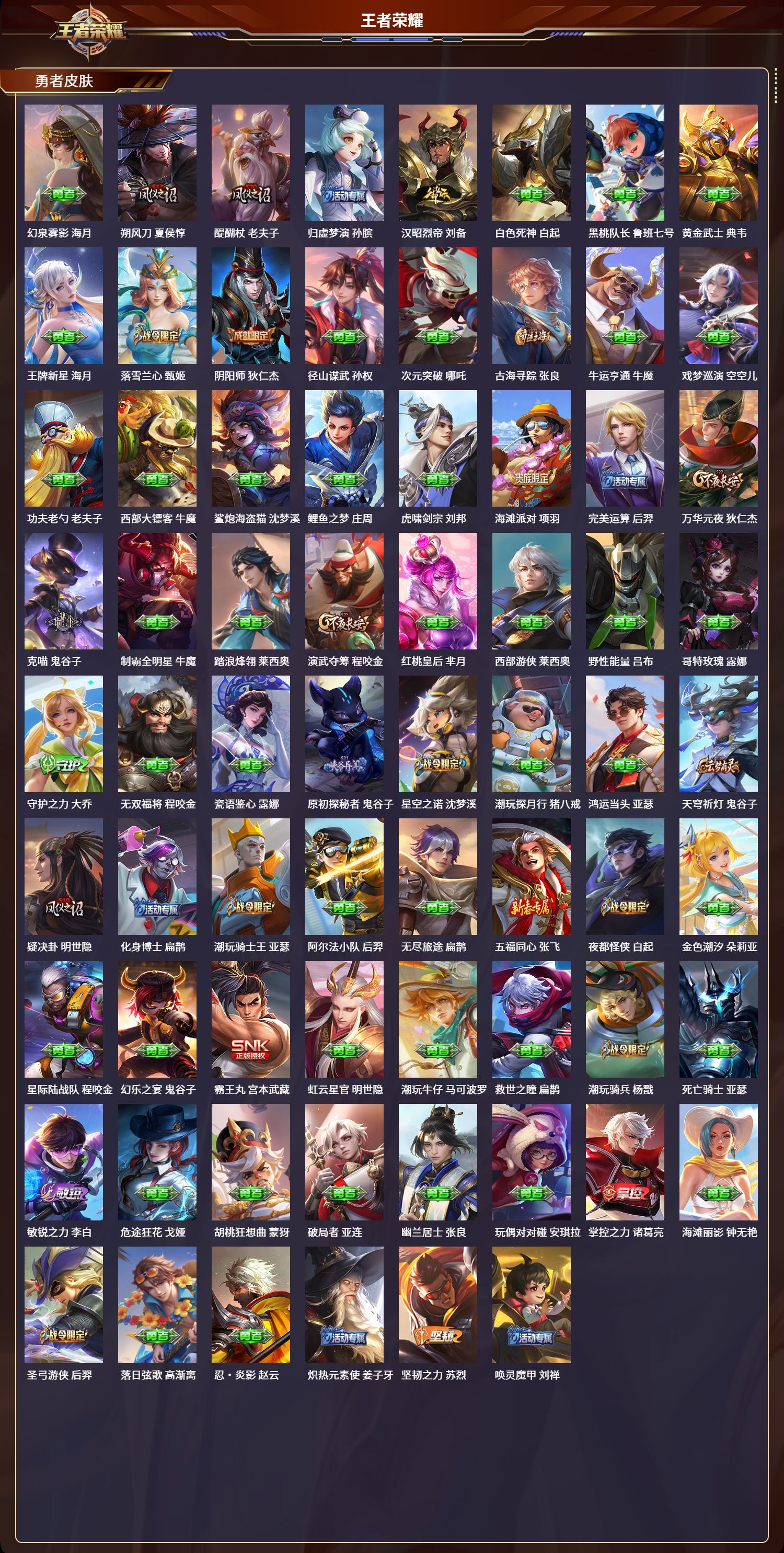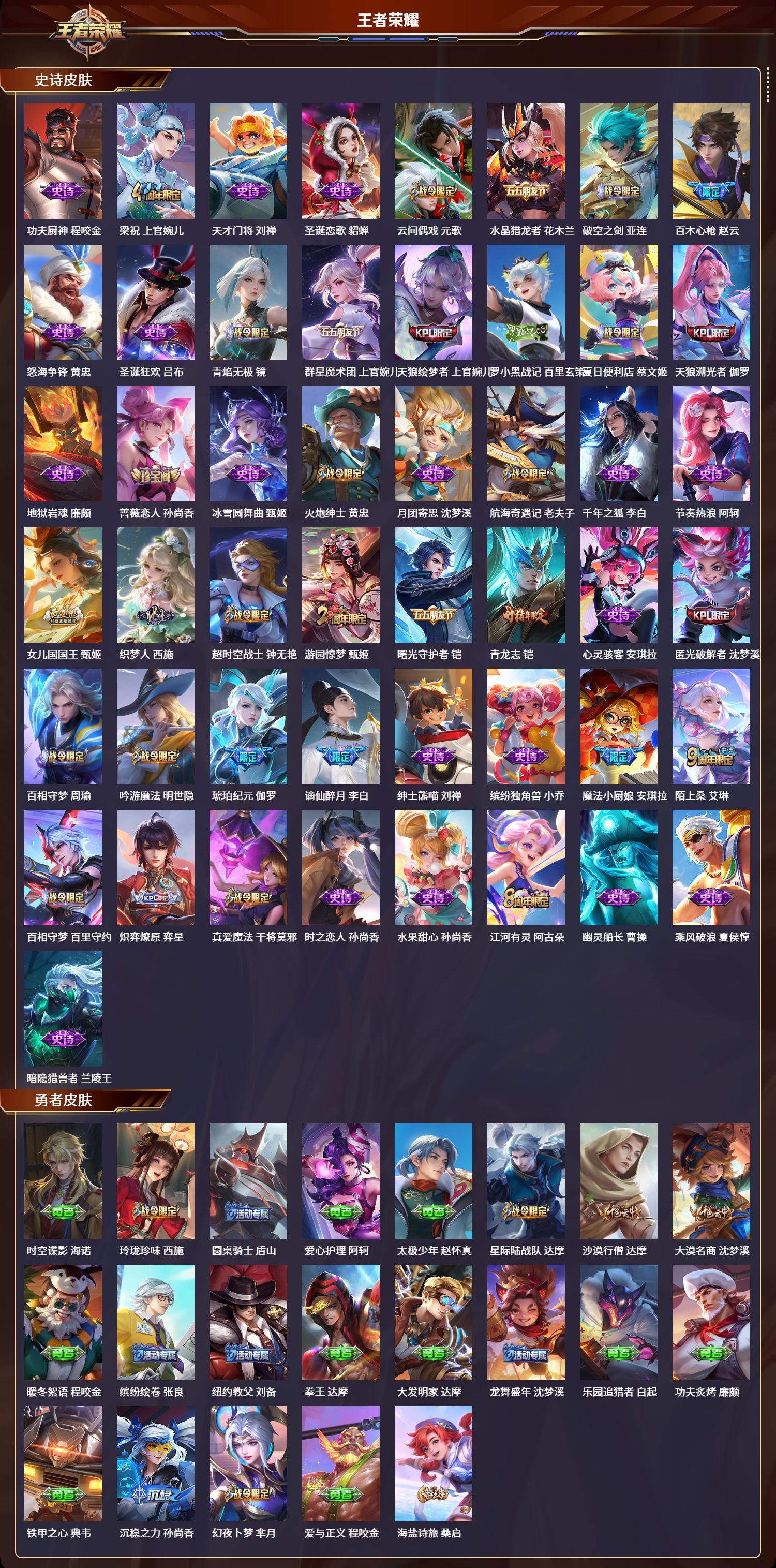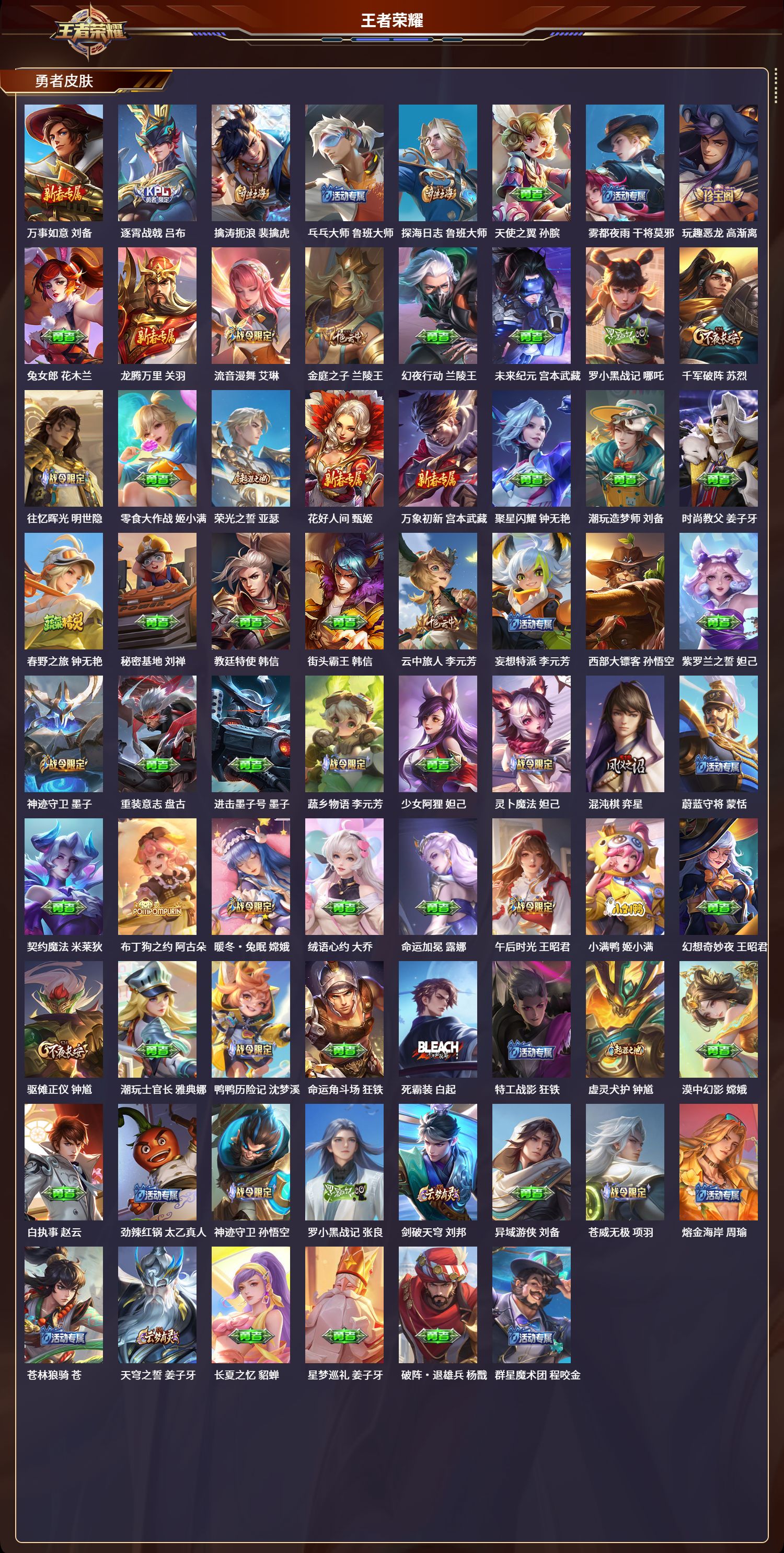安卓微信/非凡王者/372皮肤/125英雄/0典藏/0珍品无双/0无双/0珍品传说/18传说/101史诗/9稀有英雄【18 传说皮肤】启明星使 虞姬无双飞将 马超死亡执政官 大司命李 曜云鹰飞将 曜浮生妄 夏洛特记忆之芯 公孙离地狱之眼 宫本武藏黄金射手座 后羿曦玄引 吕布无尽星芒 后羿绛天战甲 铠超时空战士 狄仁杰冥王哈迪斯 铠冠军飞将 花木兰金乌负日 海月