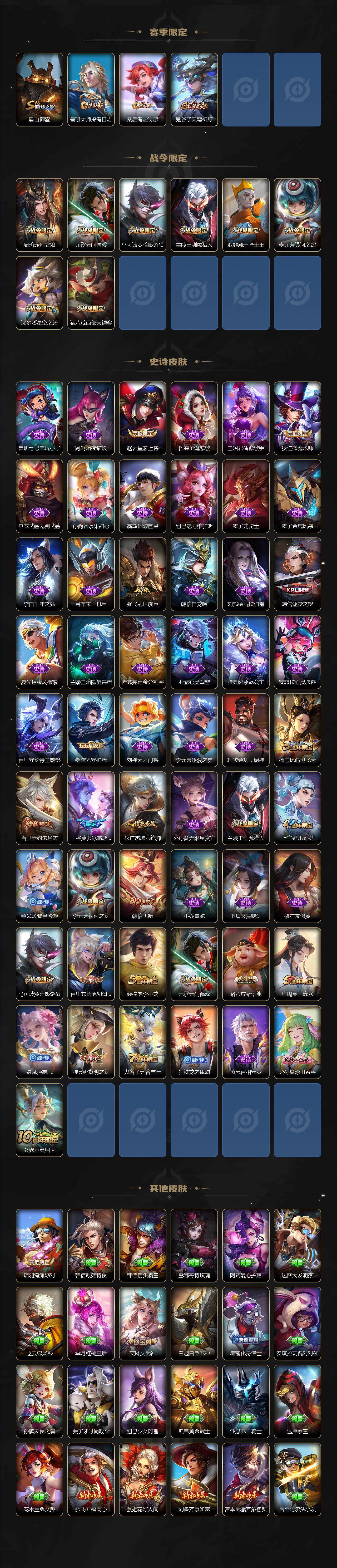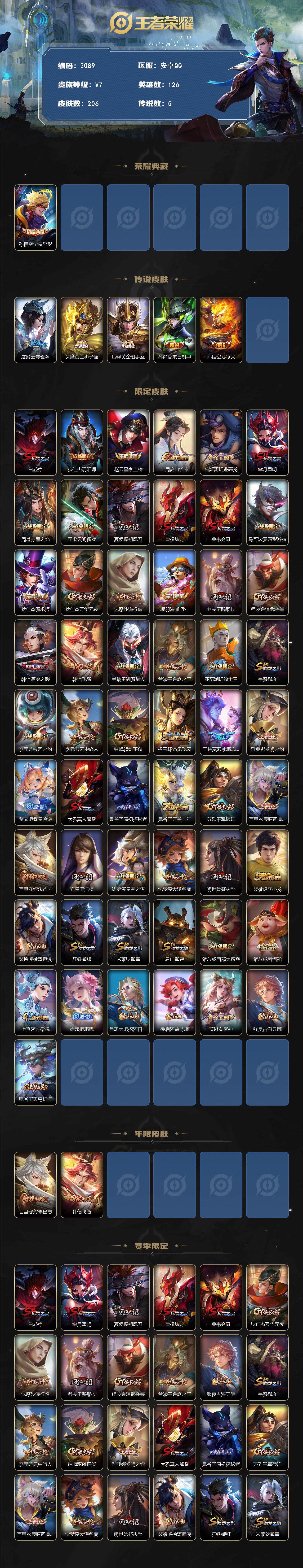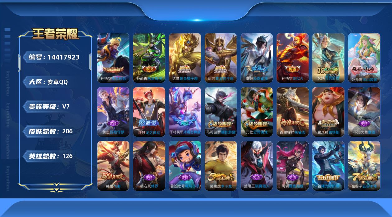 [14417923]安卓q-v7-最强王者段位-126英雄-206皮肤-1典藏皮肤-5传说-55史诗 【荣耀典藏】:孙悟空全息碎影 【传说皮肤】:虞姬云霓雀翎,达摩黄金狮子座,后羿黄金射手座,孙尚香末日机甲,孙悟空地狱火 【限定皮肤】:白起狰,狄仁杰阴阳师,赵云皇家上将,庄周高山流水,高渐离玩趣恶龙,芈月重明,周瑜赤莲之焰,元歌云间偶戏,夏侯惇朔风刀,曹操烛龙,典韦穷奇,马可波罗暗影游猎,狄仁杰魔术师,狄仁杰万华元夜,达摩沙漠行僧,项羽海滩派对,老夫子醍醐杖,程咬金演武夺筹,韩信逐梦之影,韩信飞衡,兰陵王驯魔猎人,兰陵王金庭之子,亚瑟潮玩骑士王,牛魔御旌,李元芳银河之约,李元芳云中旅人,钟馗驱傩正仪,杨玉环遇见飞天,干将莫邪冰霜恋舞曲,雅典娜黎明之约,蔡文姬繁星吟游,太乙真人饕餮,鬼谷子原初探秘者,鬼谷子五谷丰年,苏烈千军破阵,百里玄策原初追逐者,百里守约朱雀志,弈星混沌棋,沈梦溪星空之诺,沈梦溪大漠名商,明世隐疑决卦,裴擒虎李小龙,裴擒虎擒涛扼浪,狂铁御狮,米莱狄御霄,盾山御銮,猪八戒西部大镖客,猪八戒猪悟能,上官婉儿梁祝,嫦娥拒霜思,鲁班大师探海日志,桑启海盐诗旅,艾琳女武神,张良古海寻踪,鬼谷子天穹祈灯 【年限皮肤】:百里守约朱雀志,韩信飞衡 【赛季限定】:白起狰,芈月重明,夏侯惇朔风刀,曹操烛龙,典韦穷奇,狄仁杰万华元夜,达摩沙漠行僧,老夫子醍醐杖,程咬金演武夺筹,兰陵王金庭之子,张良古海寻踪,牛魔御旌,李元芳云中旅人,钟馗驱傩正仪,雅典娜黎明之约,太乙真人饕餮,鬼谷子原初探秘者,苏烈千军破阵,百里玄策原初追逐者,弈星混沌棋,沈梦溪大漠名商,明世隐疑决卦,裴擒虎擒涛扼浪,狂铁御狮,米莱狄御霄,盾山御銮,鲁班大师探海日志,桑启海盐诗旅,鬼谷子天穹祈灯 【战令限定】:周瑜赤莲之焰,元歌云间偶戏,马可波罗暗影游猎,兰陵王驯魔猎人,亚瑟潮玩骑士王,李元芳银河之约,沈梦溪星空之诺,猪八戒西部大镖客 【史诗皮肤】:鲁班七号电玩小子,阿轲暗夜猫娘,赵云皇家上将,貂蝉圣诞恋歌,王昭君偶像歌手,狄仁杰魔术师,宫本武藏鬼剑武藏,孙尚香水果甜心,嬴政摇滚巨星,妲己魅力维加斯,墨子龙骑士,墨子金属风暴,李白千年之狐,吕布末日机甲,张飞乱世虎臣,韩信白龙吟,刘邦德古拉伯爵,韩信逐梦之影,夏侯惇乘风破浪,兰陵王暗隐猎兽者,诸葛亮黄金分割率,亚瑟心灵战警,雅典娜冰冠公主,安琪拉心灵骇客,百里守约特工魅影,