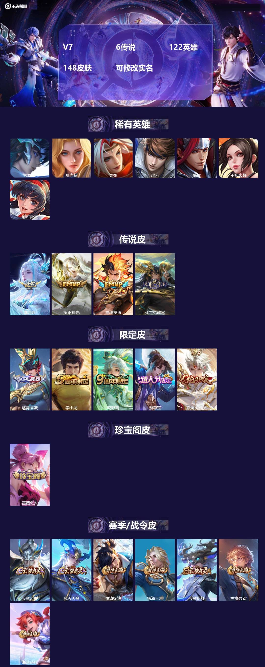[14422007]v7 6传说 122英雄 148皮肤 可修改实名 【英雄全皮】:空空儿全皮 【稀有英雄】:大司命韩信韩跳跳夏洛特夏师傅娜可露露鸟人不知火舞赵云戈娅 【传说皮】:死亡执政官祥瑞亨通炽阳神光霜月吟 【珍宝阁皮】:蔷薇恋人 【赛季/战令皮】:噬灭天穹s