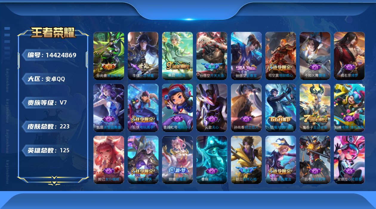 [14424869]安卓q-v7-至尊星耀ii段位-125英雄-223皮肤-4传说-57史诗 【传说皮肤】:桑启鸣野蒿,孙悟空齐天大圣,李信一念神魔,孙尚香末日机甲 【限定皮肤】:姜子牙天穹之誓,狄仁杰阴阳师,赵云皇家上将,赵云百木心呛,墨子神迹守卫,高渐离玩趣恶龙,钟无艳超时空战士,扁鹊奇幻香踪,元歌无心,甄姬游园惊梦,甄姬落雪兰心,狄仁杰魔术师,达摩沙漠行僧,项羽海滩派对,王昭君午后时光,兰陵王金庭之子,孙悟空至尊宝,孙悟空齐天大圣,李元芳云中旅人,钟馗驱傩正仪,杨玉环遇见飞天,杨戬潮玩骑兵,鬼谷子五谷丰年,苏烈千军破阵,沈梦溪大漠名商,裴擒虎擒涛扼浪,狂铁电玩高手,云中君纤云弄巧,嫦娥拒霜思,嫦娥暖冬兔眠,西施玲珑珍味,鲁班大师探海日志,桑启海盐诗旅,暃星界游侠,戈娅驭风魔法,艾琳流音漫舞,司空震地狱燃心,阿古朵江河有灵,张良古海寻踪,蒙犽百解令,鬼谷子天穹祈灯,沈梦溪龙舞盛年,刘邦剑破天穹,程咬金群星魔术团 【赛季限定】:达摩沙漠行僧,兰陵王金庭之子,张良古海寻踪,李元芳云中旅人,钟馗驱傩正仪,苏烈千军破阵,沈梦溪大漠名商,裴擒虎擒涛扼浪,鲁班大师探海日志,桑启海盐诗旅,鬼谷子天穹祈灯,刘邦剑破天穹,姜子牙天穹之誓 【战令限定】:墨子神迹守卫,钟无艳超时空战士,扁鹊奇幻香踪,甄姬落雪兰心,王昭君午后时光,艾琳流音漫舞,杨戬潮玩骑兵,狂铁电玩高手,嫦娥暖冬兔眠,西施玲珑珍味,司空震地狱燃心,暃星界游侠,戈娅驭风魔法 【史诗皮肤】:鲁班七号电玩小子,赵云皇家上将,赵云未来纪元,貂蝉圣诞恋歌,甄姬冰雪圆舞曲,王昭君偶像歌手,狄仁杰魔术师,宫本武藏鬼剑武藏,孙尚香水果甜心,嬴政摇滚巨星,妲己魅力维加斯,妲己女仆咖啡,墨子龙骑士,墨子金属风暴,吕布圣诞狂欢,曹操幽灵船长,吕布末日机甲,孙悟空至尊宝,夏侯惇乘风破浪,小乔缤纷独角兽,兰陵王暗隐猎兽者,诸葛亮黄金分割率,甄姬游园惊梦,亚瑟心灵战警,雅典娜冰冠公主,安琪拉心灵骇客,百里守约特工魅影,铠曙光守护者,蔡文姬舞动绿茵,刘禅天才门将,李元芳逐浪之夏,程咬金功夫厨神,白起星夜王子,阿轲节奏热浪,杨玉环遇见飞天,孙策猫狗日记,狄仁杰鹰眼统帅,不知火舞魅语,橘右京修罗,孙尚香时之恋人,云中君纤云弄巧,嫦娥拒霜思,赵云百木心呛,貂蝉唤灵魅影,狂铁电玩高手,钟无艳超时空战士,鬼谷子五谷丰年,元歌无心,暃星界游侠,镜玫瑰异探,扁鹊奇幻香踪,刘禅电