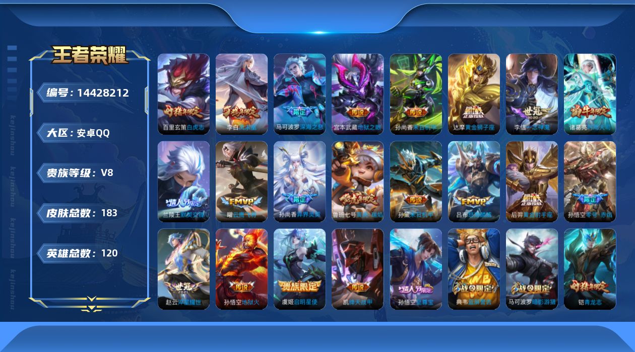 [14428212]v8 20传说 120英雄 183皮肤 可修改实名 【稀有英雄】:大司命嬴政始皇帝韩信韩跳跳夏洛特夏师傅艾琳橘右京橘子娜可露露鸟人不知火舞赵云金蝉唐僧戈娅 【传说皮】:黄金狮子座黄金射手座零号·赤焰地狱火地狱之眼末日机甲-孙尚香绿蚂蚱一念神魔淬星耀世云鹰飞将小将军绛天战甲鸡嘴战神末日机甲-孙策 【珍宝阁皮】:蔷薇恋人 【赛季/战令皮】:古海寻踪s33星界游侠海盐诗旅s30擒涛扼浪s31潮玩骑兵奇幻香踪探海日志s32天穹祈灯s34暖冬·兔眠御銮s16朔风刀s17混沌棋s18疑决卦s19醍醐杖s20原初探秘者s21万华元夜s22演武夺筹s23驱傩正仪s24千军破阵s25猎兽之王蓝屏警告西部大镖客-猪八戒暗影游猎游乐娃子单词大作战狂想玩偶喵潮玩骑士王云间偶戏神迹守卫-墨子航海奇遇记圣弓游侠真爱魔法沙漠行僧s26金庭之子s27电玩高手电玩铁子午后时光大漠名商s28云中旅人s29 【史诗皮】:电玩小子小书包白龙吟黄金分割率永昼龙骑士小龙虾冰冠公主晚萤节奏热浪星夜王子功夫厨神幽灵船长暗渊魔法心灵战警地狱岩魂纤云弄巧繁星吟游呼啦呼啦乘风破浪逐浪之夏水晶猎龙者曙光守护者金属风暴圣诞狂欢鹰眼统帅黎明之约赏金猎手无心未来纪元-赵云 【限定皮】:至尊宝白虎志电光耗子凤求凰白切鸡异界灵契白毛香白晶晶时雨天司水龙头怒海麟威青龙志铠年限冰锋战神梁祝逐梦之星烈魂天狼溯光者李小龙逐梦之影逐梦之光霸王别姬-项羽霸王别姬-虞姬默契交锋-兰陵王大圣娶亲匿光追影者寅虎·瑞焰虎皮蛋子深海之息深海大菠萝 【普通皮】:神迹守卫刘邦虎啸剑宗亚瑟鸿运当头功夫炙烤街头霸王危途狂花潮玩造梦师太极少年西部游侠鬼谷子天穹祈灯s34胡桃狂想曲万事如意五福同心归虚梦演-曜海滩丽影海滩派对皇家上将魔术师启明星使掌控之力守护之力坚韧之力敏锐之力霸王丸缤纷绘卷纽约教父圆桌骑士(盾山)乓乓大师万象初新黄金武士