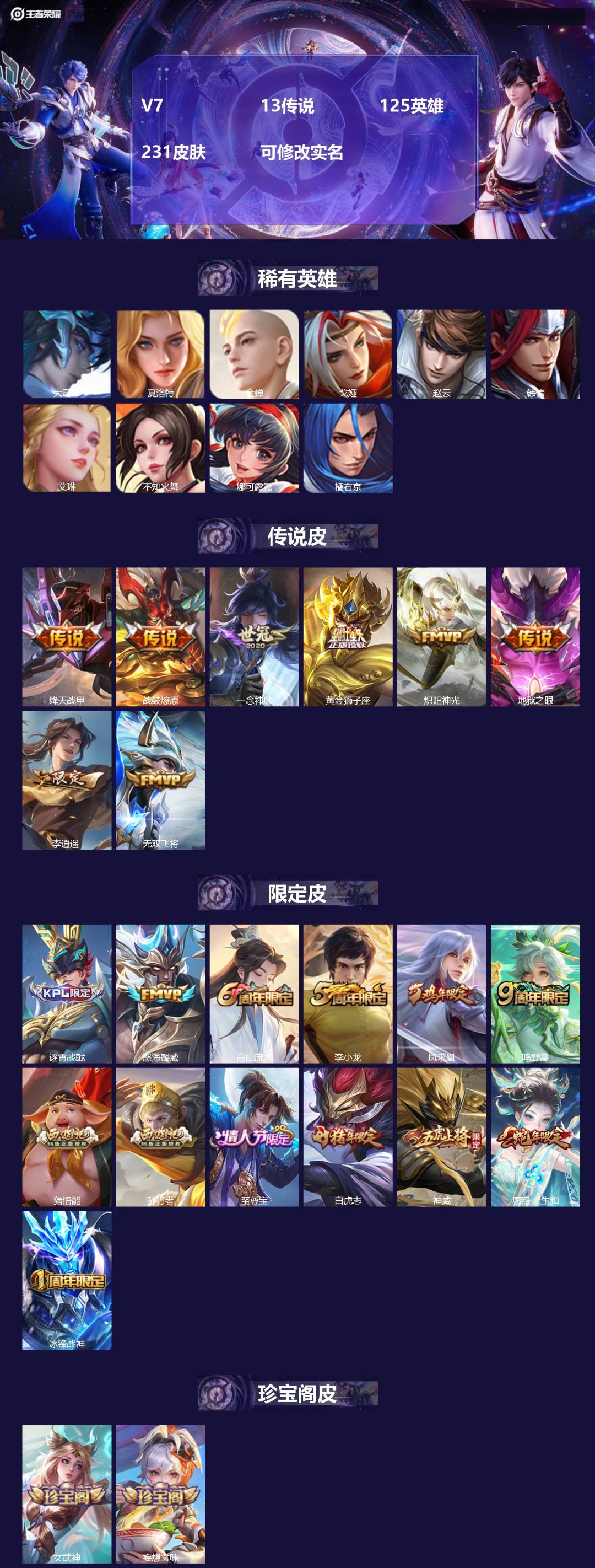 [14428866]v7 13传说 125英雄 231皮肤 可修改实名 【英雄全皮】:蒙恬全皮达摩全皮 【稀有英雄】:大司命韩信韩跳跳夏洛特夏师傅艾琳橘右京橘子娜可露露鸟人不知火舞赵云金蝉唐僧戈娅 【传说皮】:典韦战鼓燎原李黄金狮子座地狱之眼一念