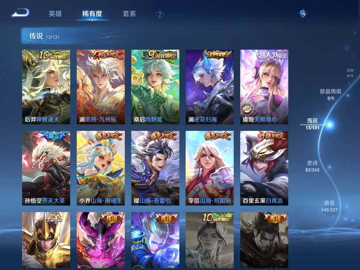 127英雄-311皮肤-苹果q-v-311皮肤-1典藏皮肤-13传说-82史诗 【英雄全皮】:孙权全皮,太乙真人全皮,影全皮 【荣耀典藏】:铠银白咏叹调 【传说皮肤】:后羿神树通天,澜愿照九州拓,桑启鸣野蒿,澜逐花归海,虞姬无限倾心,孙悟空齐天大圣,小乔山海琳琅生,曜山海苍雷引,李信山海炽霜斩,百里玄策白虎志,后羿黄金射手