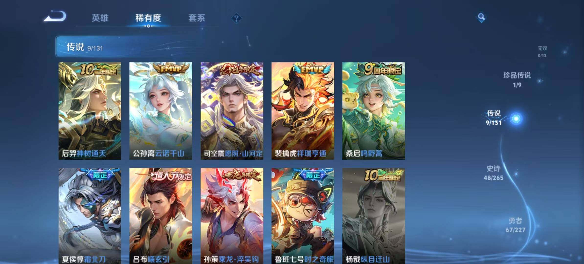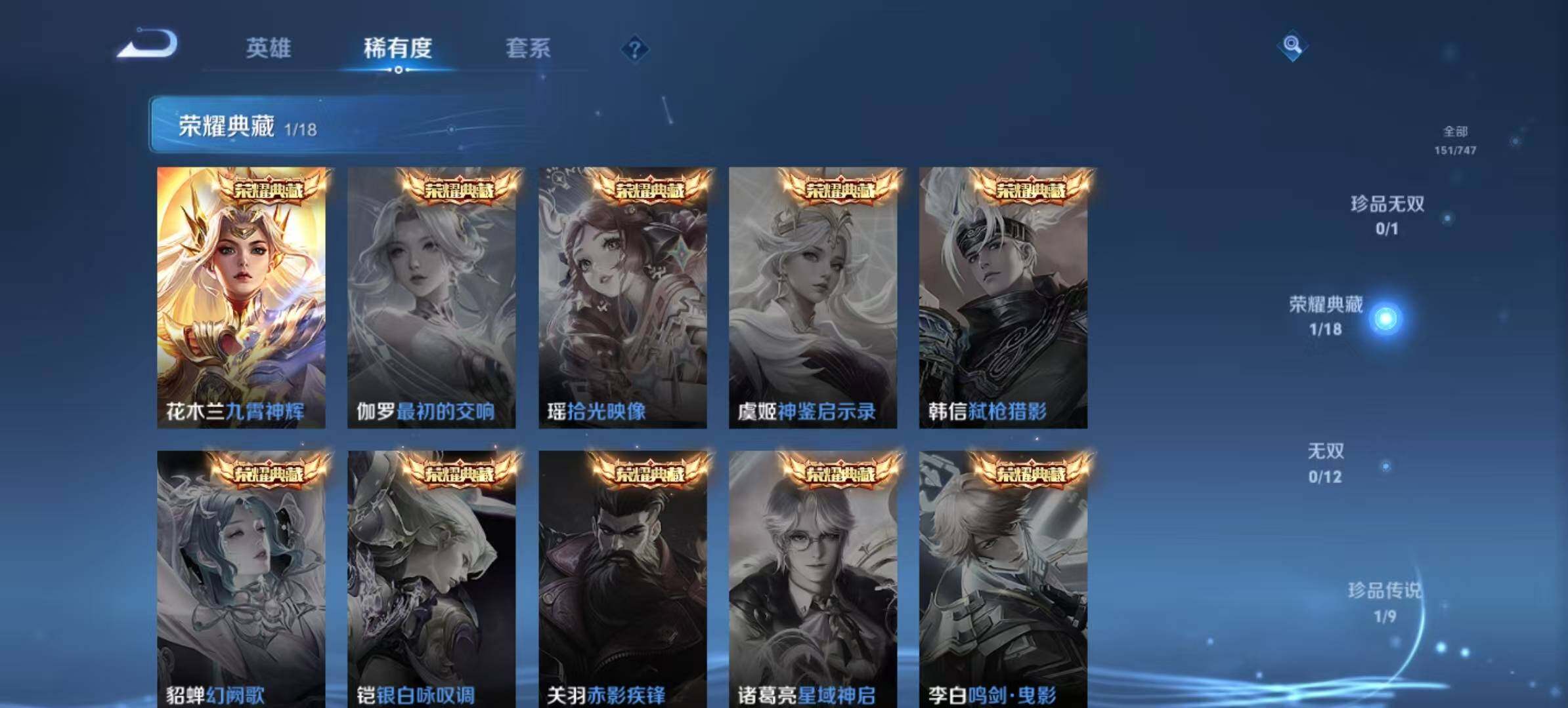 126英雄-151皮肤-安卓q-v7-151皮肤-1典藏皮肤-1珍品传说-9传说-48史诗 【荣耀典藏】:花木兰九霄神辉 【珍品传说】:孙策时之奇旅 【传说皮肤】:后羿神树通天,公孙离云诺千山,司空震愿照山河定,裴擒虎祥瑞亨通,桑启鸣野蒿,夏侯惇霜北刀,吕布曦玄引,孙策乘龙淬吴钩,鲁班七号时之奇旅 【限定皮肤】:夏侯惇霜北