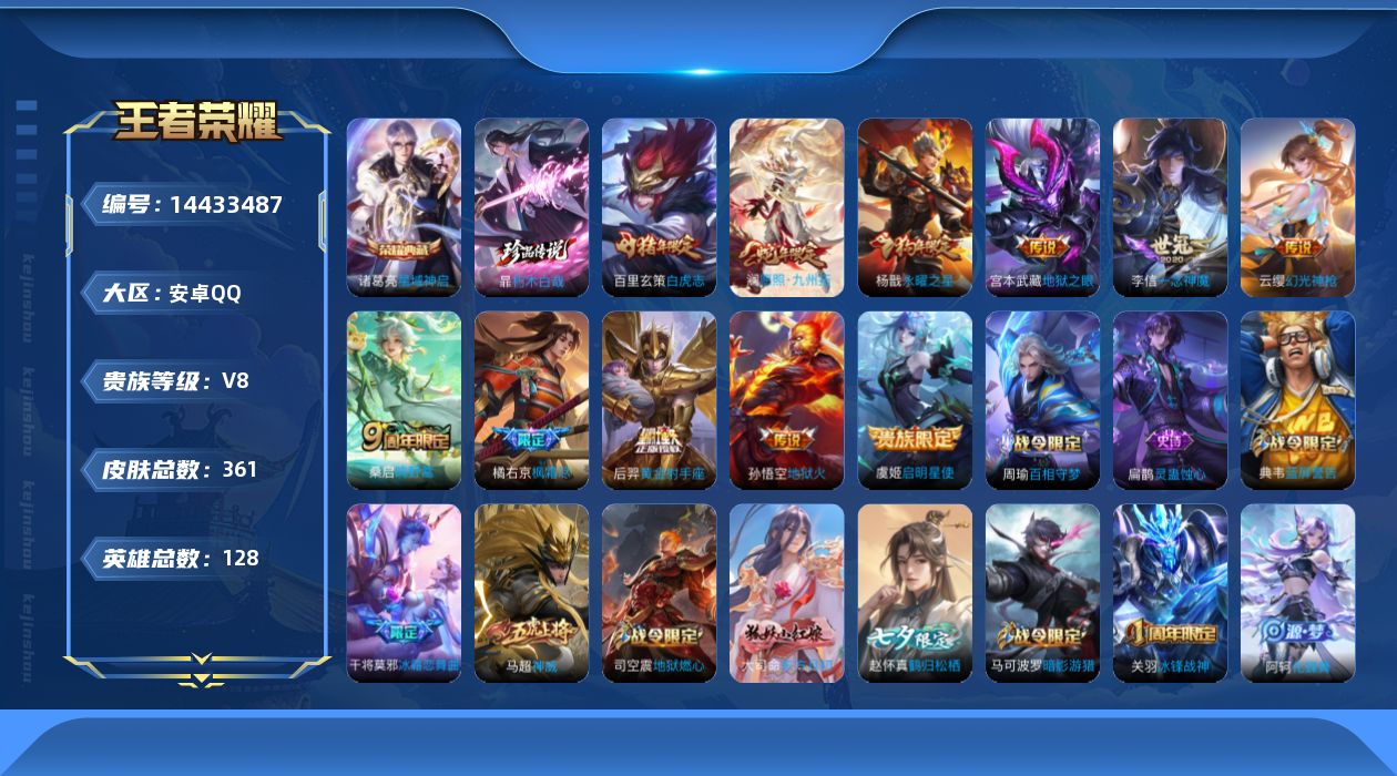 v8 1典藏 1珍品传说 12传说 128英雄 361皮肤 典藏英雄武则天 可修改实名 【英雄全皮】:阿轲全皮赵怀真全皮影全皮戈娅全皮 【稀有英雄】:敖隐小龙人大司命嬴政始皇帝韩信韩跳跳夏洛特夏师傅艾琳橘右京橘子娜可露露鸟人不知火舞赵云金蝉唐僧