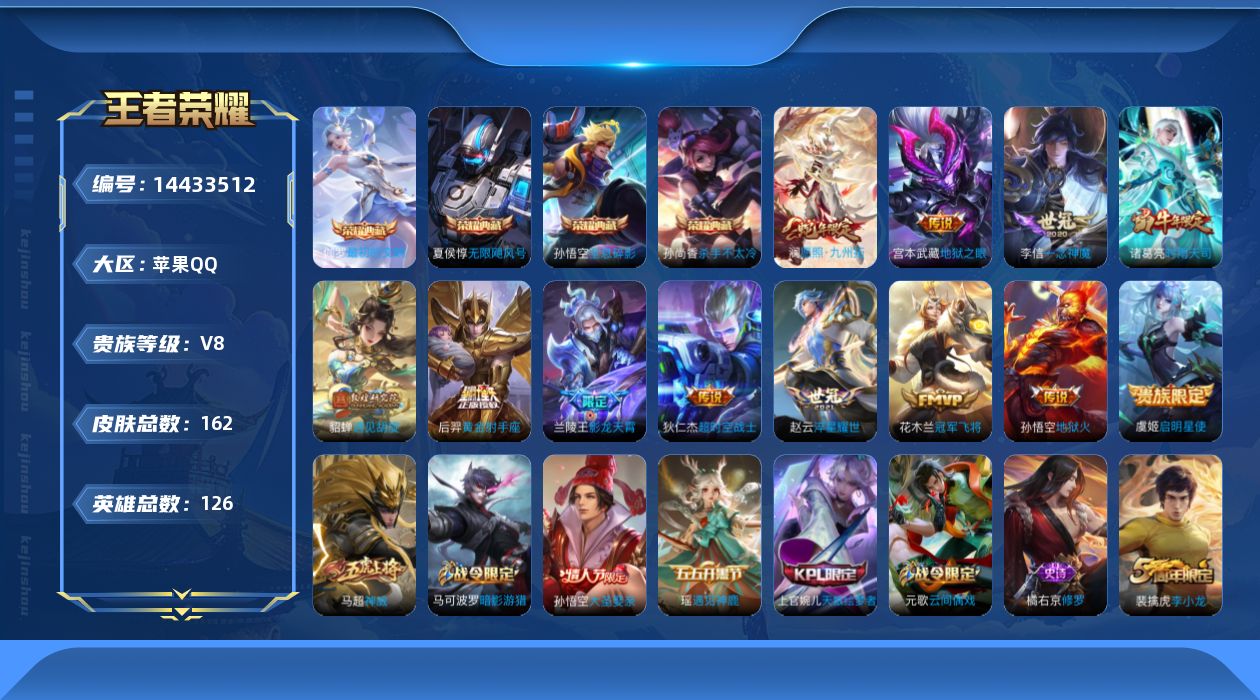 [14433512]v8 4典藏 12传说 126英雄 162皮肤 可修改实名 【英雄全皮】:蚩奼全皮 【稀有英雄】:大司命嬴政始皇帝韩信韩跳跳夏洛特夏师傅艾琳橘右京橘子娜可露露鸟人不知火舞赵云金蝉唐僧戈娅 【荣耀水晶】:最初的交响伽罗典藏全息碎影猴子典藏杀手不太冷无限飓风号高达 【传说皮】:遇见胡旋黄金射手座地狱火地狱之眼一念神魔淬星耀世冠军飞将超时空战士-狄仁杰 【珍宝阁皮】:优雅恋人 【赛季/战令皮】:噬灭天穹s37古海寻踪s33海盐诗旅s30探海日志s32天穹祈灯s34疑决卦s19醍醐杖s20原初探秘者s21万华元夜s22驱傩正仪s24千军破阵s25猎兽之王夺宝奇兵迷踪丽影西部大镖客-猪八戒暗影游猎游乐娃子潮玩骑士王云间偶戏神迹守卫-墨子航海奇遇记圣弓游侠真爱魔法沙漠行僧s26金庭之子s27大漠名商s28云中旅人s29 【史诗皮】:茶境仙遇见神鹿白龙吟特工魅影千年之狐高渐离燃音魔法龙骑士小龙虾冰冠公主猫狗日记-大乔乱世虎臣节奏热浪修罗水果甜心星夜王子心灵骇客时之奇旅-安琪拉功夫厨神暗隐猎兽者心灵战警纤云弄巧乘风破浪月团寄思曙光守护者圣诞狂欢圣诞恋歌鹰眼统帅未来纪元-赵云 【限定皮】:愿照·九州拓澜年限时雨天司水龙头神威电光马子影龙天霄高山流水五谷丰年天狼运算者游园惊梦天狼溯光者天狼绘梦者李小龙霸王别姬-项羽大圣娶亲 【普通皮】:极光幻客苍林狼骑访茗客铁骨偃魂谧流熔炉神迹守卫金福满堂街头霸王雪境奇遇-西施星梦巡礼鹤鸣心笺春野闲踪景韶洛都虚灵犬护灵野札记妄想特派威尼斯狂欢尼罗河女神鬼谷子天穹祈灯s34龙腾万里花好人间归虚梦演-曜海滩丽影海滩派对皇家上将魔术师启明星使沉稳之力化身博士纽约教父特工战影万象初新黄金武士次元突破哥特玫瑰红桃皇后西部大镖客牛魔阴阳师兔女郎少女阿狸忍·炎影丁香结紫罗兰之誓爱心护理未来纪元-宫本武藏拳王圣弓游侠玩偶对对碰幻想奇妙夜虹云星官孤猎露花倒影冰刃幻境花见巫女踏雪