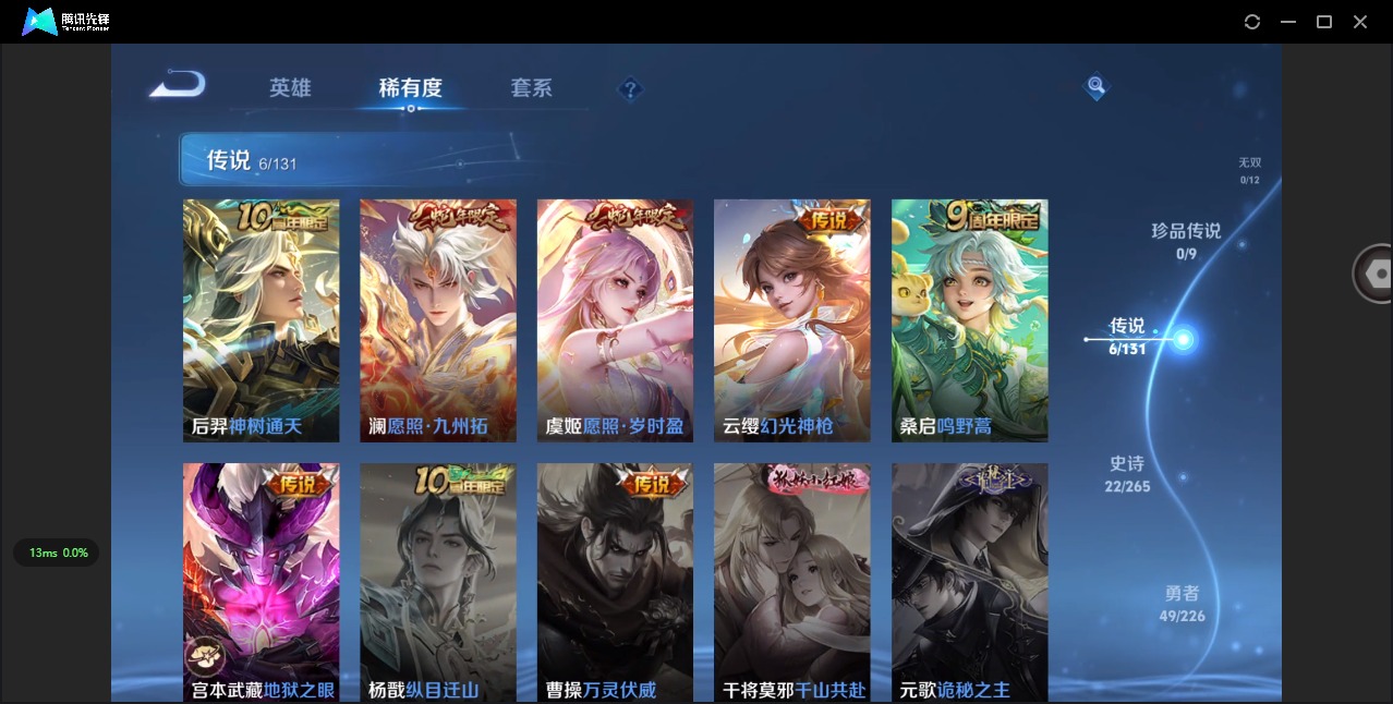 [14433529]v4 1典藏 6传说 117英雄 102皮肤 可修改实名 女号 【英雄全皮】:敖隐全皮 【稀有英雄】:敖隐小龙人大司命韩信韩跳跳夏洛特夏师傅橘右京橘子不知火舞赵云金蝉唐僧戈娅 【荣耀水晶】:无限飓风号高达 【传说皮】:神树通天幻光神呛
