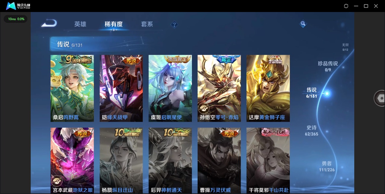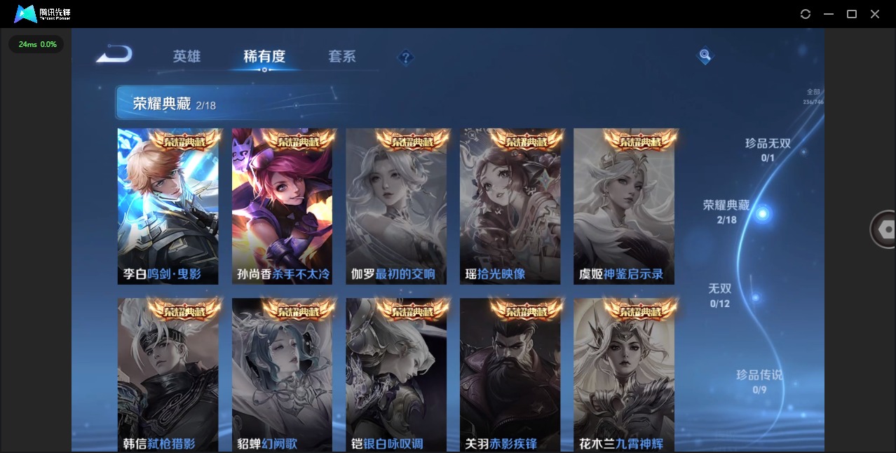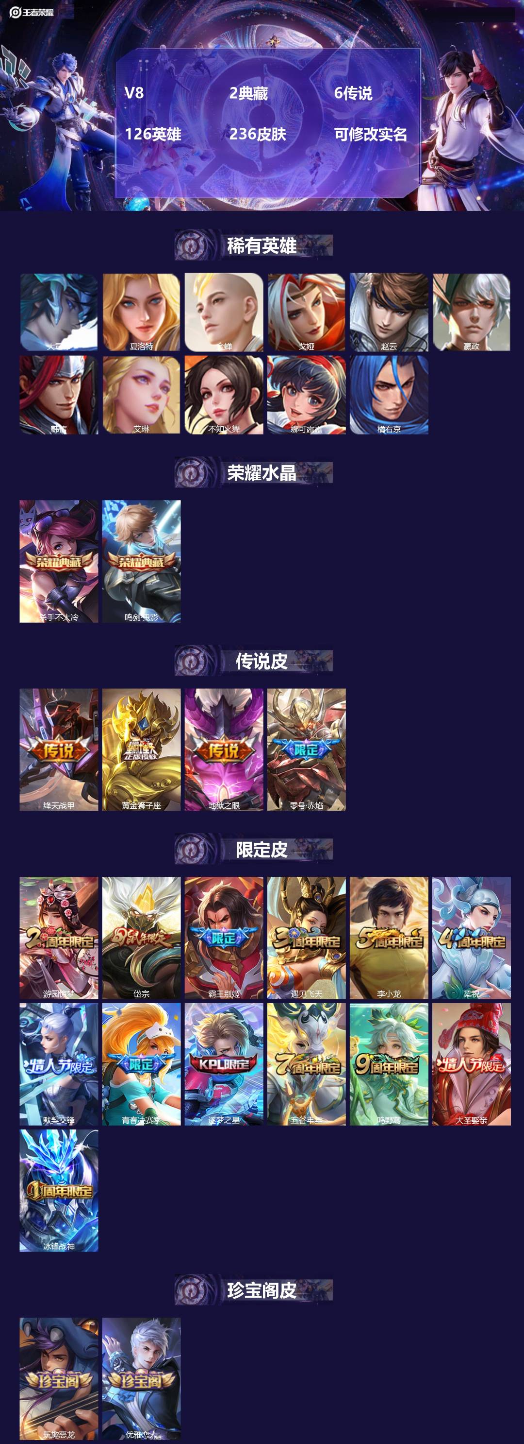 v8 2典藏 6传说 126英雄 236皮肤 可修改实名 【稀有英雄】:大司命嬴政始皇帝韩信韩跳跳夏洛特夏师傅艾琳橘右京橘子娜可露露鸟人不知火舞赵云金蝉唐僧戈娅 【荣耀水晶】:鸣剑·曳影杀手不太冷 【传说皮】:黄金狮子座零号·赤焰地狱之眼绛天战甲