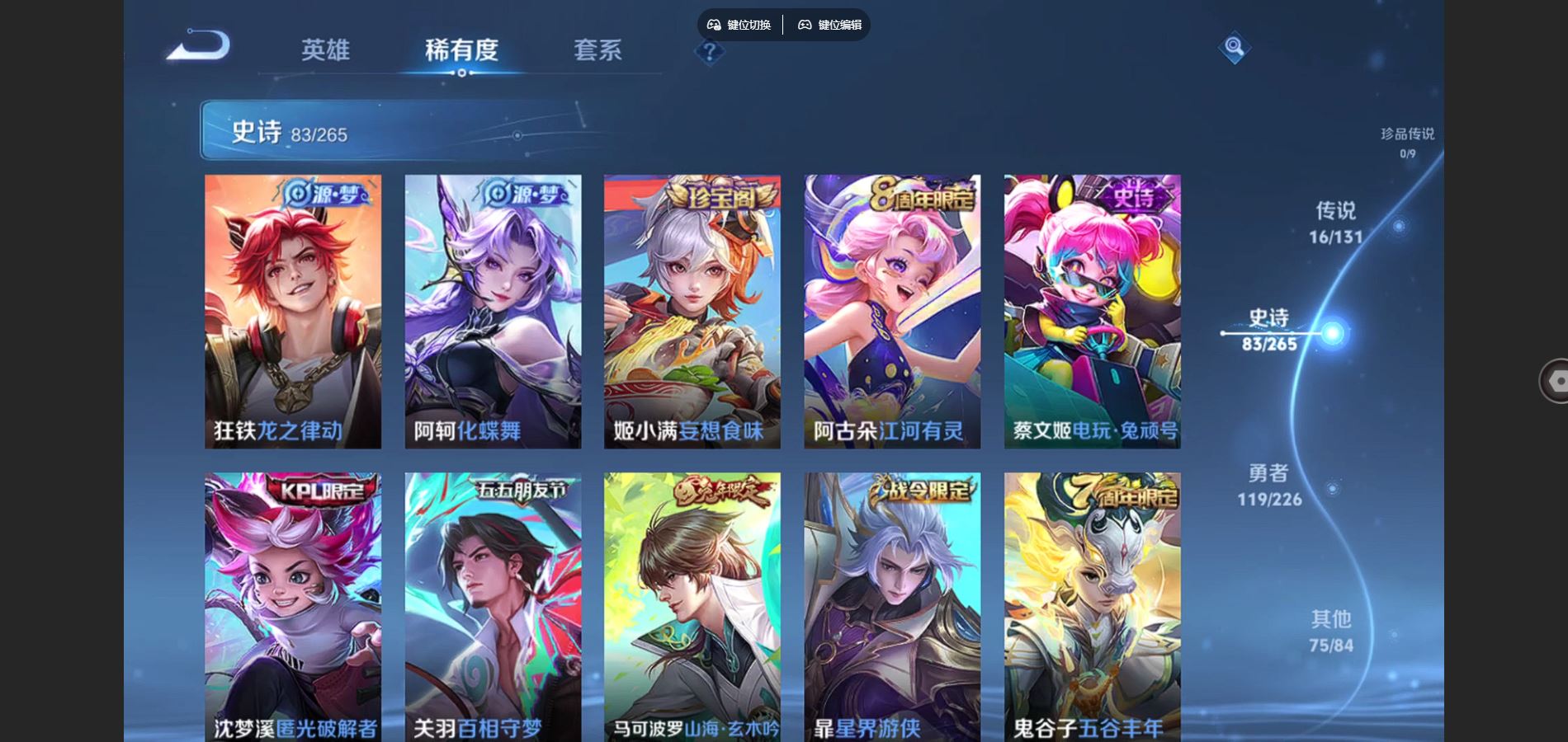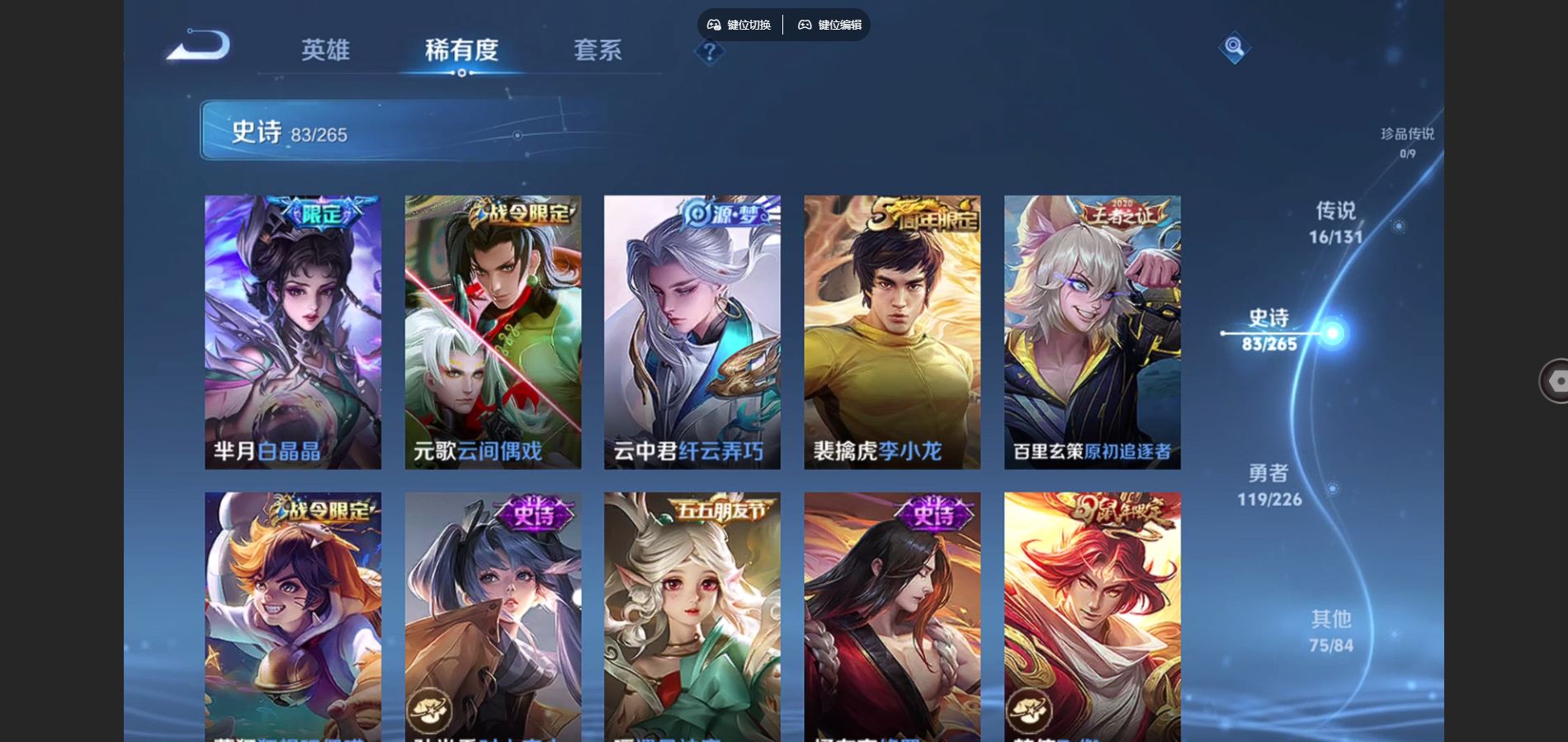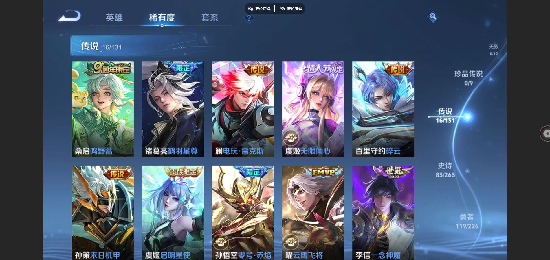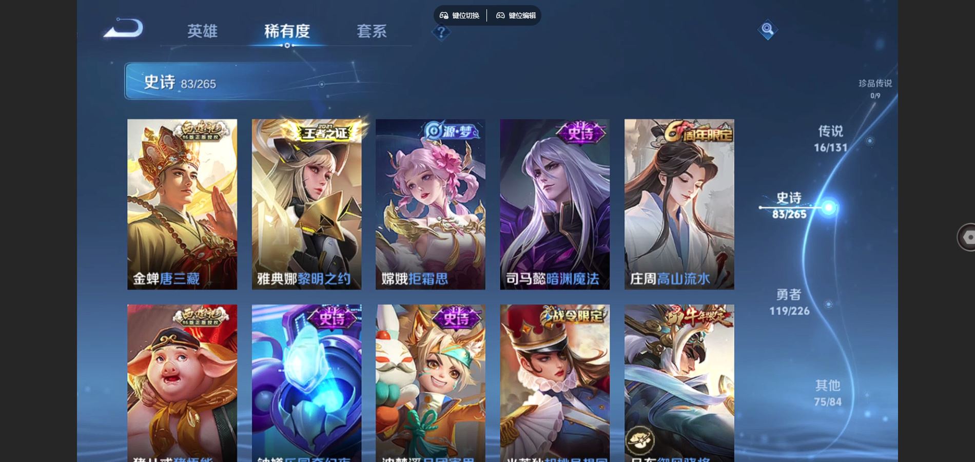 125英雄-295皮肤-v8-295皮肤2典藏16传说 1星传说 幽冥之眼【典藏】 全息碎影 九霄神辉 【传说】 鸣野蒿 鹤羽星尊 启明星使 零号赤焰 无限倾心女 电玩雷克斯 碎云 地狱火 云鹰飞将 猫影幻舞 一念神魔 云霓雀翎 黄金射手座 地狱之眼 末日机甲女 末日机甲策 【热门】青龙志 朱雀志 御风骁将 山海玄木吟 飞衡 天狼征服者 霸王别姬女 霸王别姬男 白晶晶 凤凰于飞 唐三藏 拒霜思 猪悟能
