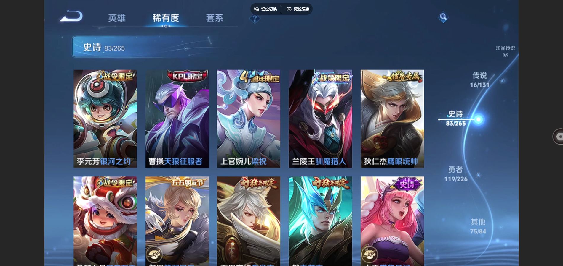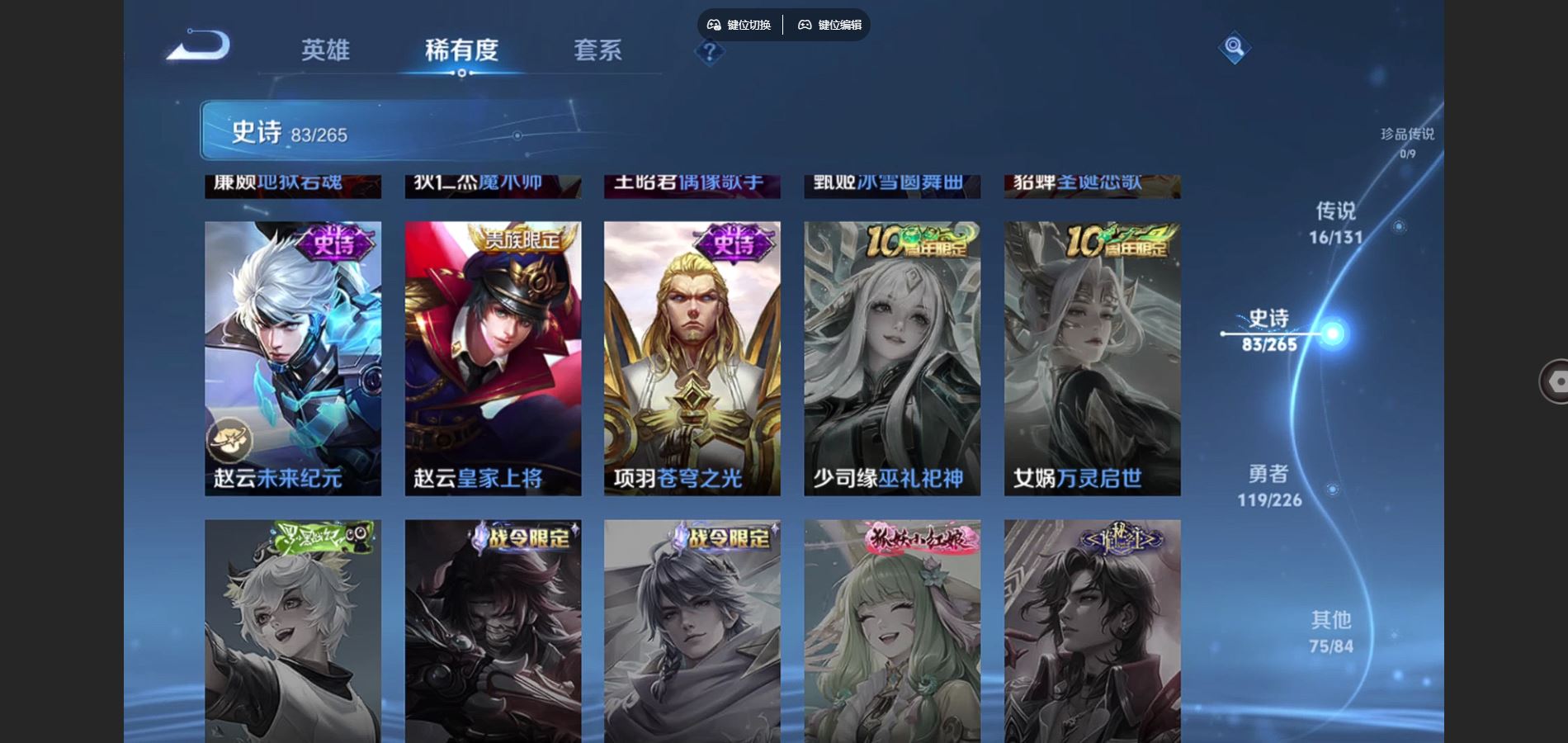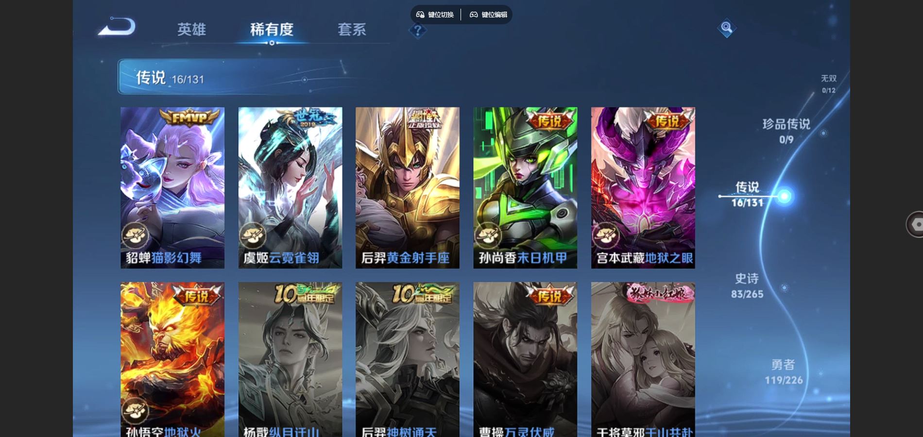 125英雄-295皮肤-v8-295皮肤2典藏16传说 1星传说 幽冥之眼【典藏】 全息碎影 九霄神辉 【传说】 鸣野蒿 鹤羽星尊 启明星使 零号赤焰 无限倾心女 电玩雷克斯 碎云 地狱火 云鹰飞将 猫影幻舞 一念神魔 云霓雀翎 黄金射手座 地狱之眼 末日机甲女 末日机甲策 【热门】青龙志 朱雀志 御风骁将 山海玄木吟 飞衡 天狼征服者 霸王别姬女 霸王别姬男 白晶晶 凤凰于飞 唐三藏 拒霜思 猪悟能