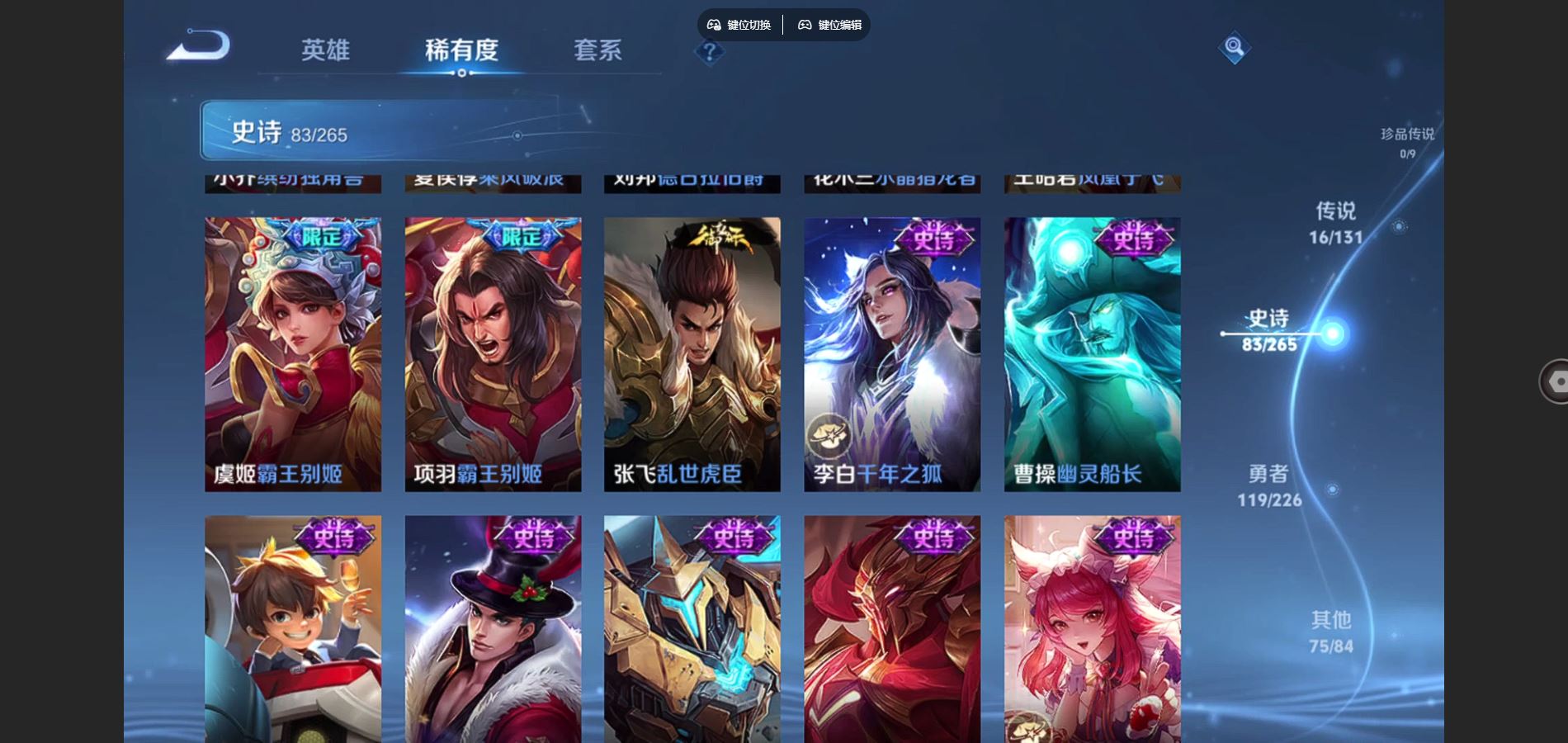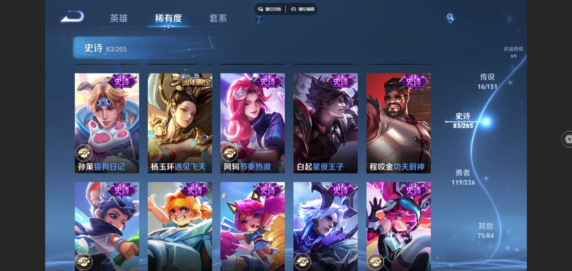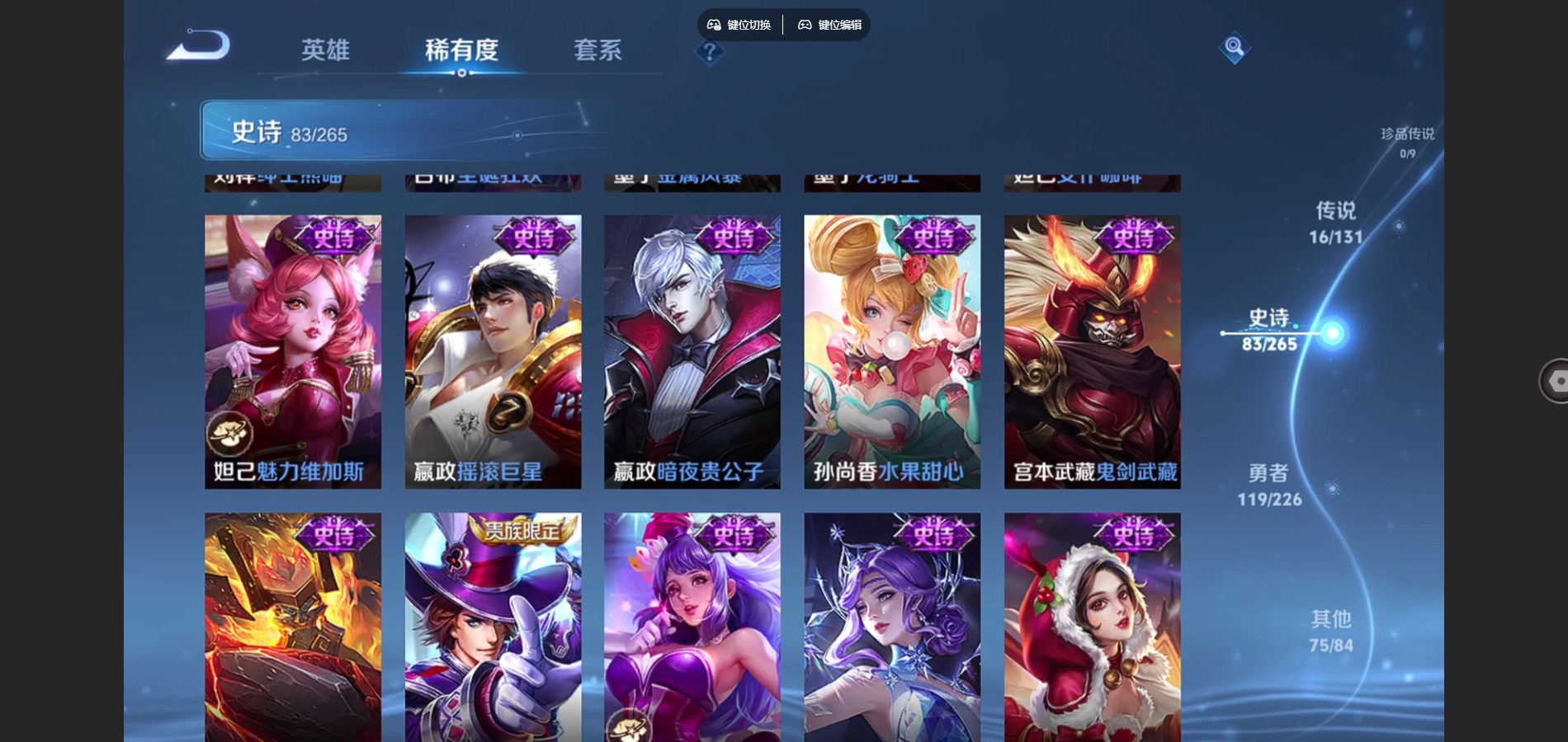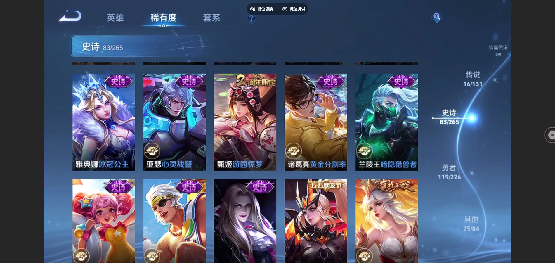 125英雄-295皮肤-v8-295皮肤2典藏16传说 1星传说 幽冥之眼【典藏】 全息碎影 九霄神辉 【传说】 鸣野蒿 鹤羽星尊 启明星使 零号赤焰 无限倾心女 电玩雷克斯 碎云 地狱火 云鹰飞将 猫影幻舞 一念神魔 云霓雀翎 黄金射手座 地狱之眼 末日机甲女 末日机甲策 【热门】青龙志 朱雀志 御风骁将 山海玄木吟 飞衡 天狼征服者 霸王别姬女 霸王别姬男 白晶晶 凤凰于飞 唐三藏 拒霜思 猪悟能
