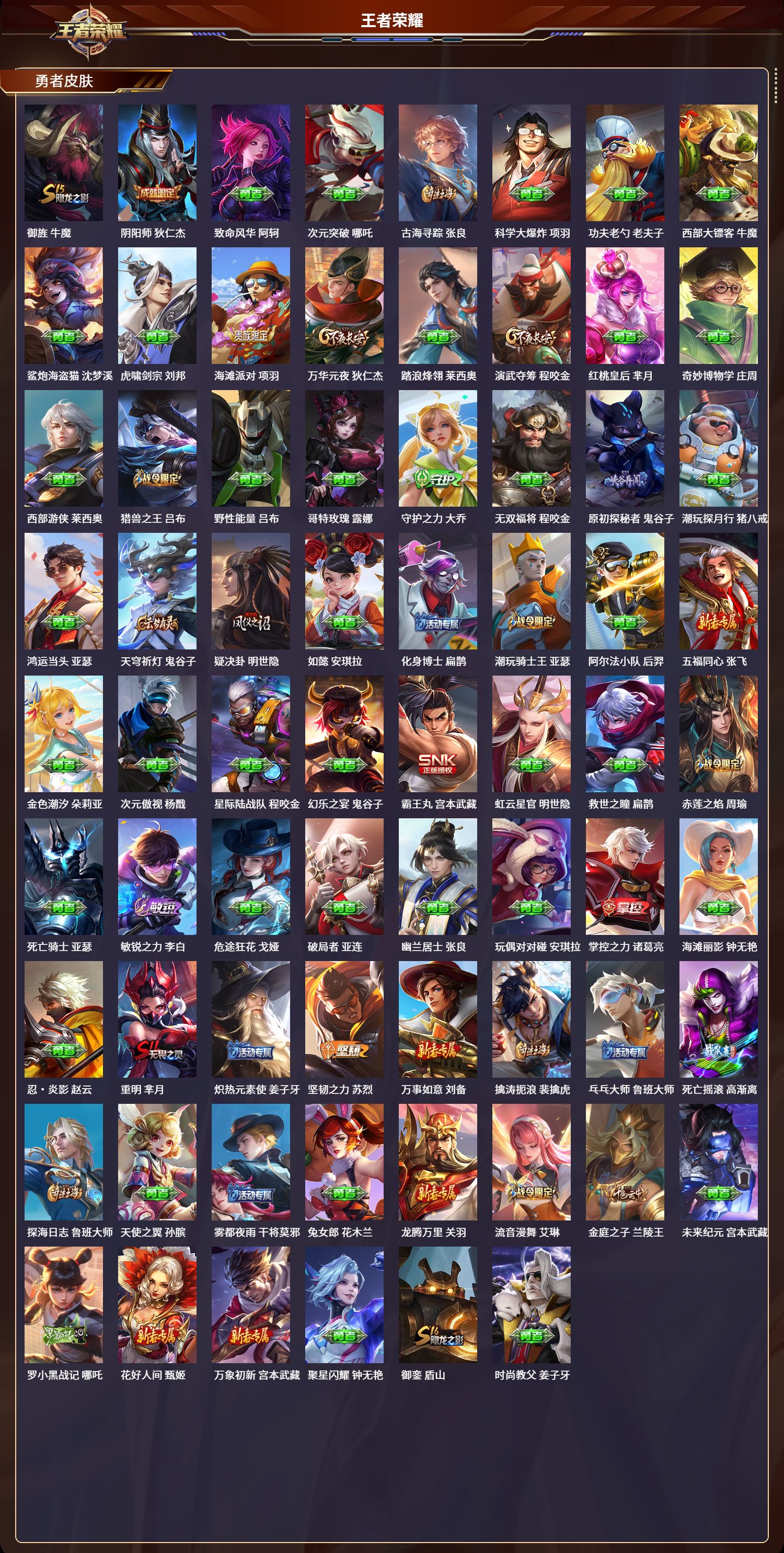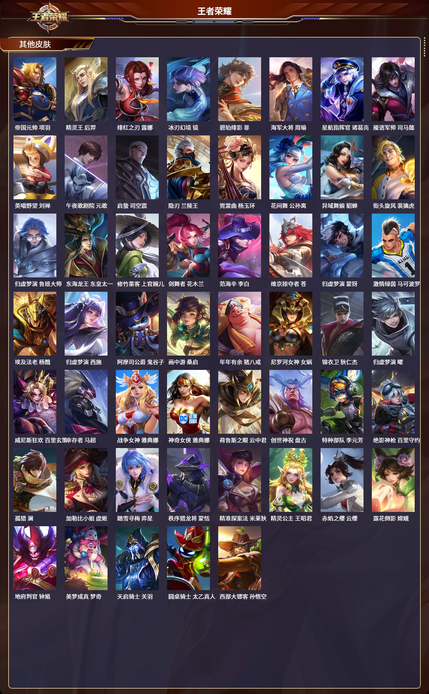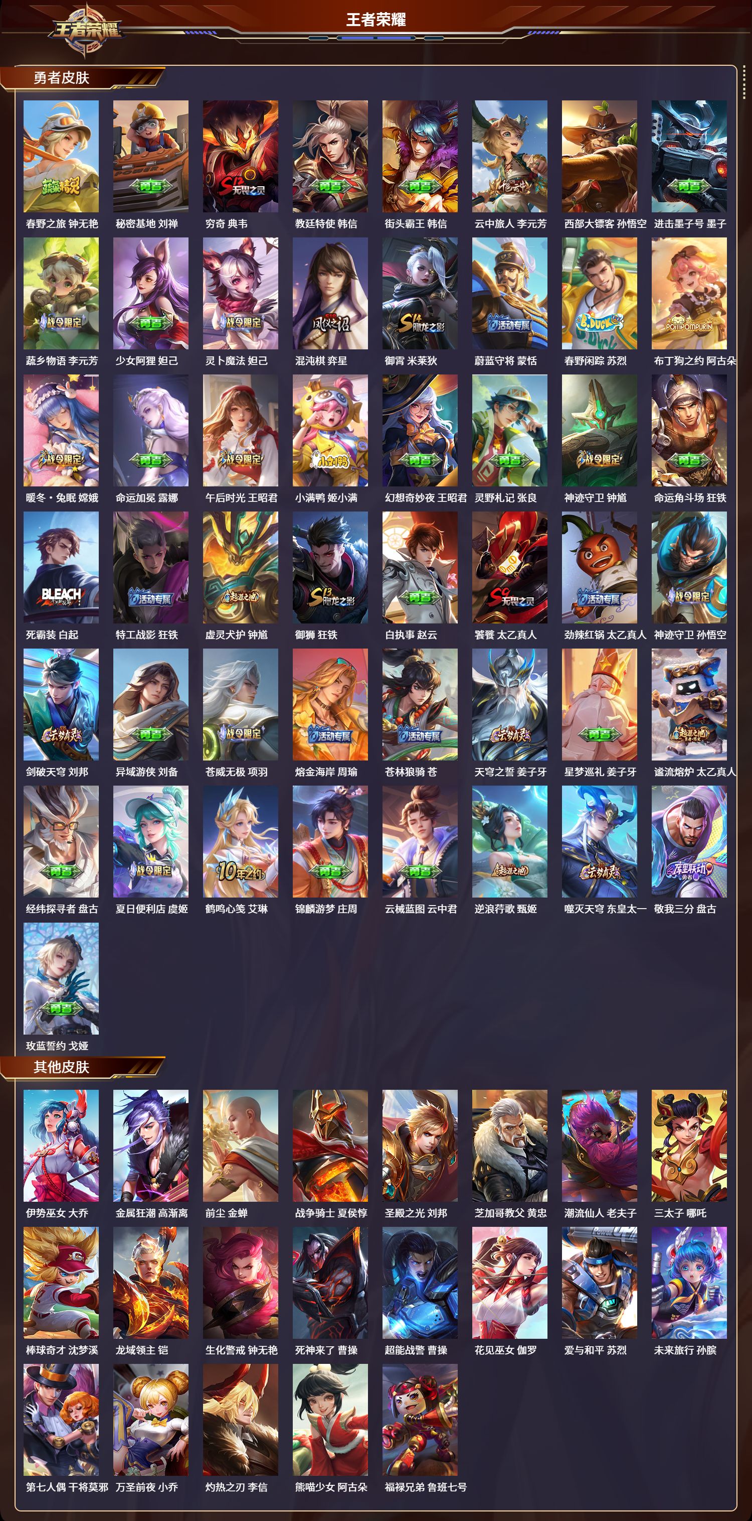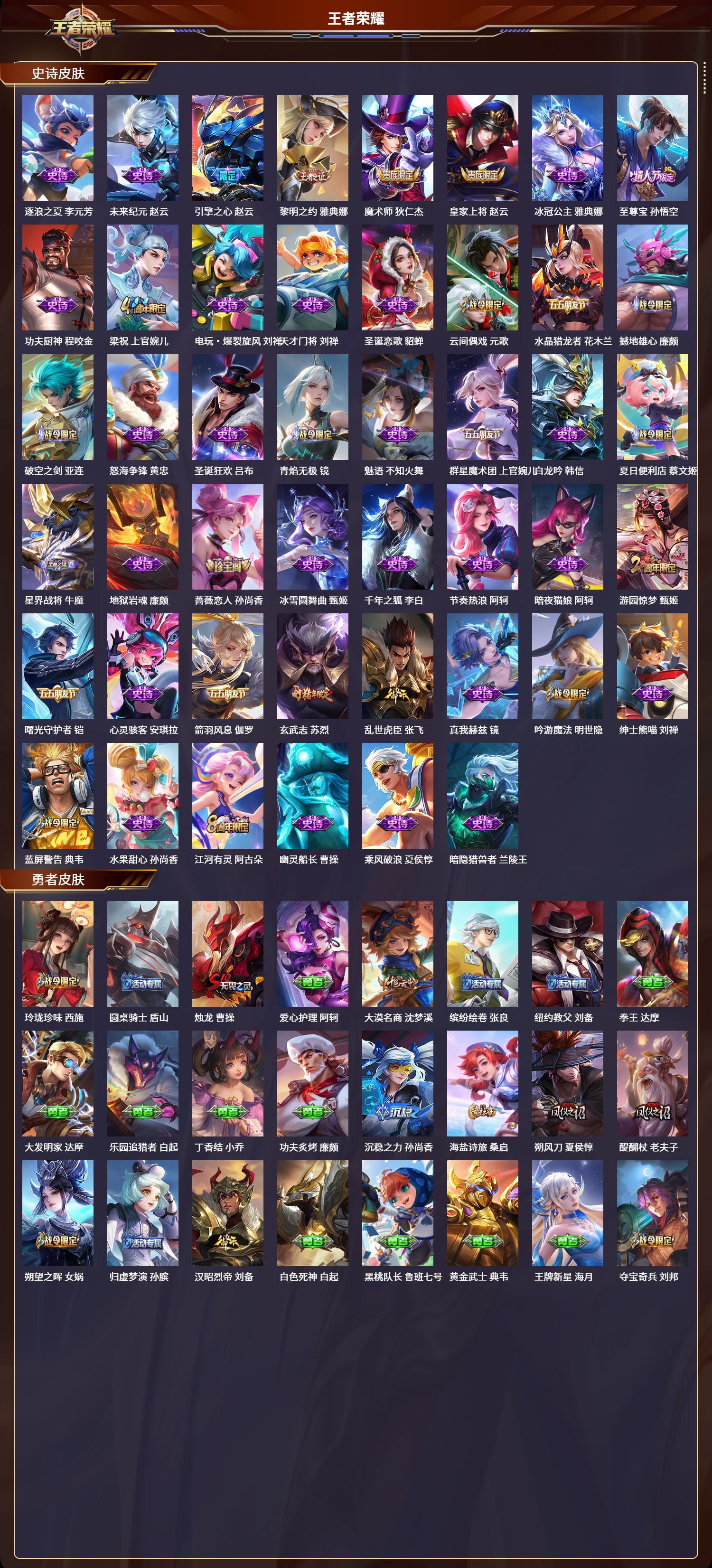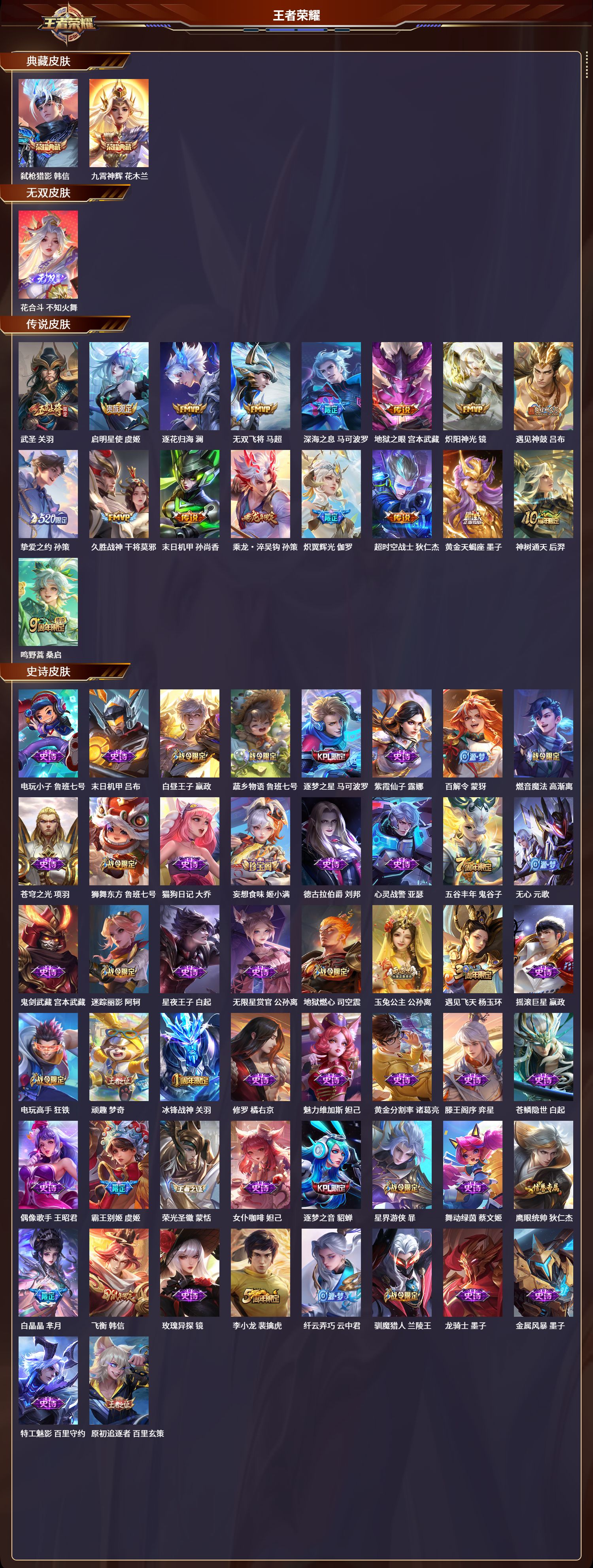 苹果qq/至尊星耀/333皮肤/125英雄/2典藏/0珍品无双/1无双/0珍品传说/17传说/96史诗/9稀有英雄【2 典藏皮肤】弑呛猎影 韩信九霄神辉 花木兰【1 无双皮肤】花合斗 不知火舞【17 传说皮肤】武圣 关羽启明星使 虞姬逐花归海 澜无双飞将 马超深海之息 马可波罗地狱之眼 宫本武藏炽阳神光 镜遇见神鼓 吕布挚爱之约 孙策久胜战神 干将莫邪