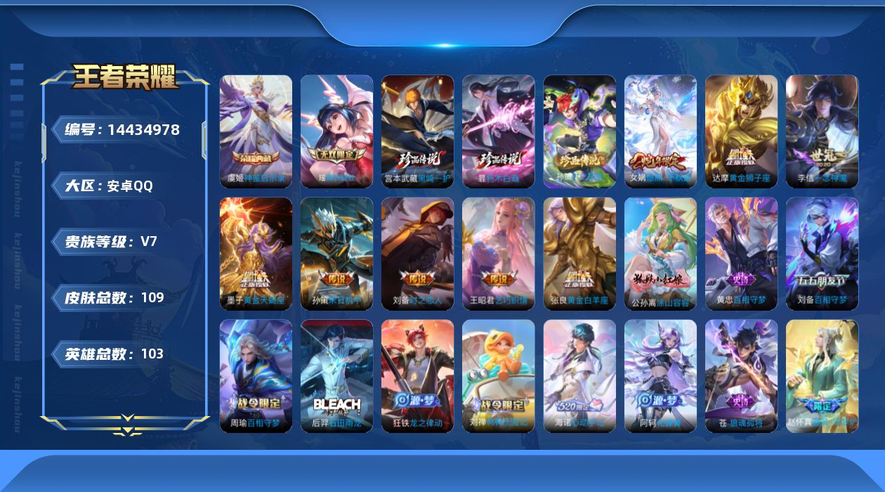 [14434978]贵族8-109皮-1典藏-9传说-1无双-3珍品传说-2个英雄全皮肤-改名卡1 安卓手q490区109皮1典藏9传说1无双3珍品传说v7 营地id1798437146永恒钻石ii【珍品传说皮肤】:朽木白哉黑崎一护时之奇旅【无双皮肤】:瑶真我赫兹【荣耀典藏】:神鉴启示录【传说皮肤】:黄金狮子座千山共赴黄金白羊座末日机甲乞巧织情愿照·千秋盛时之恋人一念神魔黄金