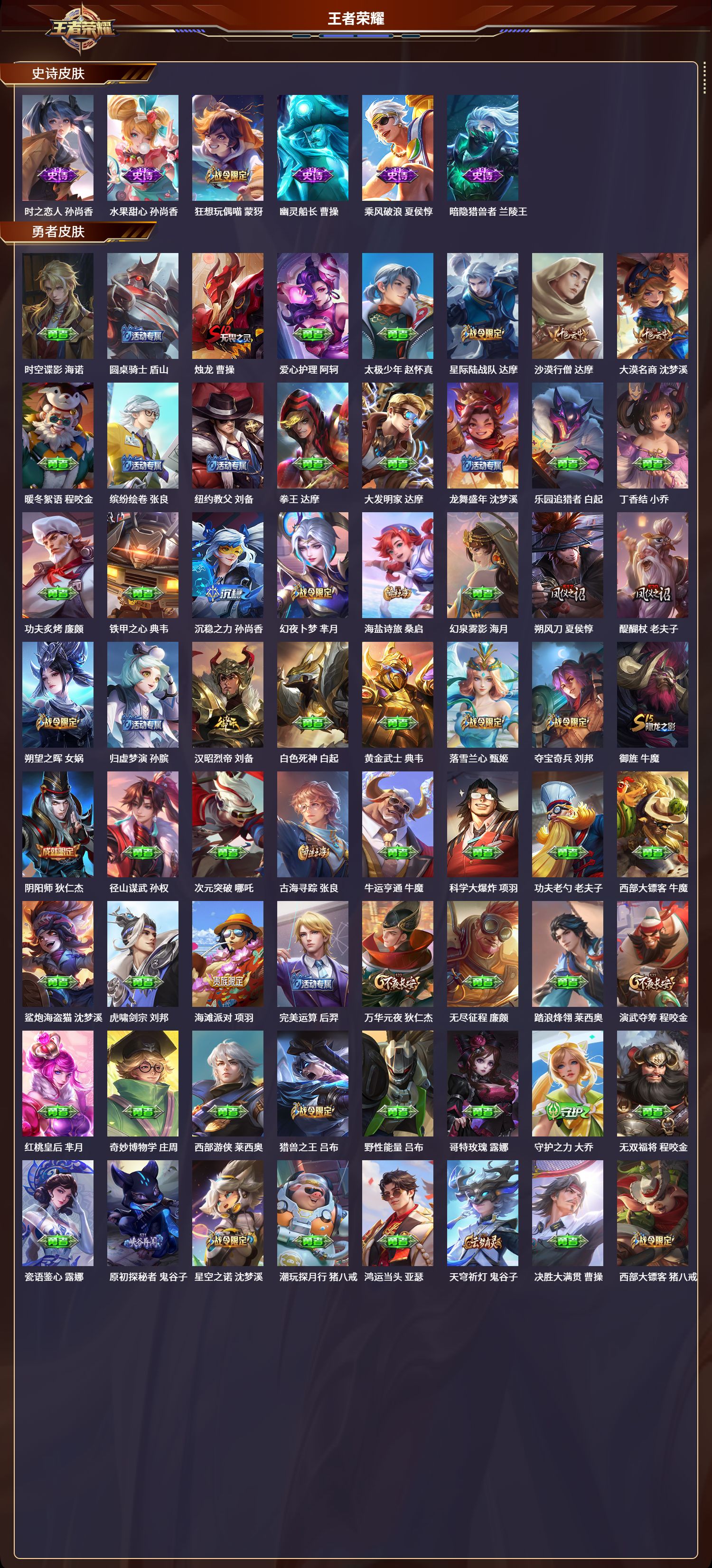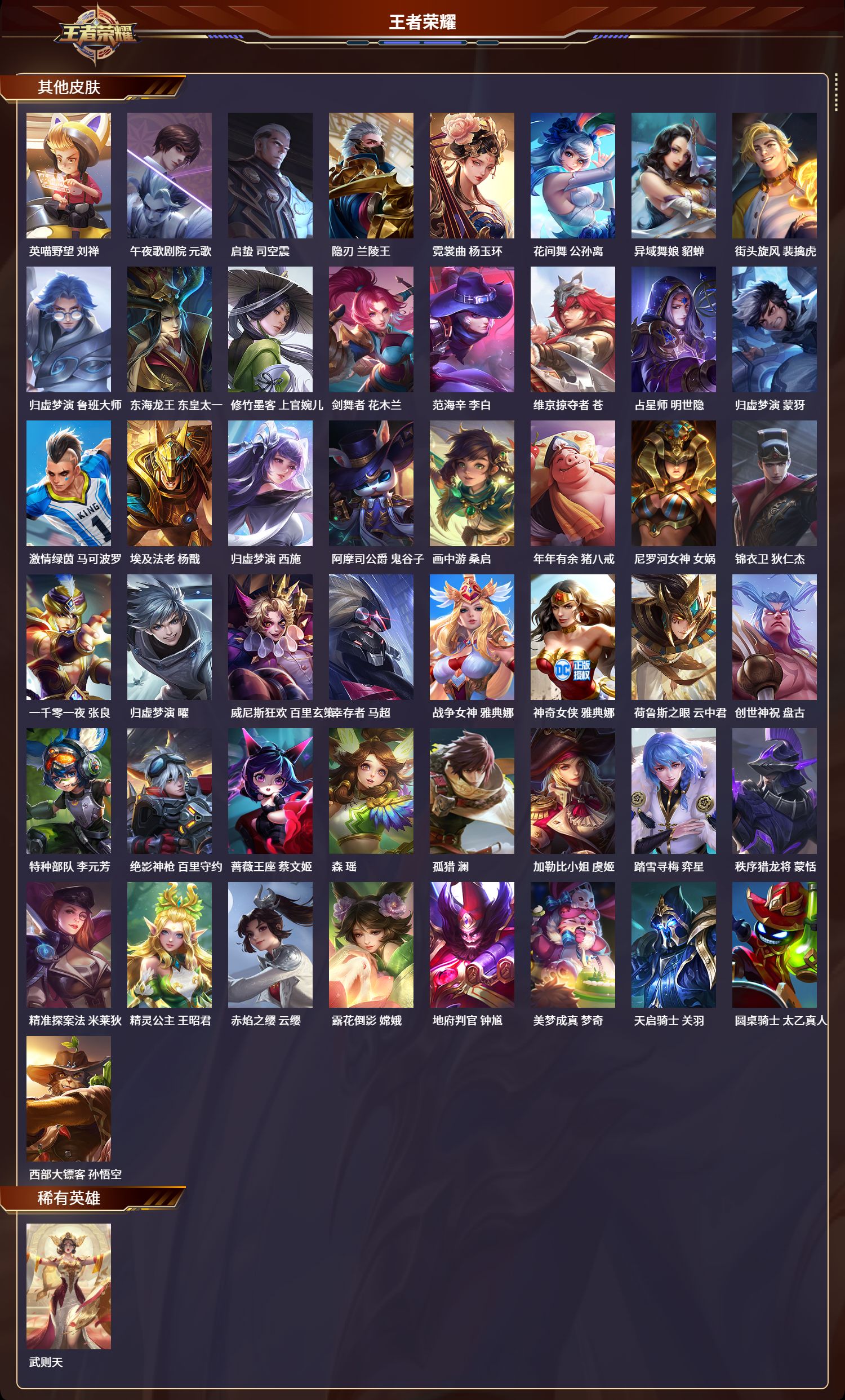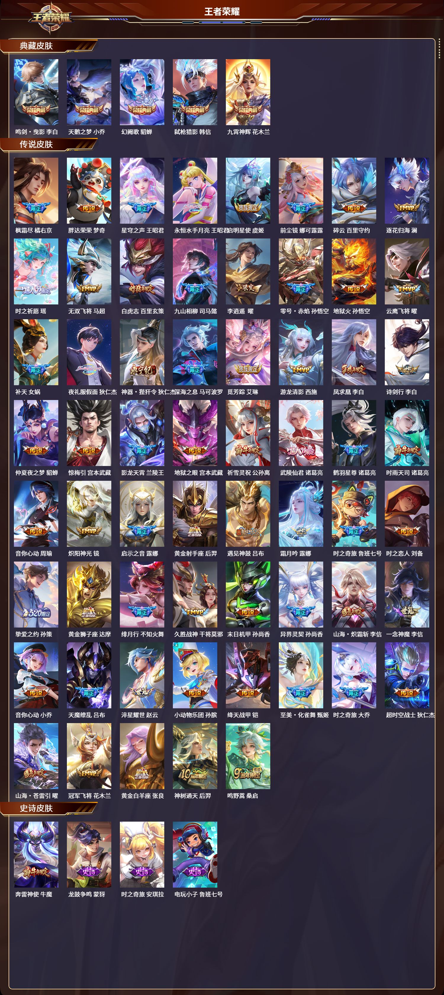 安卓qq/至尊星耀/469皮肤/125英雄/5典藏/0珍品无双/0无双/0珍品传说/61传说/150史诗/9稀有英雄【5 典藏皮肤】鸣剑·曳影 李白天鹅之梦 小乔幻阙歌 貂蝉弑呛猎影 韩信九霄神辉 花木兰【61 传说皮肤】枫霜尽 橘右京胖达荣荣 梦奇星穹之声 王昭君永恒水手月亮 王昭君启明星使 虞姬前尘镜 娜可露露碎云 百里守约逐花归海 澜时之祈愿 瑶