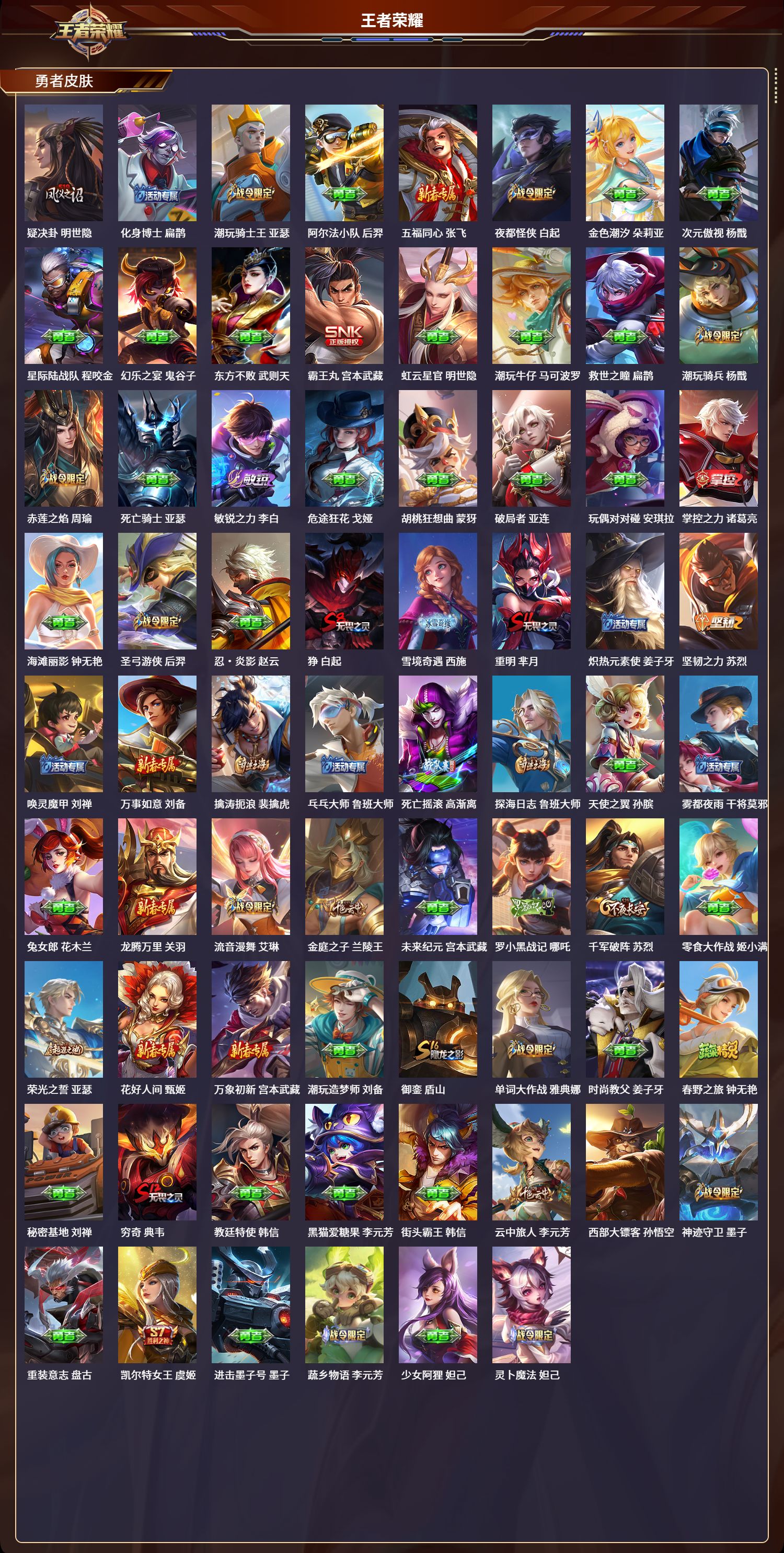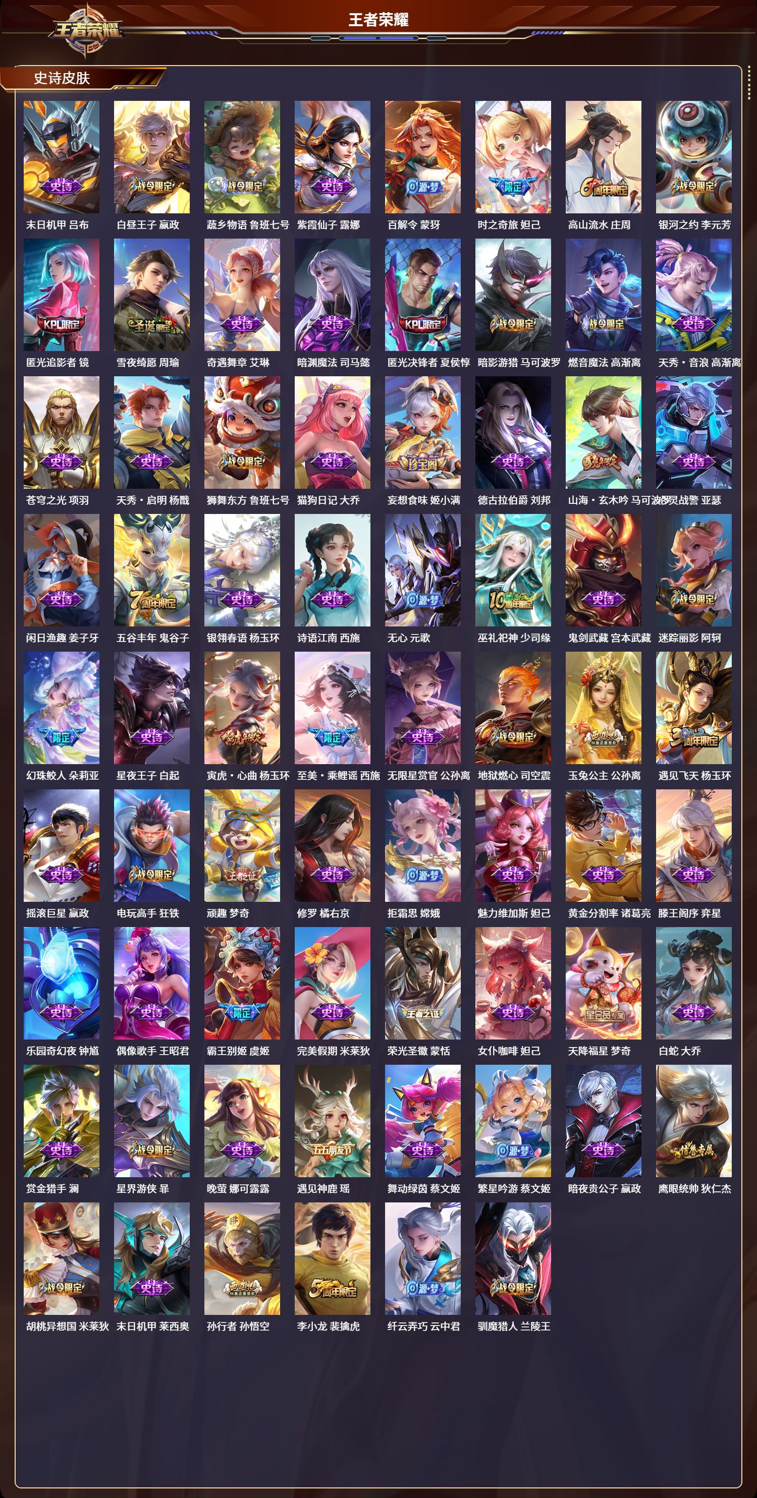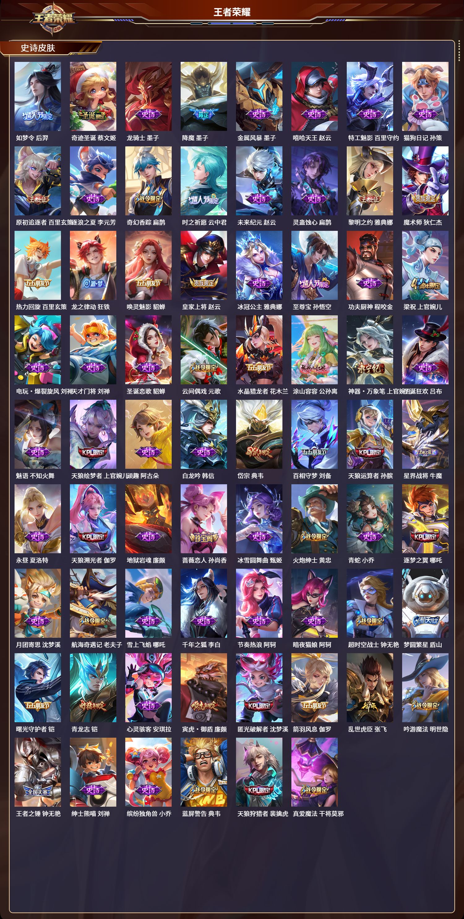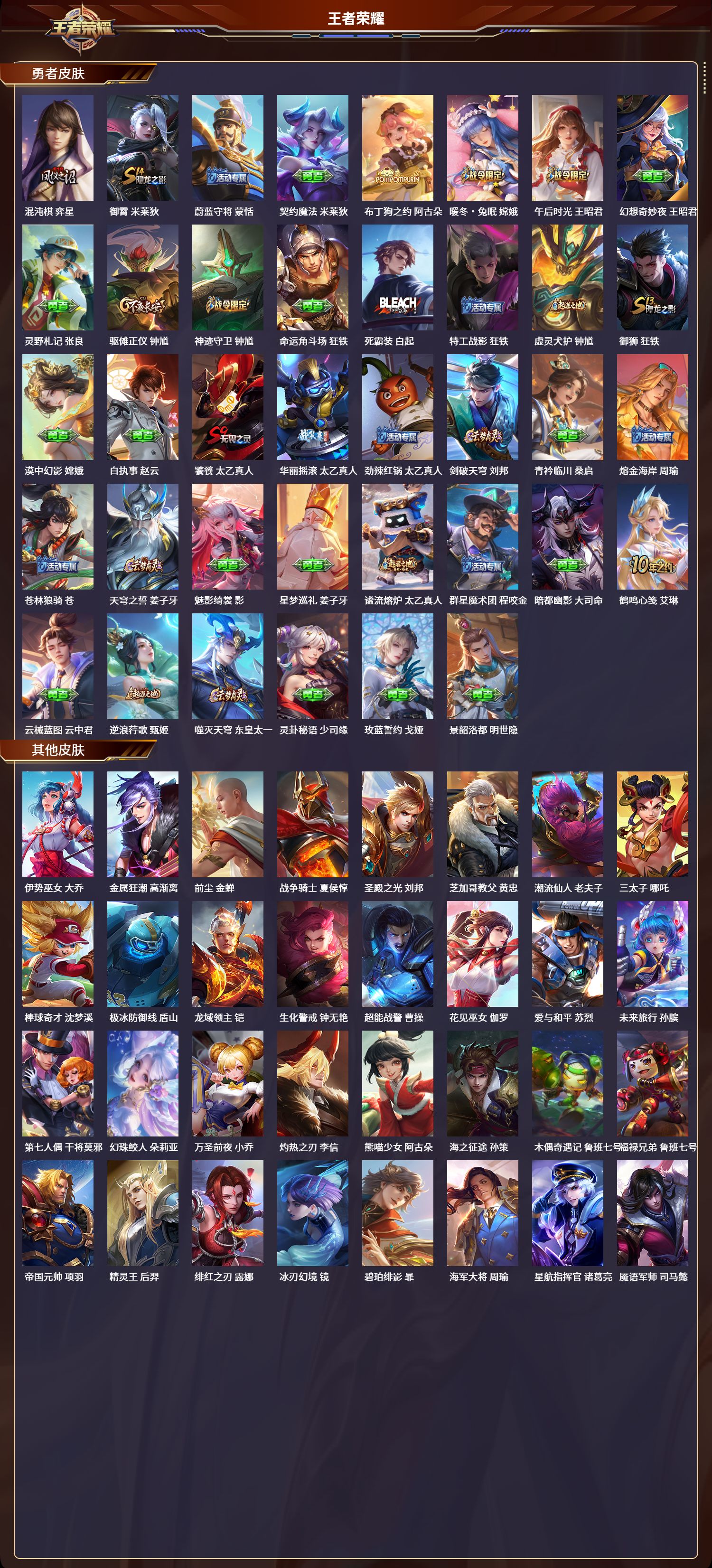 安卓qq/至尊星耀/469皮肤/125英雄/5典藏/0珍品无双/0无双/0珍品传说/61传说/150史诗/9稀有英雄【5 典藏皮肤】鸣剑·曳影 李白天鹅之梦 小乔幻阙歌 貂蝉弑呛猎影 韩信九霄神辉 花木兰【61 传说皮肤】枫霜尽 橘右京胖达荣荣 梦奇星穹之声 王昭君永恒水手月亮 王昭君启明星使 虞姬前尘镜 娜可露露碎云 百里守约逐花归海 澜时之祈愿 瑶