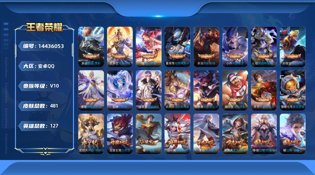 [14436053]贵族10 流光积分2261 王者36星 贵族积分503134 安卓手q510区481皮16典藏61传说1无双v10 营地id367394982绝世王者【无双皮肤】:神器·明辉仪【荣耀典藏】:拾光映像神鉴启示录幻阙歌银白咏叹调赤影疾锋九霄神辉星域神启鸣剑·曳影活力突击倪克斯神谕杀手不太冷无限飓风号大秦宣太后全息碎影天鹅之梦星空梦想【