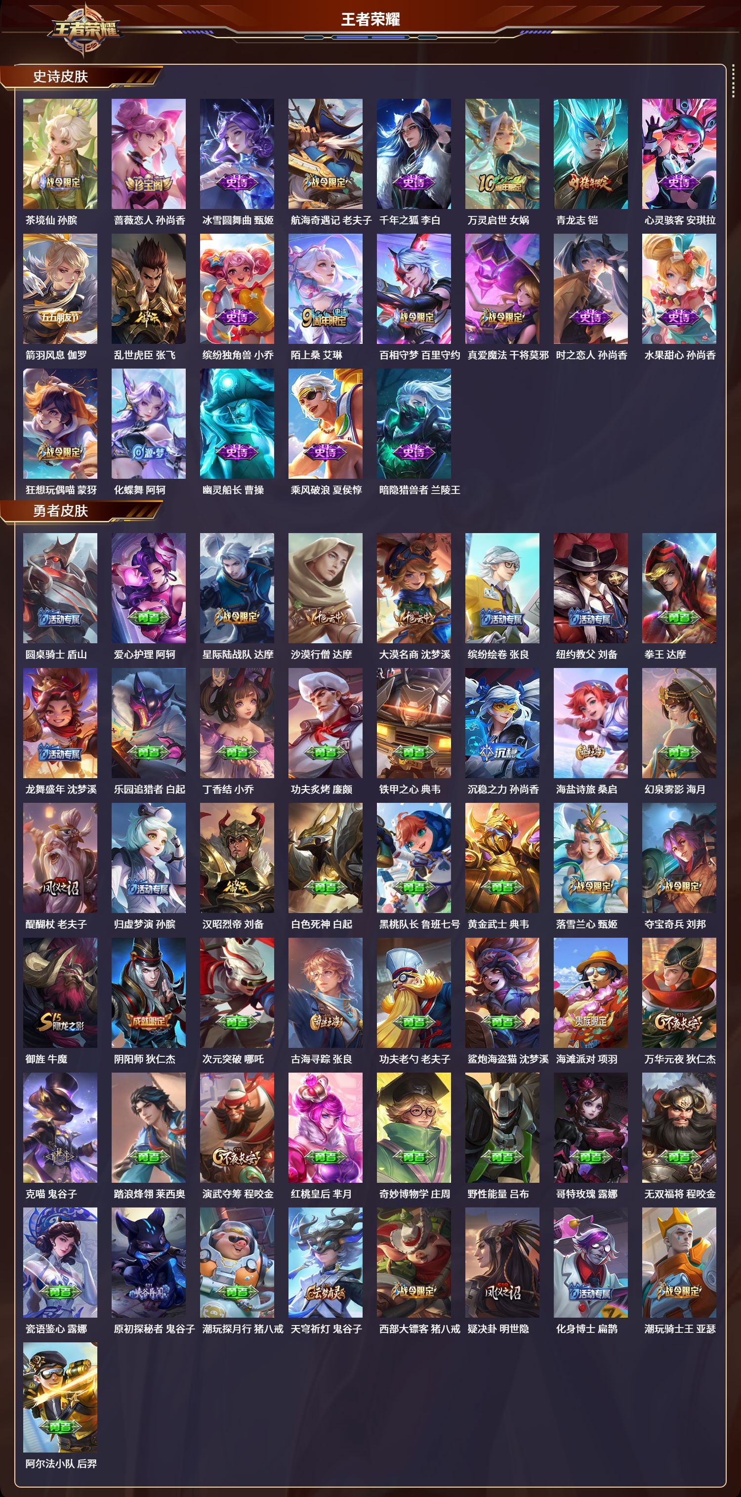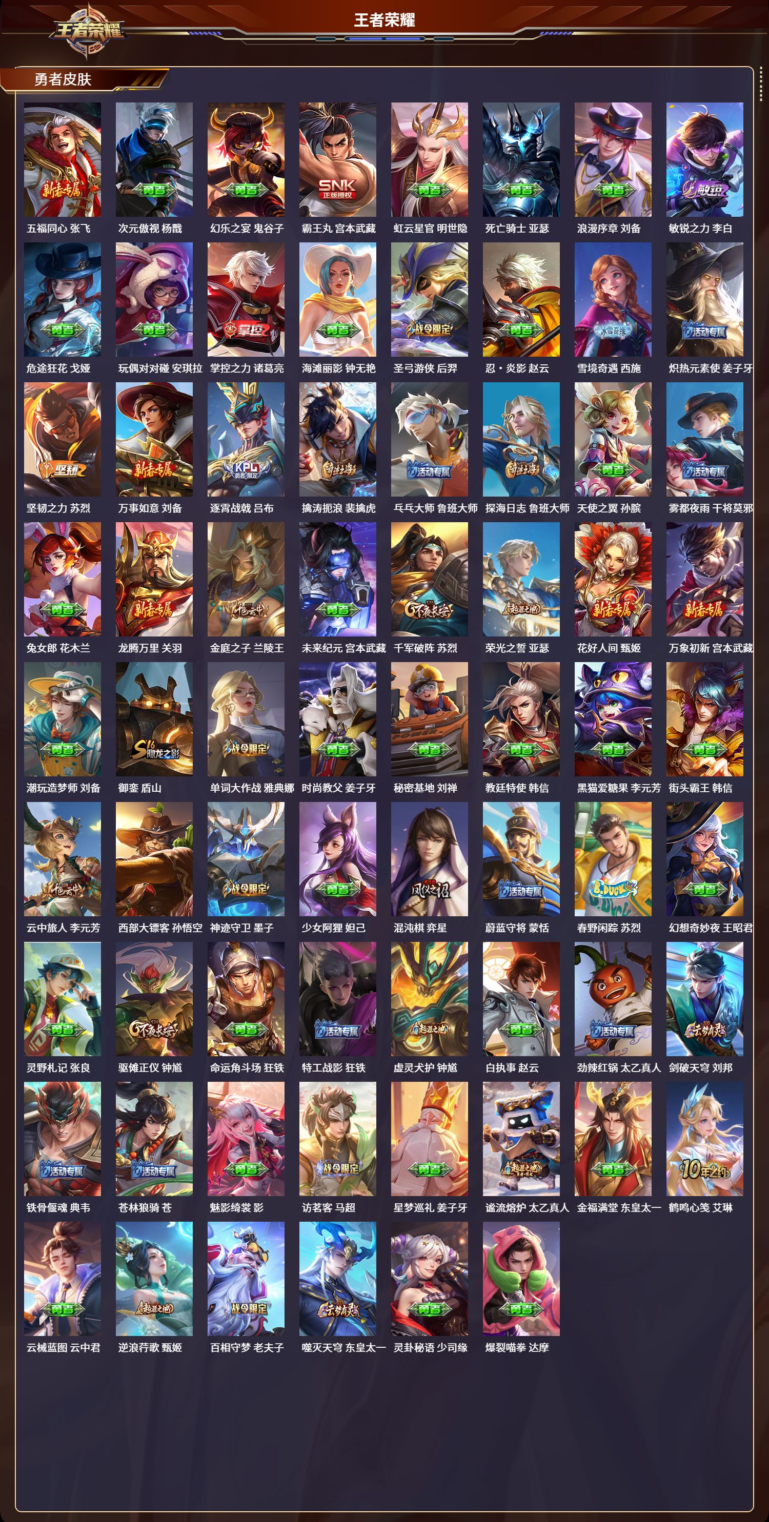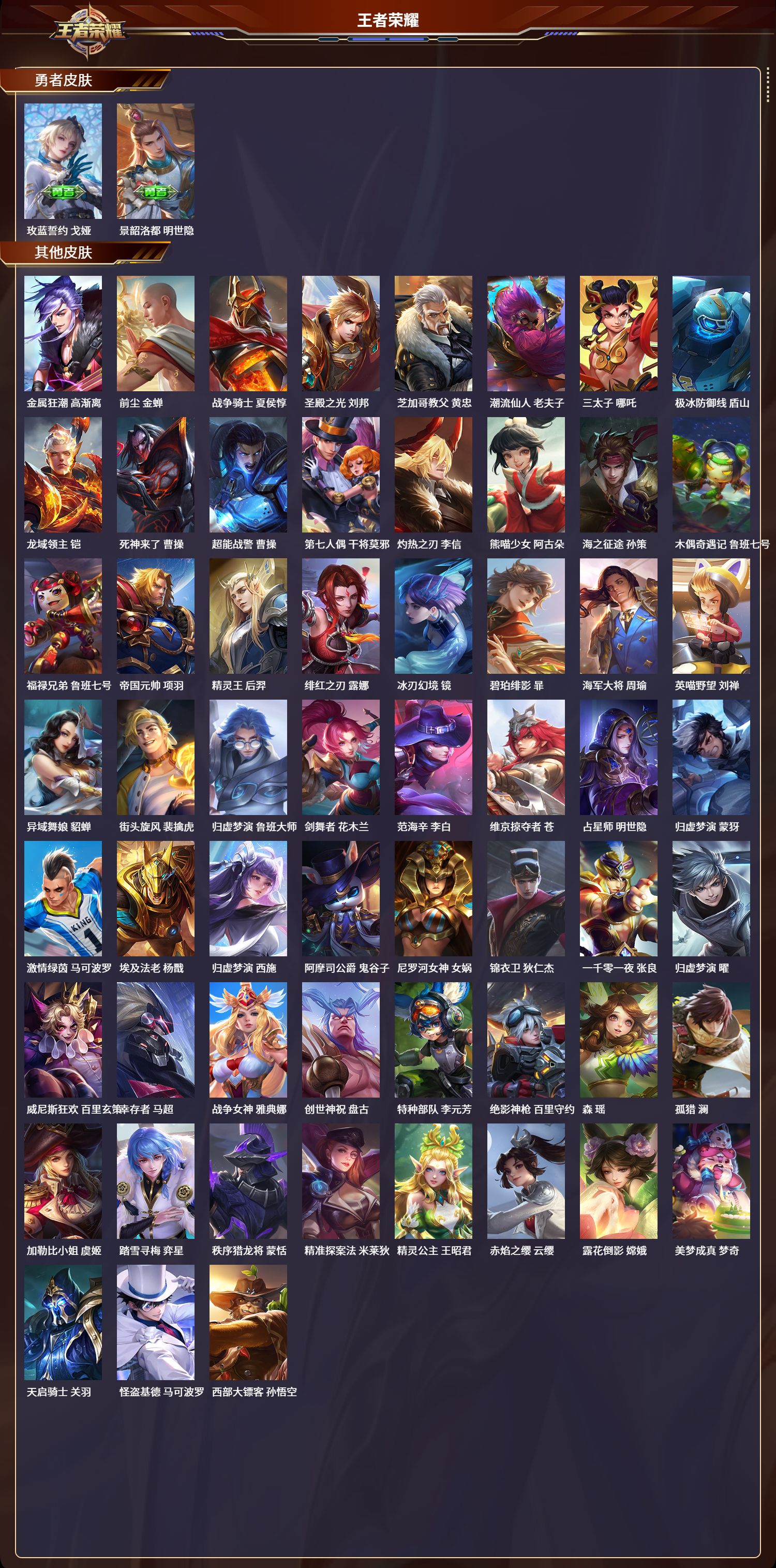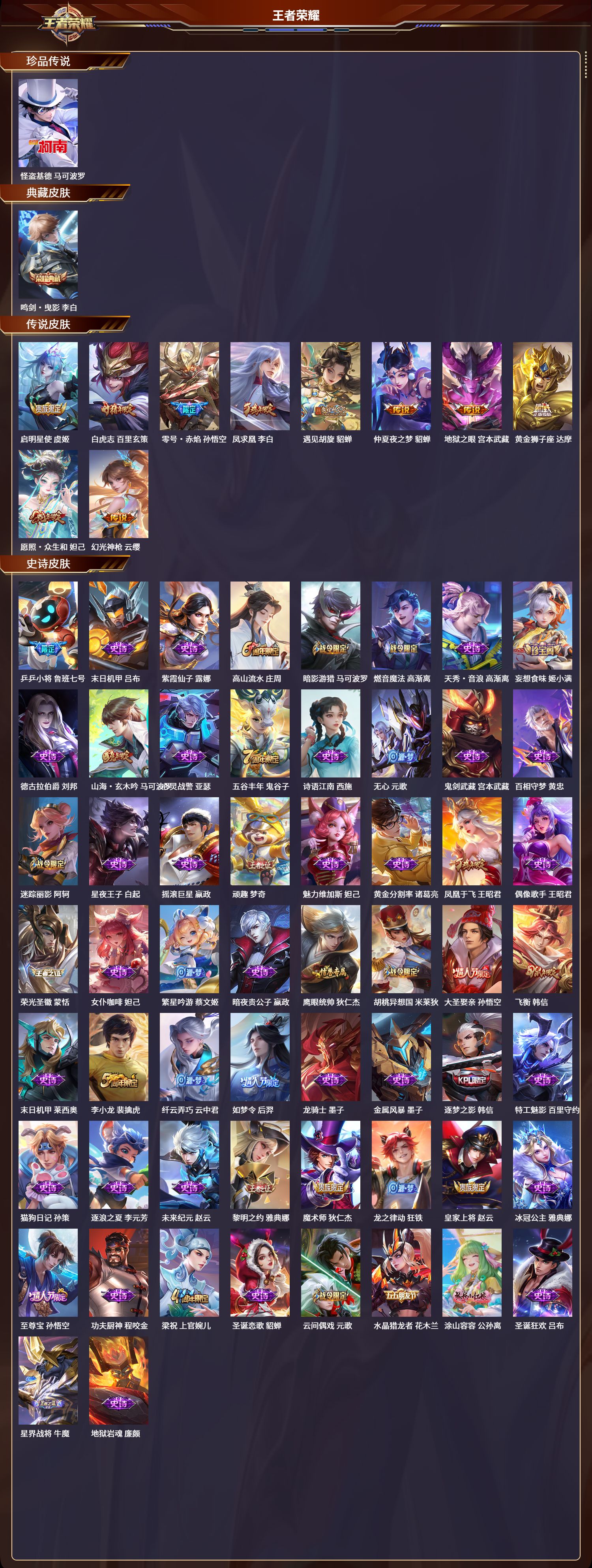 苹果qq/至圣王者/269皮肤/125英雄/1典藏/0珍品无双/0无双/1珍品传说/10传说/79史诗/9稀有英雄【1 珍品传说】怪盗基德 马可波罗【1 典藏皮肤】鸣剑·曳影 李白【10 传说皮肤】启明星使 虞姬白虎志 百里玄策零号·赤焰 孙悟空凤求凰 李白遇见胡旋 貂蝉仲夏夜之梦 貂蝉地狱之眼 宫本武藏黄金狮子座 达摩愿照·众生和 妲己幻光神呛 云缨【