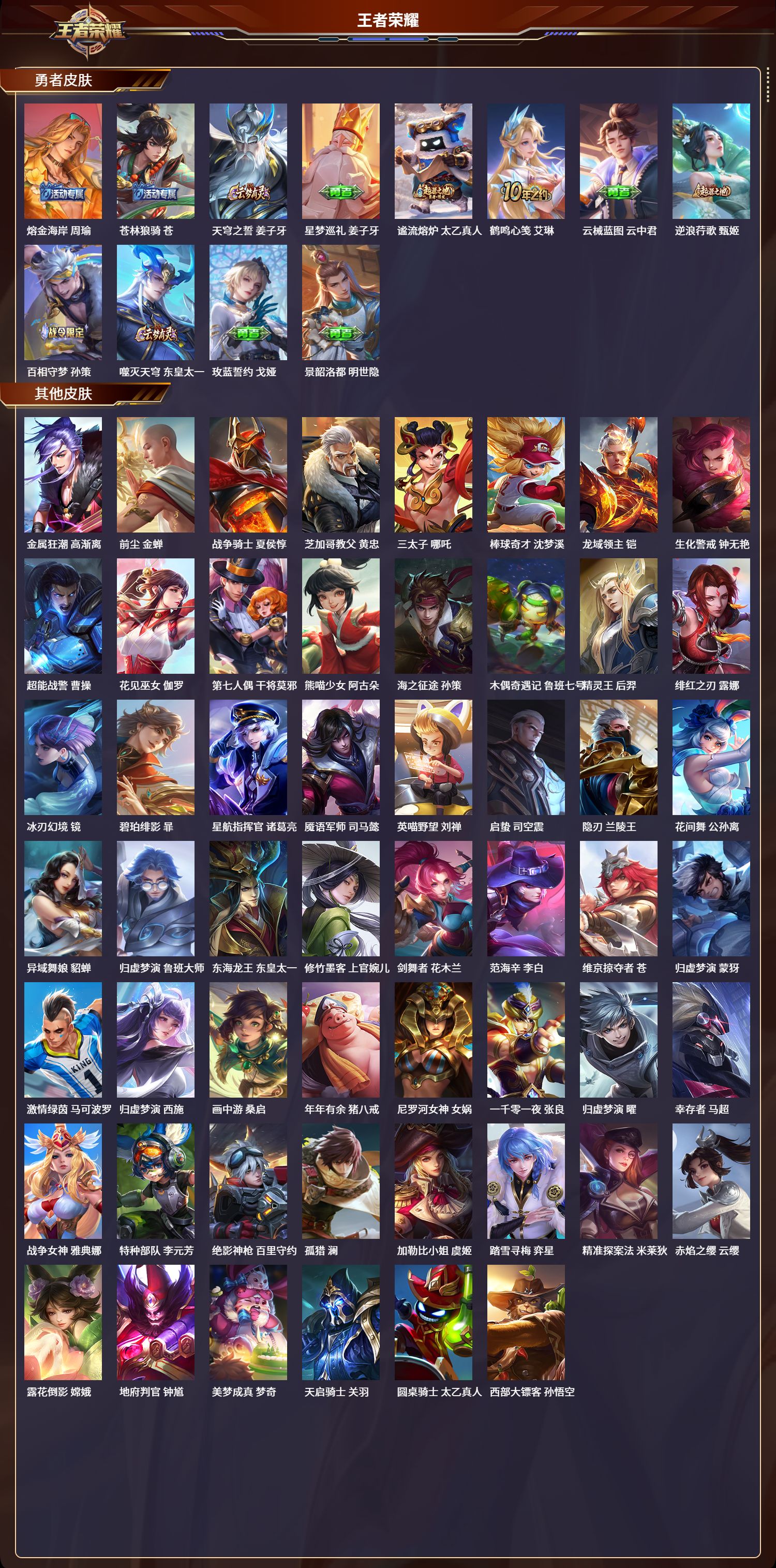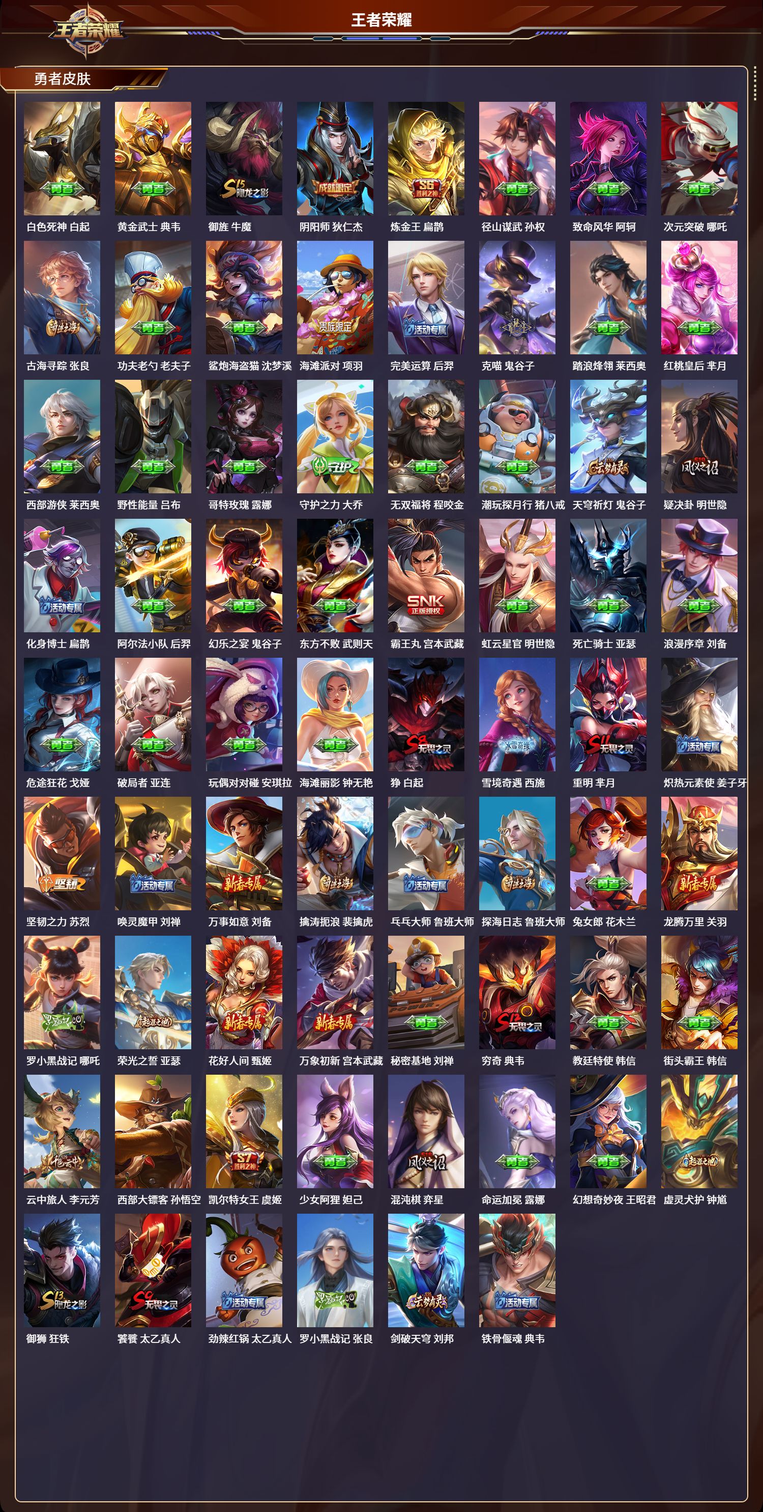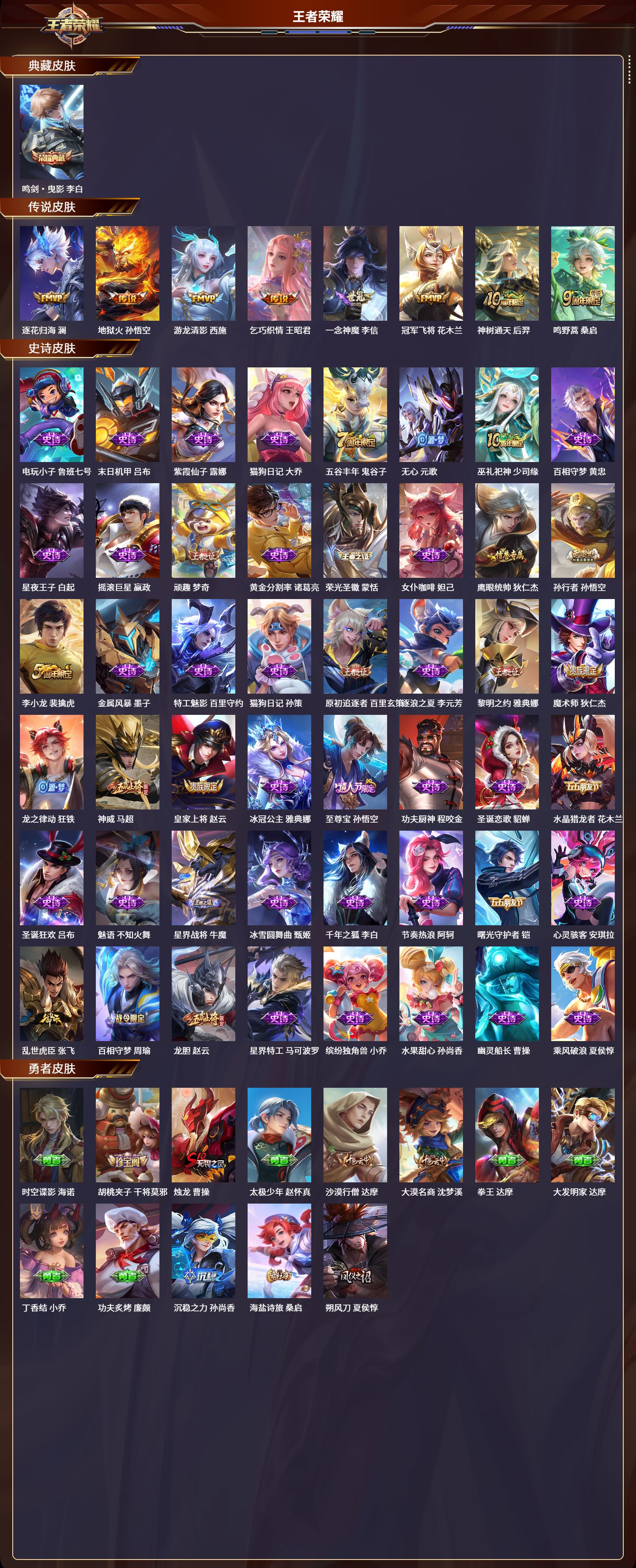 安卓qq/传奇王者/205皮肤/124英雄/1典藏/0珍品无双/0无双/0珍品传说/8传说/48史诗/8稀有英雄【1 典藏皮肤】鸣剑·曳影 李白【8 传说皮肤】逐花归海 澜地狱火 孙悟空游龙清影 西施乞巧织情 王昭君一念神魔 李信冠军飞将 花木兰神树通天 后羿鸣野蒿 桑启【48 史诗皮肤】电玩小子 鲁班七号末日机甲 吕布紫霞仙子 露娜猫狗日记 大乔五谷