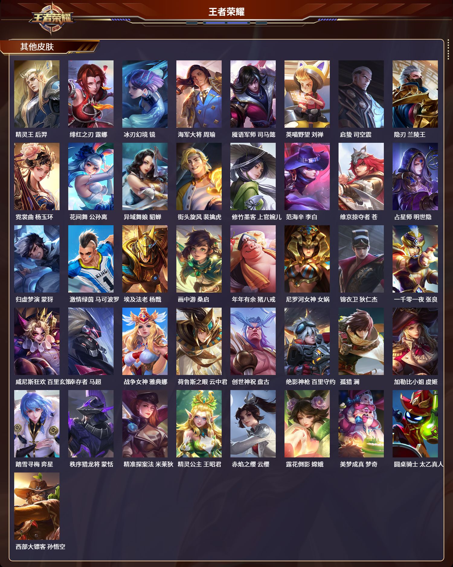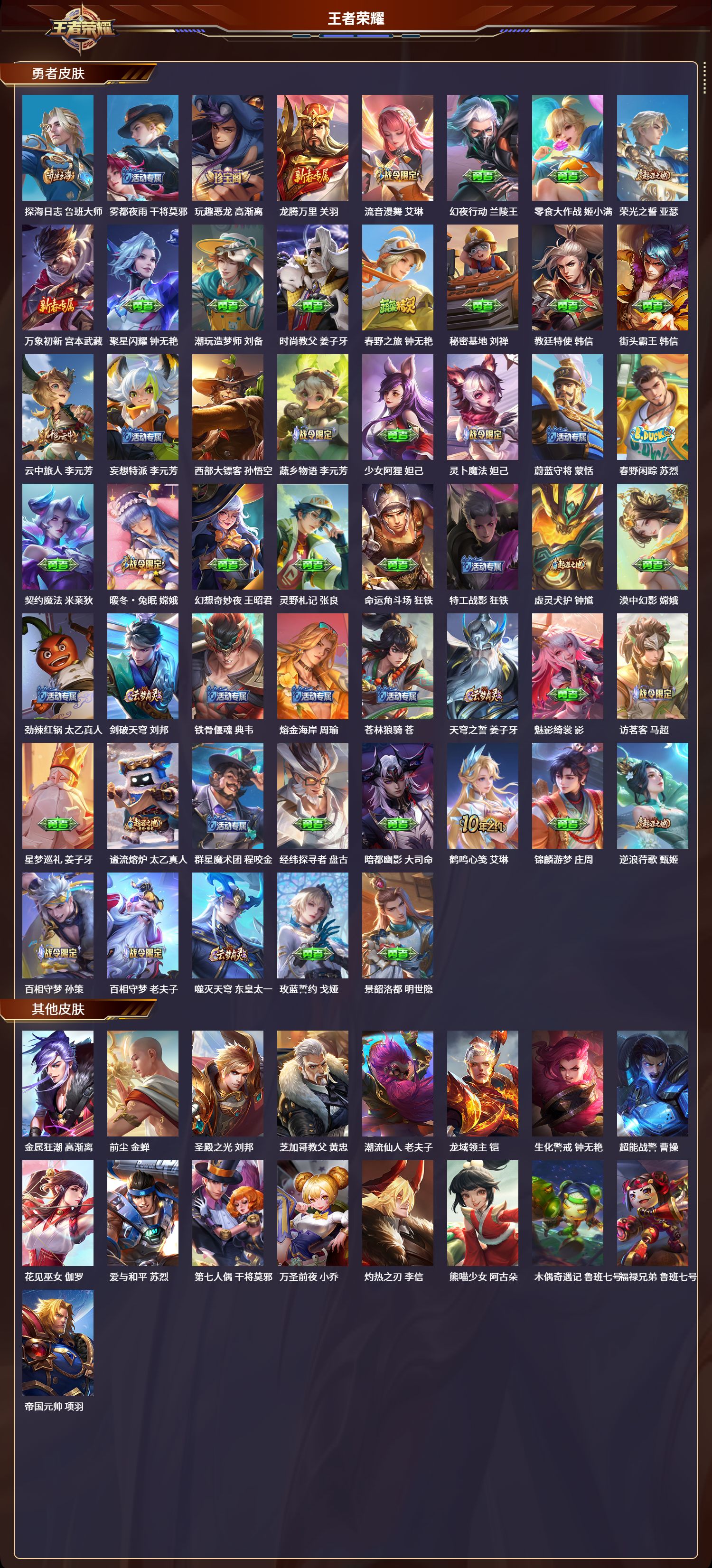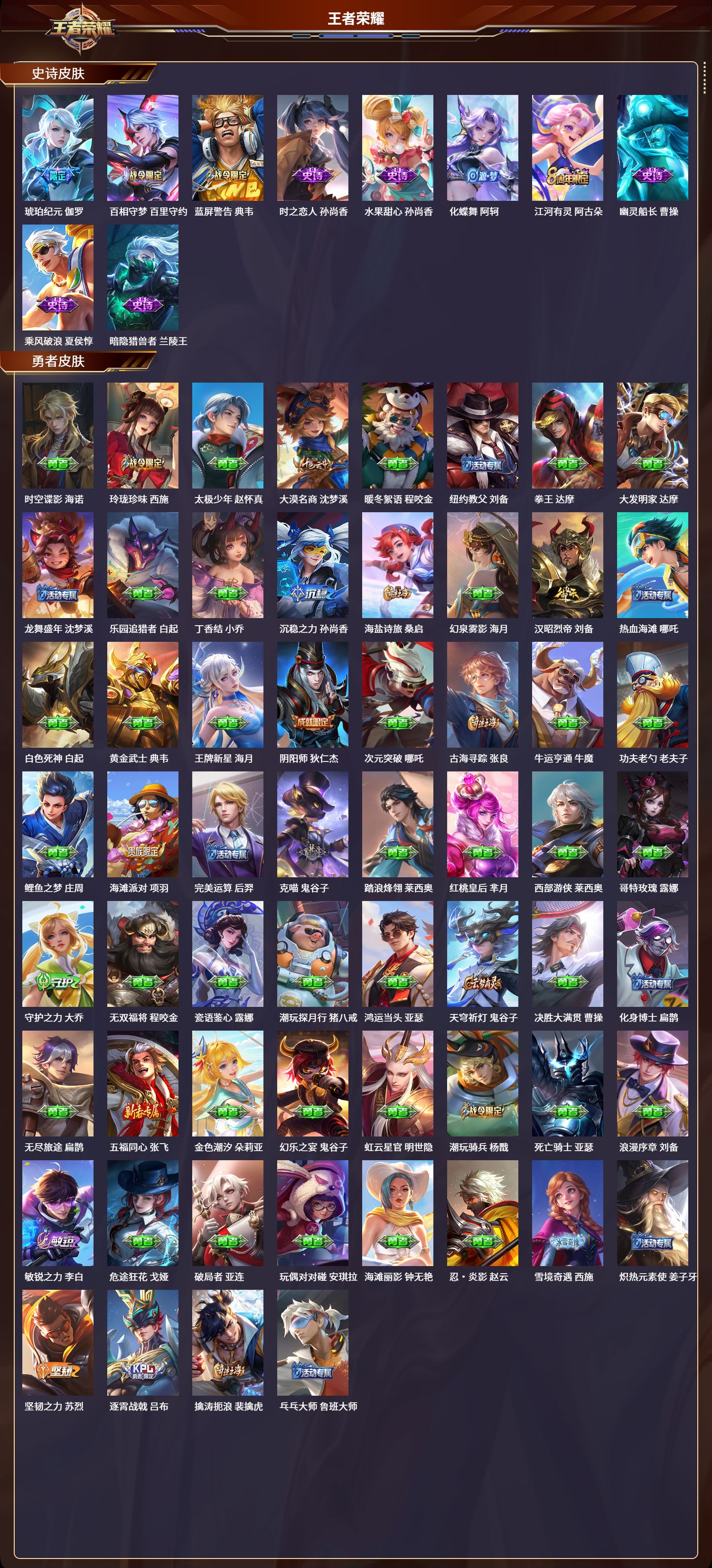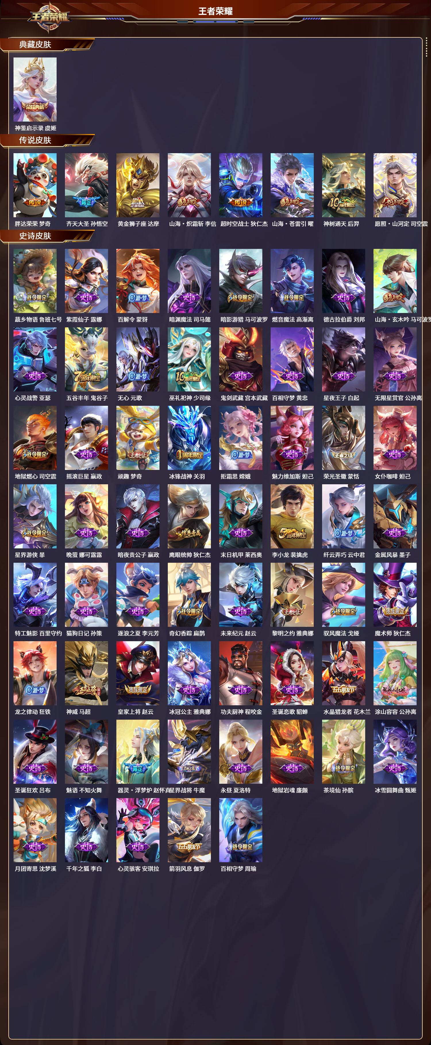 安卓qq/非凡王者/250皮肤/125英雄/1典藏/0珍品无双/0无双/0珍品传说/8传说/71史诗/9稀有英雄【1 典藏皮肤】神鉴启示录 虞姬【8 传说皮肤】胖达荣荣 梦奇齐天大圣 孙悟空黄金狮子座 达摩山海·炽霜斩 李信超时空战士 狄仁杰山海·苍雷引 曜神树通天 后羿愿照·山河定 司空震【71 史诗皮肤】蔬乡物语 鲁班七号紫霞仙子 露娜百解令 蒙犽暗