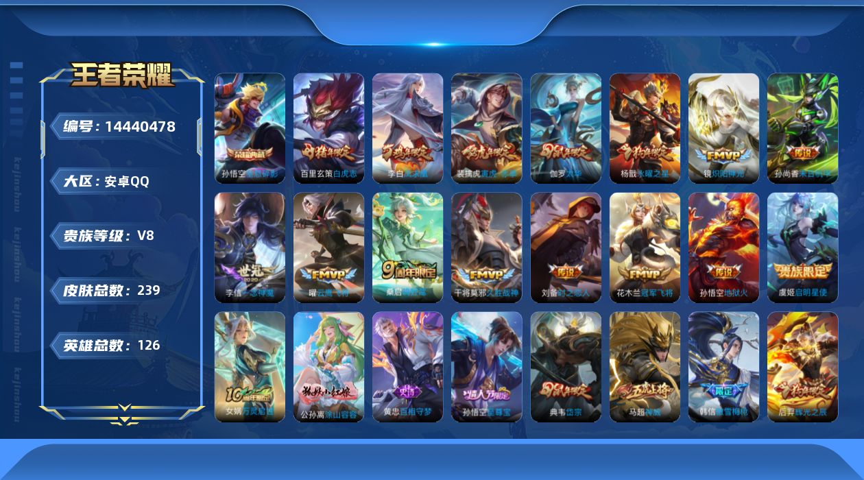 v8 1典藏 16传说 126英雄 239皮肤 可修改实名 【英雄全皮】:刘邦全皮 【稀有英雄】:大司命嬴政始皇帝韩信韩跳跳夏洛特夏师傅艾琳橘右京橘子娜可露露鸟人不知火舞赵云金蝉唐僧戈娅 【荣耀水晶】:全息碎影猴子典藏 【传说皮】:神树通天地狱火
