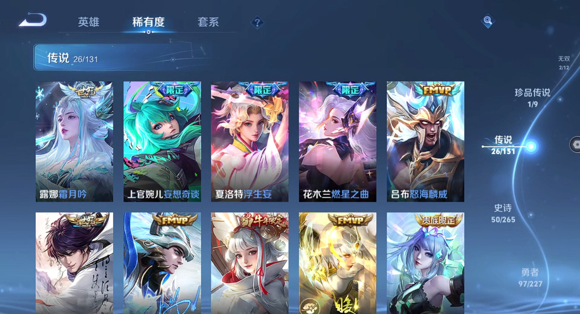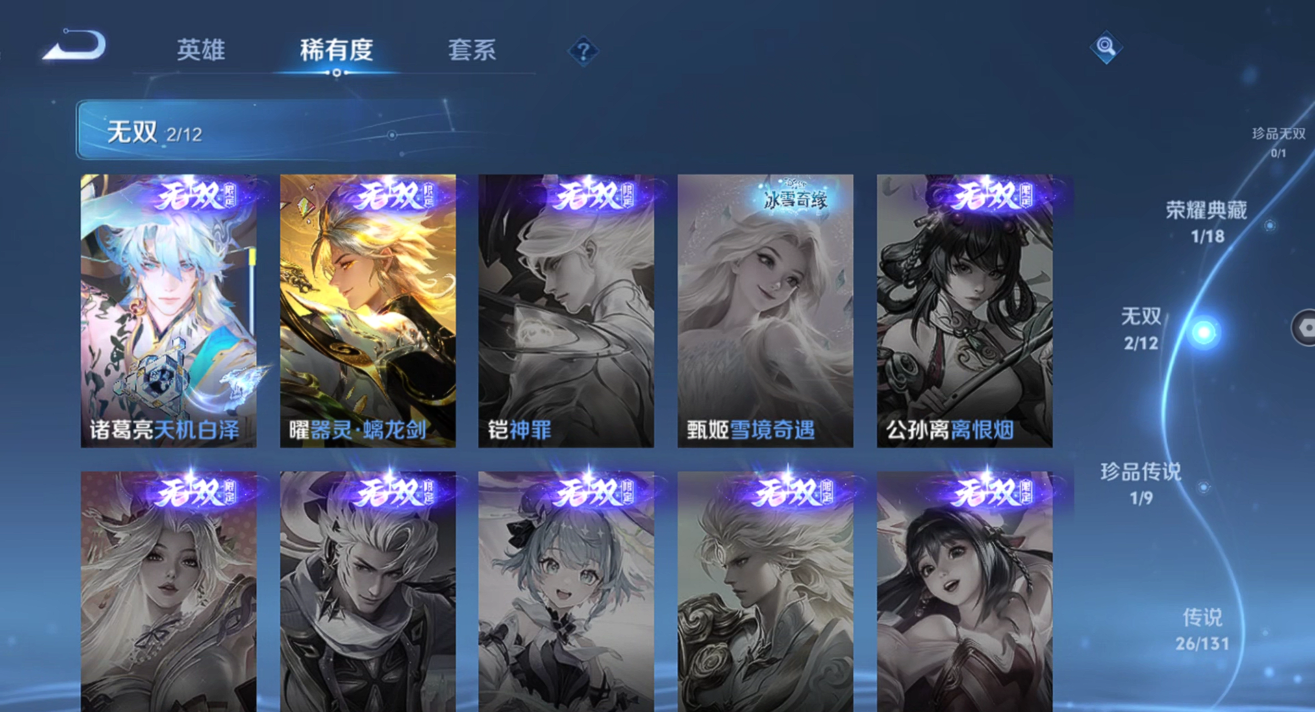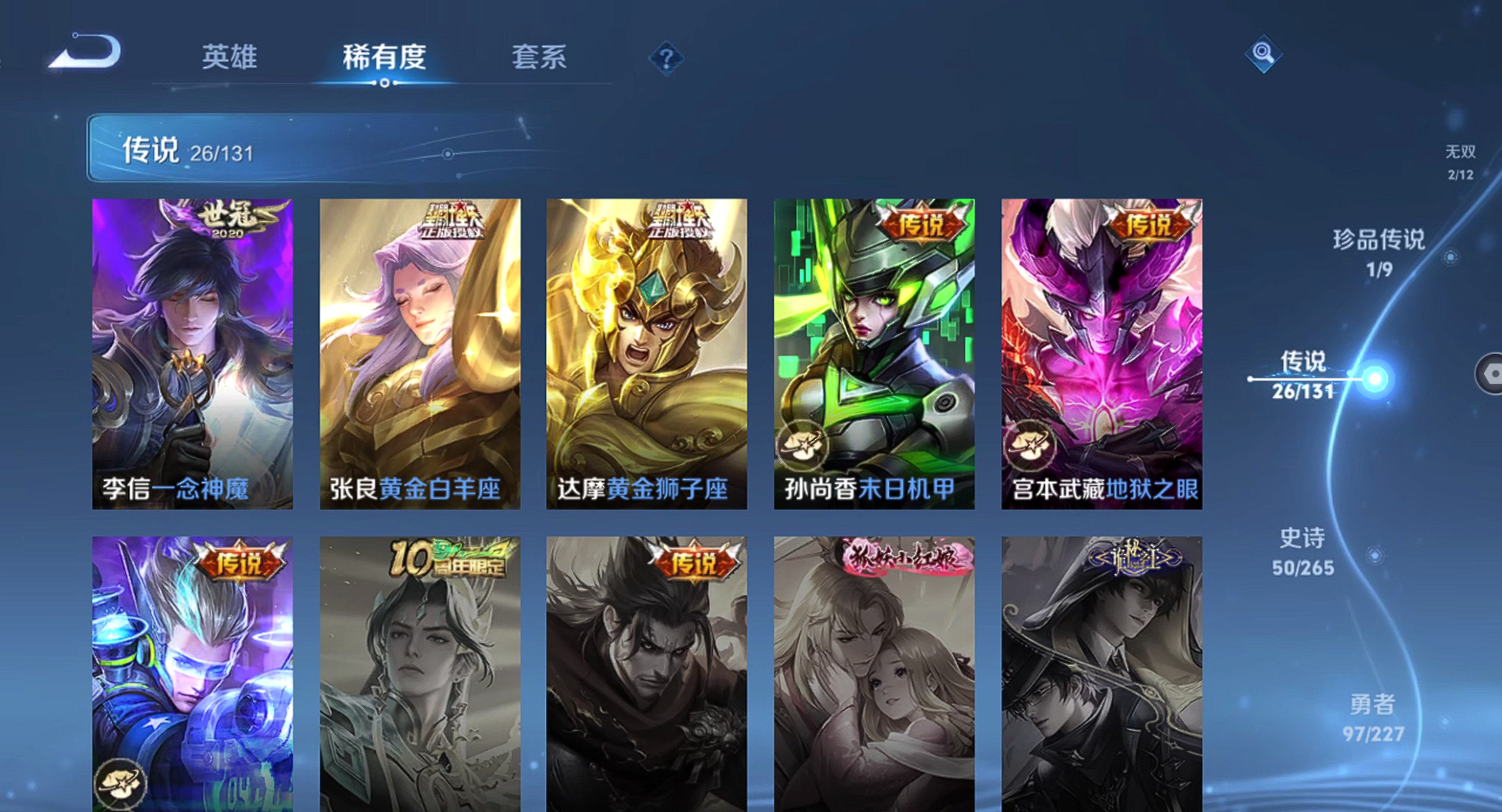 【王者荣耀】【lywz22940】珍品无双0 典藏1 无双2 珍品传说1 传说26 史诗50 英雄126 皮肤215 贵族8级 荣耀典藏:弑呛猎影__无双皮肤:器灵·螭龙剑|天机白泽__珍品传说:孙策-时之奇旅__传说皮肤:鸣野蒿|无双飞将|炽阳神光|启明星使|地狱之眼|黄金狮子座|狄仁杰-超时空战士|黄金白羊座|一念神魔|浮生妄|孙尚香-末日机甲|落雪白狼|马超-琥珀纪元|怒海麟威|祈雪灵祝|燃星之曲|诗剑行|霜月吟|妄想奇谈|逐花归海|祥瑞亨通|愿照·岁时盈|愿照·山河定|愿照·九州拓|九山相柳|神树通天__稀有限定:至尊宝|神威|李小龙|山海·玄木吟|海滩派对|胡桃异想国|皇家上将|剑破天穹|魔术师|匿光追影者|青焰无极|天穹祈灯|阴阳师|缤纷独角兽|冰雪圆舞曲|苍穹之光|功夫厨神|鬼剑武藏|黄金分割率|节奏热浪|金属风暴|李元芳-蔬乡物语|魅力维加斯|偶像歌手|圣诞狂欢|圣诞恋歌|鲁班七号-蔬乡物语|水果甜心|天秀·启明|赵云-未来纪元|星夜王子|鹰眼统帅|逐浪之夏|紫霞仙子|百里守约-百相守梦|老夫子-百相守梦|噬灭天穹|敬我三分|蔡文姬-夏日便利店|虞姬-夏日便利店|天穹之誓|曙光守护者|心灵战警|孙尚香-时之恋人|茶境仙|星界战将|谧流熔炉|万物之道|器灵·浮梦炉|化蝶舞|玲珑珍味|单词大作战|流音漫舞|访茗客|苍威无极|刘禅-鸭鸭历险记|沈梦溪-鸭鸭历险记|雪豹·霜爪|龙之律动|布丁狗之约|虚灵犬护|逆浪荇歌|孙策-百相守梦|周瑜-百相守梦|赞萌露比|幻珠鲛人|黄忠-百相守梦|织梦人|守夜人|光弋星穹|往忆晖光|荣光之誓|巫礼祀神|鹤鸣心笺__优质皮肤:年年有余|埃及法老|孤猎|午夜歌剧院|激情绿茵|海之征途|天启骑士|碧珀绯影|秩序猎龙将|锦衣卫|冰刃幻境|英喵野望|维京掠夺者|绯红之刃|启蛰|战争骑士|伊势巫女|生化警戒|威尼斯狂欢|街头旋风|地府判官|幸存者|赤焰之缨|隐刃|前尘|特种部队|精灵王|剑舞者|范海辛|龙域领主|魇语军师|灼热之刃|精灵公主|破阵·退雄兵|异域游侠|潮玩探月行|次元突破|鲨炮海盗猫|丁香结|功夫老勺|命运角斗场|幻想奇妙夜|海滩丽影|兔女郎|死亡骑士|少女阿狸|东方不败|红桃皇后|忍·炎影|爱心护理|街头霸王|教廷特使|太极少年|牛运亨通|幻泉雾影|潮玩造梦师|胡桃狂想曲|铁甲之心|重装意志|次元傲视|无尽征程|拳王|白色死神|白执事|大发明家|哥特玫瑰|魅影绮裳|西施-雪境奇遇|金福满堂|星梦巡礼|灵卦秘语|爆裂喵拳|景韶洛都|浪漫序章|雾都夜雨|铁骨偃魂|龙腾万里|敏锐之力|西施-归虚梦演|孙悟空-西部大镖客|鲁班大师-归虚梦演|龙舞盛年|乓乓大师|五福同心|万事如意|曜-归虚梦演|唤灵魔甲|沉稳之力|程咬金-群星魔术团|花好人间|熔金海岸|苍林狼骑|劲辣红锅|妄想特派|春野闲踪|灵野札记|玫蓝誓约|命运加冕|潮玩士官长|小满鸭|死霸装|无双福将|锦麟游梦|踏浪烽翎|戏梦巡演|落日弦歌|克喵|哪吒-罗小黑战记|径山谋武|极光幻客__贵族等级:贵族8级__王者段位:无双王者打野皮肤号 26按键 韩信典藏2无双 孙策珍品传说 琥珀纪元,九山相柳,启明星使,落雪白狼,愿照·山河定,浮生妄,祈雪灵祝,愿照·九州拓,逐花归海,霜月吟等限定皮肤