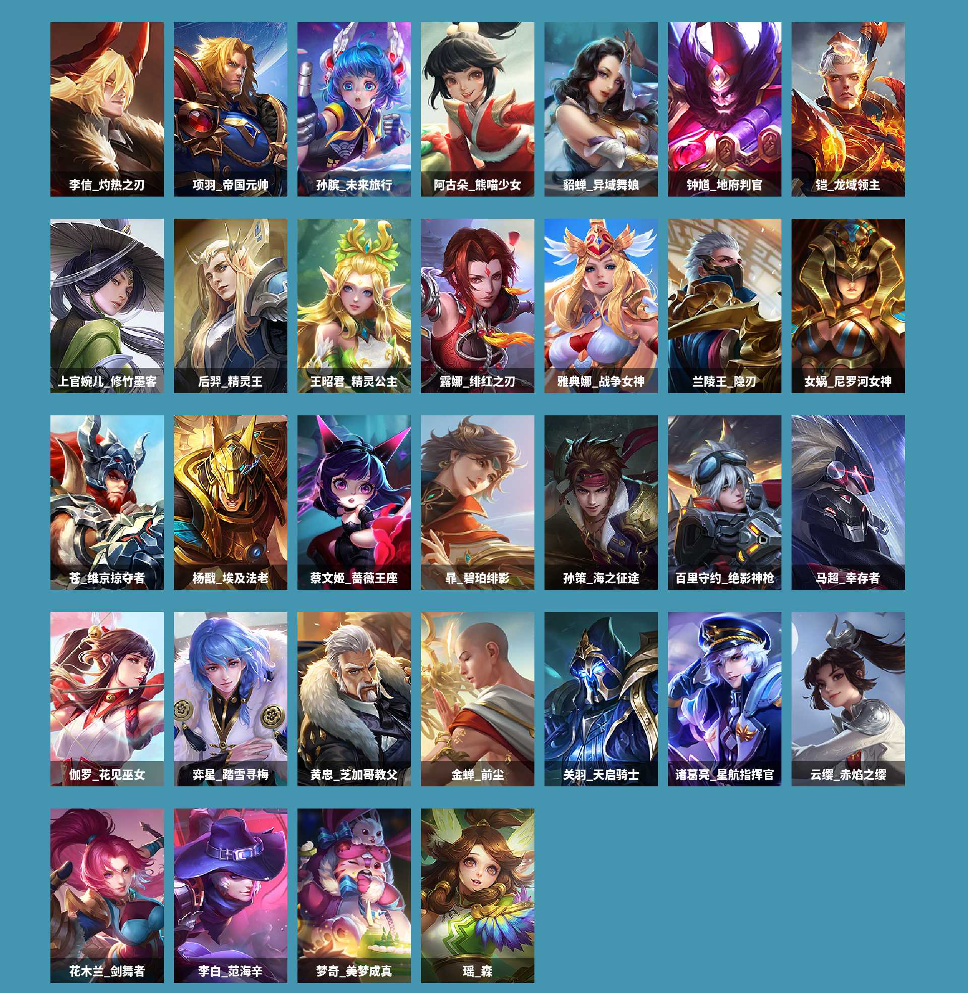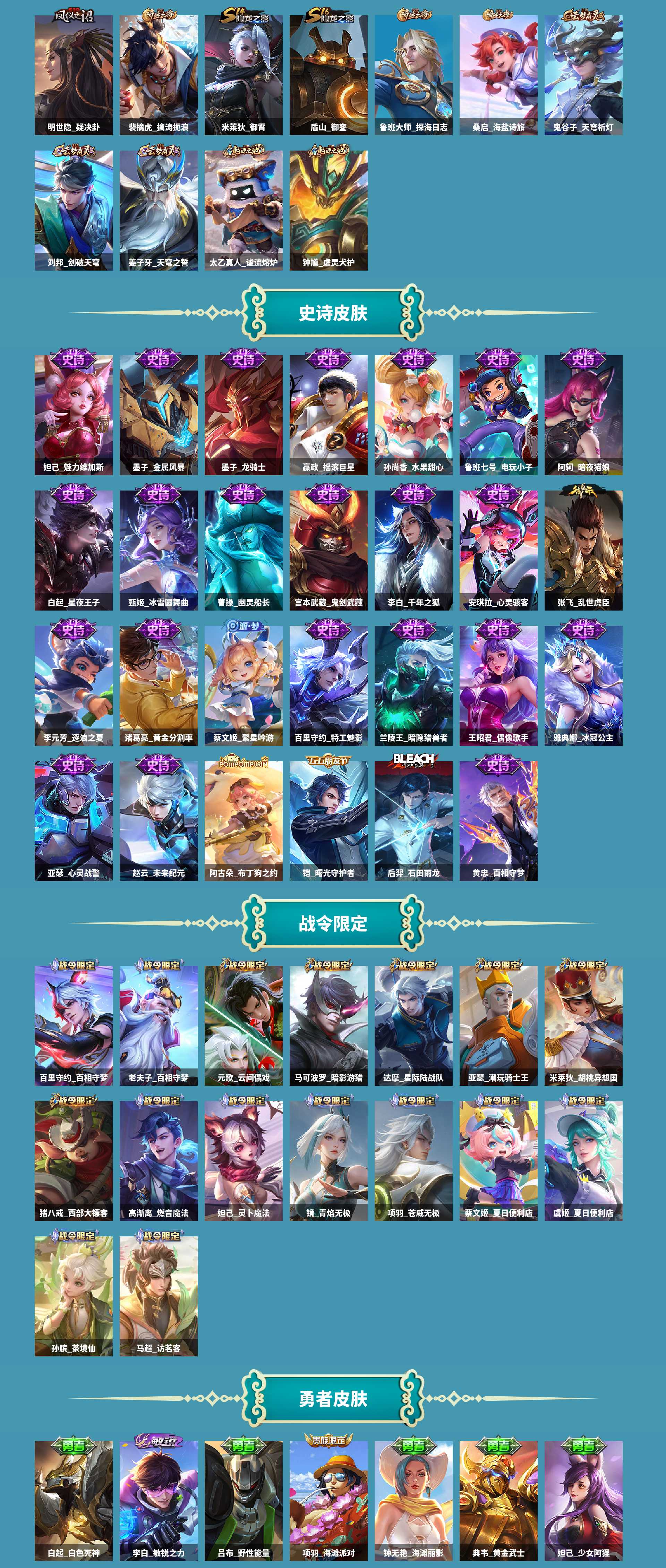 al636788 【特价铠银白咏叹调,孙悟空全息碎影】 皮肤数189 皮肤价值148756 传说皮肤数1 史诗皮肤数44 英雄数126 营地id1823748449 贵族等级【文本】贵族6级 【贵族6级】 【可排位】 【是】 荣耀典藏2 内测皮肤1 限定皮肤60 赛季限定27 史诗皮肤45 战令限定16 勇者皮肤102 其他皮肤39 荣耀典藏:铠银白咏叹调,孙悟空全息碎影; 内测皮肤:孙尚香蔷薇恋人; 限定皮肤:甄姬游园惊梦,白起死霸装,后羿石田雨龙,百里玄策原初追逐者,钟馗虚灵犬护,孙膑茶境仙,马超访茗客,太乙真人谧流熔炉,百里守约百相守梦,吕布逐霄战戟,狄仁杰魔术师,老夫子百相守梦,桑启鸣野蒿,东皇太一噬灭天穹,盘古敬我三分,蔡文姬夏日便利店,姜子牙天穹之誓,虞姬夏日便利店,赵云皇家上将,镜青焰无极,项羽苍威无极,狄仁杰鹰眼统帅,孙尚香蔷薇恋人,刘邦剑破天穹,沈梦溪龙舞盛年,高渐离燃音魔法,嫦娥漠中幻影,妲己灵卜魔法,鬼谷子天穹祈灯,张良古海寻踪,鲁班大师探海日志,裴擒虎擒涛扼浪,桑启海盐诗旅,沈梦溪大漠名商,兰陵王金庭之子,达摩沙漠行僧,猪八戒猪悟能,苏烈千军破阵,孙悟空孙行者,钟馗驱傩正仪,米莱狄胡桃异想国,程咬金演武夺筹,项羽海滩派对,达摩星际陆战队,元歌云间偶戏,亚瑟潮玩骑士王,狄仁杰万华元夜,裴擒虎李小龙,鬼谷子原初探秘者,蔡文姬繁星吟游,马可波罗暗影游猎,猪八戒西部大镖客,老夫子醍醐杖,狄仁杰阴阳师,明世隐疑决卦,弈星混沌棋,夏侯惇朔风刀,盾山御銮,米莱狄御霄,钟无艳王者之锤; 赛季限定:亚瑟荣光之誓,甄姬逆浪荇歌,百里玄策原初追逐者,钟馗虚灵犬护,太乙真人谧流熔炉,东皇太一噬灭天穹,姜子牙天穹之誓,刘邦剑破天穹,鬼谷子天穹祈灯,张良古海寻踪,鲁班大师探海日志,裴擒虎擒涛扼浪,桑启海盐诗旅,沈梦溪大漠名商,兰陵王金庭之子,达摩沙漠行僧,苏烈千军破阵,钟馗驱傩正仪,程咬金演武夺筹,狄仁杰万华元夜,鬼谷子原初探秘者,老夫子醍醐杖,明世隐疑决卦,弈星混沌棋,夏侯惇朔风刀,盾山御銮,米莱狄御霄; 史诗皮肤:李元芳逐浪之夏,李白千年之狐,嬴政摇滚巨星,甄姬游园惊梦,黄忠百相守梦,后羿石田雨龙,百里玄策原初追逐者,阿古朵_布丁狗之约,铠曙光守护者,妲己魅力维加斯,孙膑茶境仙,王昭君偶像歌手,安琪拉心灵骇客,赵云未来纪元,百里守约百相守梦,狄仁杰魔术师,白起星夜王子,诸葛亮黄金分割率,曹操幽灵船长,张飞乱世虎臣,孙尚香水果甜心,蔡文姬夏日便利店,鲁班七号电玩小子,赵云皇家上将,镜青焰无极,狄仁杰鹰眼统帅,孙尚香蔷薇恋人,甄姬冰雪圆舞曲,兰陵王暗隐猎兽者,高渐离燃音魔法,阿轲暗夜猫娘,亚瑟心灵战警,墨子龙骑士,宫本武藏鬼剑武藏,猪八戒猪悟能,墨子金属风暴,孙悟空孙行者,百里守约特工魅影,米莱狄胡桃异想国,元歌云间偶戏,裴擒虎李小龙,雅典娜冰冠公主,蔡文姬繁星吟游,马可波罗暗影游猎,钟无艳王者之锤; 战令限定:孙膑茶境仙,马超访茗客,百里守约百相守梦,老夫子百相守梦,蔡文姬夏日便利店,虞姬夏日便利店,镜青焰无极,项羽苍威无极,高渐离燃音魔法,妲己灵卜魔法,米莱狄胡桃异想国,达摩星际陆战队,元歌云间偶戏,亚瑟潮玩骑士王,马可波罗暗影游猎,猪八戒西部大镖客; 勇者皮肤:亚连破局者,艾琳鹤鸣心笺,亚瑟荣光之誓,花木兰兔女郎,赵云白执事,哪吒罗小黑战记,宫本武藏万象初新,莱西奥踏浪烽翎,达摩大发明家,庄周锦麟游梦,甄姬逆浪荇歌,白起死霸装,露娜命运加冕,姜子牙星梦巡礼,钟馗虚灵犬护,刘备浪漫序章,戈娅玫蓝誓约,马超访茗客,西施雪境奇遇,太乙真人谧流熔炉,苍苍林狼骑,武则天东