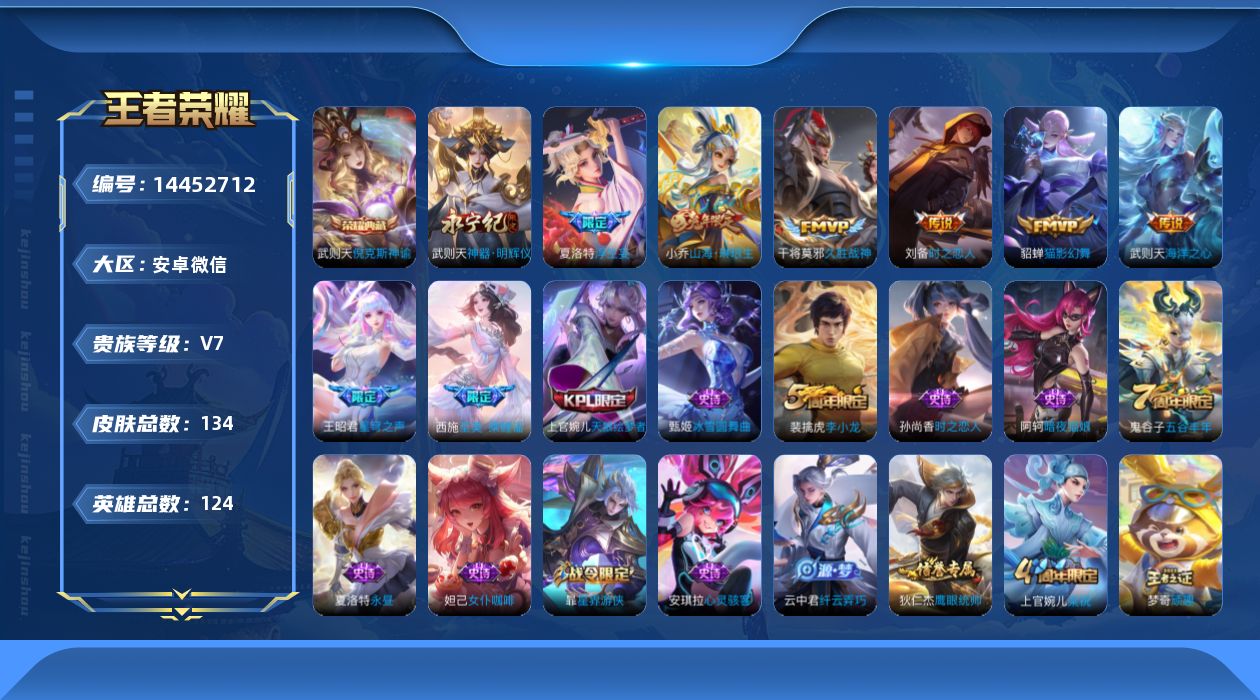 [14452712]v7 1典藏 1无双 7传说 124英雄 134皮肤 典藏英雄武则天 可修改实名 【英雄全皮】:夏洛特全皮武则天全皮 【稀有英雄】:大司命嬴政始皇帝韩信韩跳跳夏洛特夏师傅艾琳橘右京橘子娜可露露鸟人不知火舞赵云金蝉唐僧戈娅 【荣耀水晶】:倪克斯神谕宇宙婆娘 【无双皮】:神器·明辉仪 【传说皮】:山海·琳琅生小乔年限海洋之心久胜战神猫影幻舞时之恋人-刘备电焊工神器·明辉仪浮生妄 【珍宝阁皮】:胡桃夹子 【赛季/战令皮】:古海寻踪s33星界游侠海盐诗旅s30擒涛扼浪s31探海日志s32顽趣-梦奇剑破天穹s35天穹祈灯s34暖冬·兔眠炼金王s6凯尔特女王s7狰s8饕餮s9烛龙s10重明s11穷奇s12御狮s13御霄s14御旌s15御銮s16朔风刀s17混沌棋s18疑决卦s19醍醐杖s20原初探秘者s21万华元夜s22驱傩正仪s24大漠名商s28云中旅人s29 【史诗皮】:永昼江河有灵冰冠公主偶像歌手银翎春语暗夜猫娘猫狗日记-孙策时之恋人-孙尚香乱世虎臣节奏热浪女仆咖啡摇滚巨星心灵骇客舞动绿茵地狱岩魂纤云弄巧逐浪之夏月团寄思圣诞狂欢鹰眼统帅暗夜贵公子魅力维加斯滕王阁序 【限定皮】:星穹之声至美·乘鲤谣遇见飞天五谷丰年游园惊梦梁祝天狼绘梦者李小龙神器·万象笔 【普通皮】:雾都夜雨功夫炙烤王牌新星尼罗河女神鬼谷子天穹祈灯s34蔚蓝守将龙腾万里归虚梦演-孙膑归虚梦演-曜归虚梦演-西施海滩丽影海滩派对皇家上将魔术师华丽摇滚沉稳之力坚韧之力霸王丸炽热元素使纽约教父乓乓大师次元突破功夫老勺鲨炮海盗猫教廷特使阴阳师汉昭烈帝死亡骑士少女阿狸忍·炎影丁香结爱心护理冰雪圆舞曲拳王东方不败玩偶对对碰幻想奇妙夜幽兰居士幻乐之宴虹云星官修竹墨客伊势巫女花见巫女踏雪寻梅未来旅行第七人偶地府判官福禄兄弟蔷薇王座维京掠夺者万圣前夜异域舞娘激情绿茵精灵王死神来了棒球奇才午夜歌剧院精准探案法霓裳曲占星师