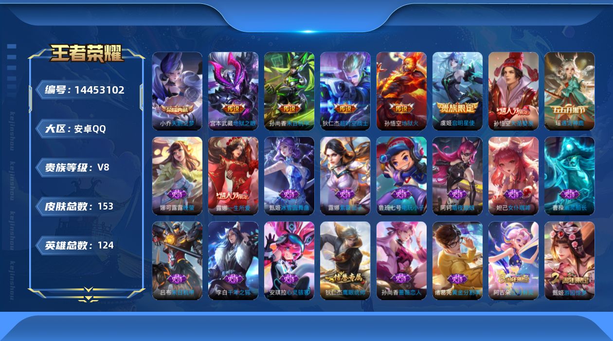 [14453102]v8 1典藏 5传说 124英雄 153皮肤 典藏英雄武则天 可修改实名 【稀有英雄】:大司命韩信韩跳跳夏洛特夏师傅艾琳橘右京橘子娜可露露鸟人不知火舞赵云金蝉唐僧戈娅 【荣耀水晶】:天鹅之梦小乔典藏 【传说皮】:地狱火地狱之眼末日机甲-孙尚香绿蚂蚱超时空战士-狄仁杰 【珍宝阁皮】:蔷薇恋人 【赛季/战令皮】:古海寻踪s33海盐诗旅s30擒涛扼浪s31探海日志s32天穹祈灯s34炼金王s6凯尔特女王s7狰s8饕餮s9烛龙s10穷奇s12御狮s13御霄s14御旌s15御銮s16朔风刀s17混沌棋s18疑决卦s19醍醐杖s20原初探秘者s21万华元夜s22演武夺筹s23驱傩正仪s24千军破阵s25猎兽之王白昼王子 【史诗皮】:遇见神鹿紫霞仙子电玩小子小书包白龙吟黄金分割率千年之狐江河有灵偶像歌手晚萤暗夜猫娘末日机甲-吕布女仆咖啡水果甜心绅士熊喵天才门将心灵骇客德古拉伯爵暗隐猎兽者幽灵船长缤纷独角兽逐浪之夏金属风暴圣诞狂欢圣诞恋歌鹰眼统帅魅力维加斯 【限定皮】:游园惊梦一生所爱大圣娶亲 【普通皮】:劲辣红锅朵莉亚金色潮汐漠中幻影街头霸王星梦巡礼鹤鸣心笺虚灵犬护布丁狗之约聚星闪耀王牌新星威尼斯狂欢鬼谷子天穹祈灯s34万事如意龙腾万里花好人间归虚梦演-孙膑归虚梦演-鲁班大师归虚梦演-西施海滩丽影海滩派对皇家上将魔术师启明星使沉稳之力守护之力霸王丸化身博士黄金武士次元突破大发明家哥特玫瑰鲨炮海盗猫西部大镖客牛魔教廷特使鲤鱼之梦星际陆战队(程咬金)阴阳师汉昭烈帝死亡骑士少女阿狸忍·炎影白执事奇妙博物学秘密基地爱心护理白色死神冰雪圆舞曲拳王科学大爆炸玩偶对对碰阿尔法小队幻乐之宴虹云星官露花倒影荷鲁斯之眼伊势巫女花见巫女爱与和平未来旅行三太子龙域领主地府判官生化警戒金属狂潮福禄兄弟蔷薇王座万圣前夜异域舞娘东海龙王星航指挥官战争女神激情绿茵精灵王死神来了芝加哥教父赤焰之缨森午