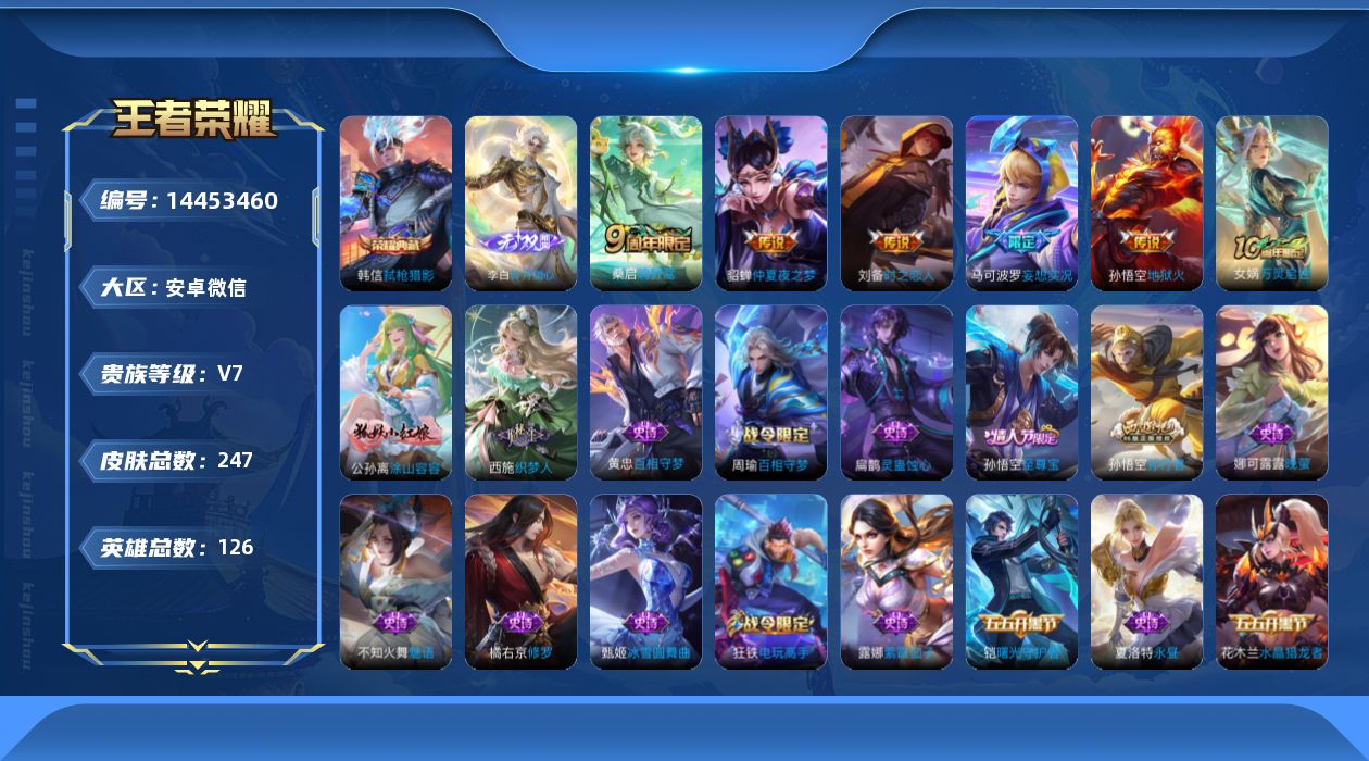 v7 1典藏 1无双 6传说 126英雄 247皮肤 可修改实名 【英雄全皮】:蒙恬全皮戈娅全皮 【稀有英雄】:大司命嬴政始皇帝韩信韩跳跳夏洛特夏师傅艾琳橘右京橘子娜可露露鸟人不知火舞赵云金蝉唐僧戈娅 【荣耀水晶】:弑呛猎影韩信典藏 【无双皮】:碎