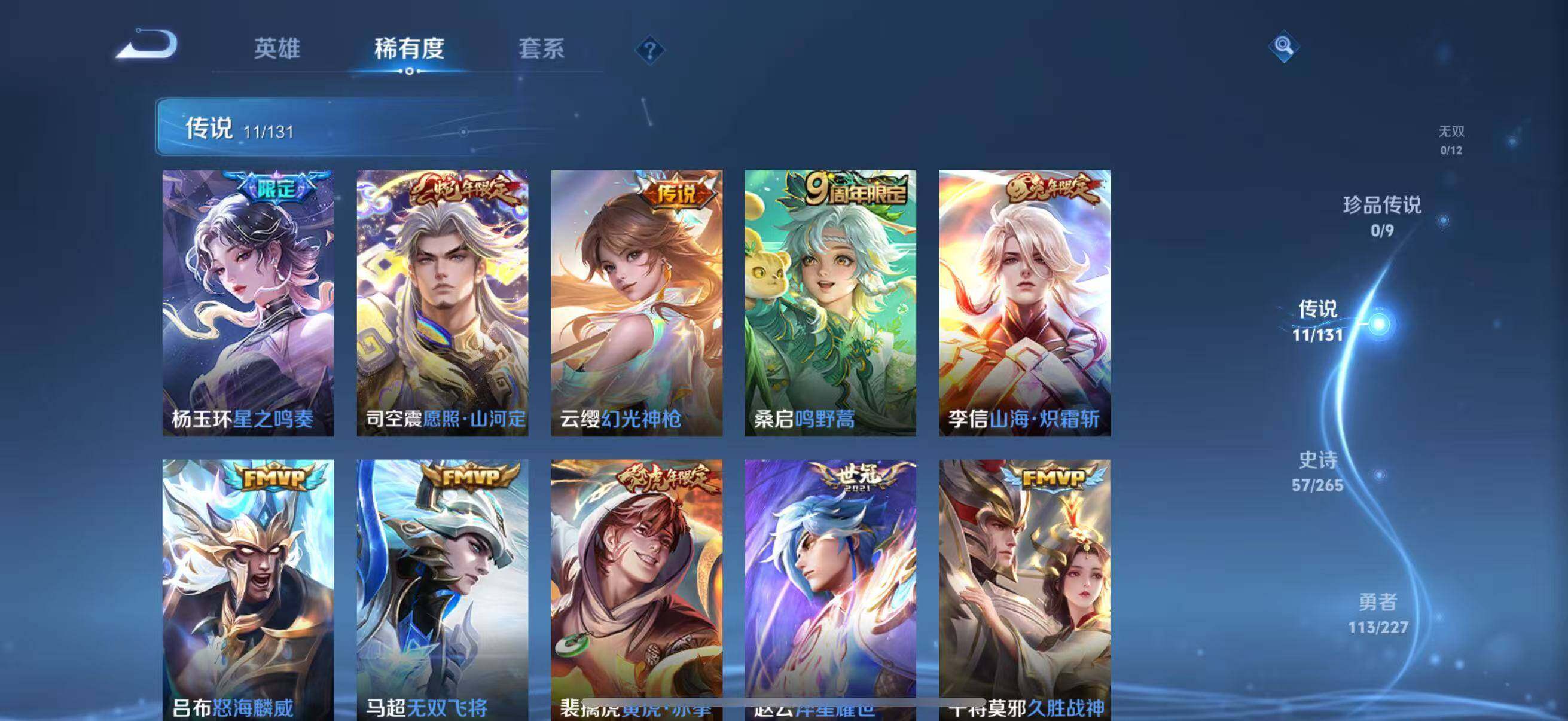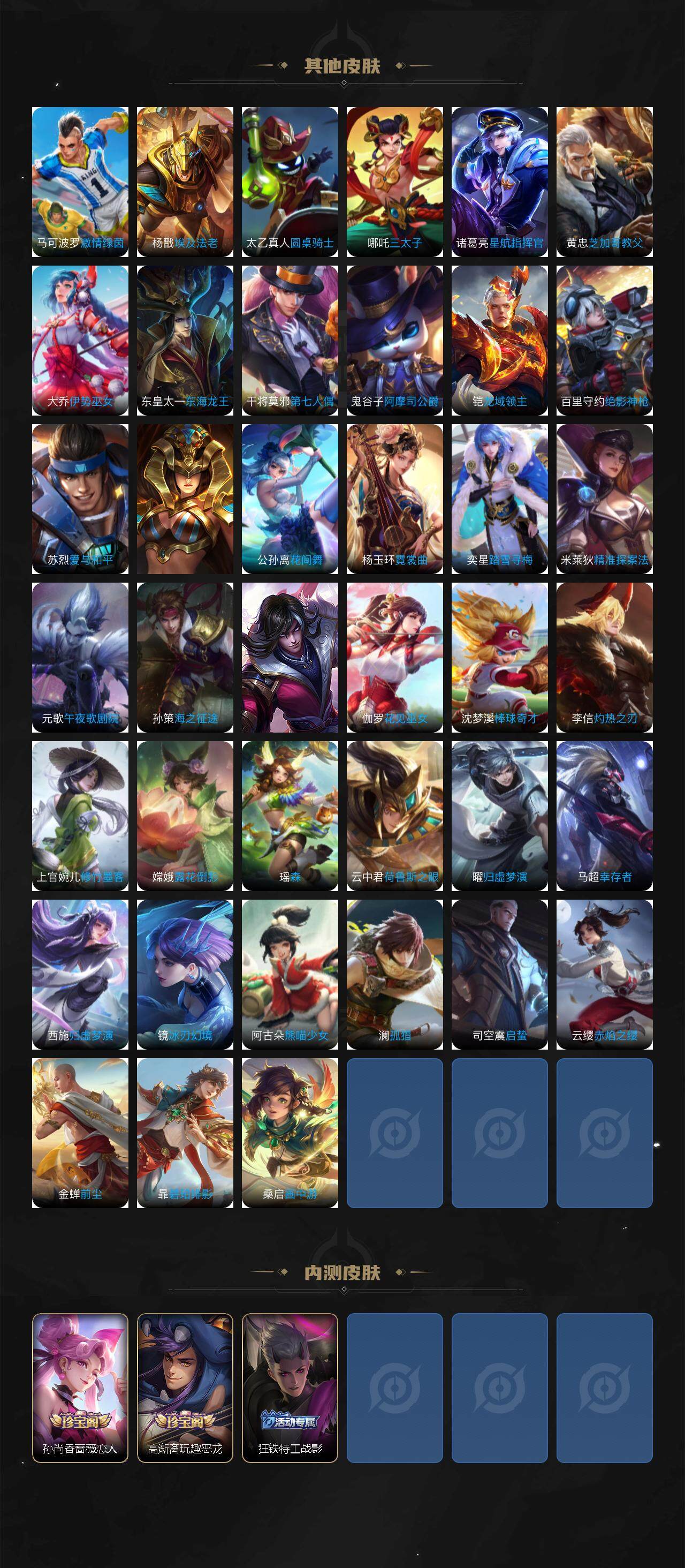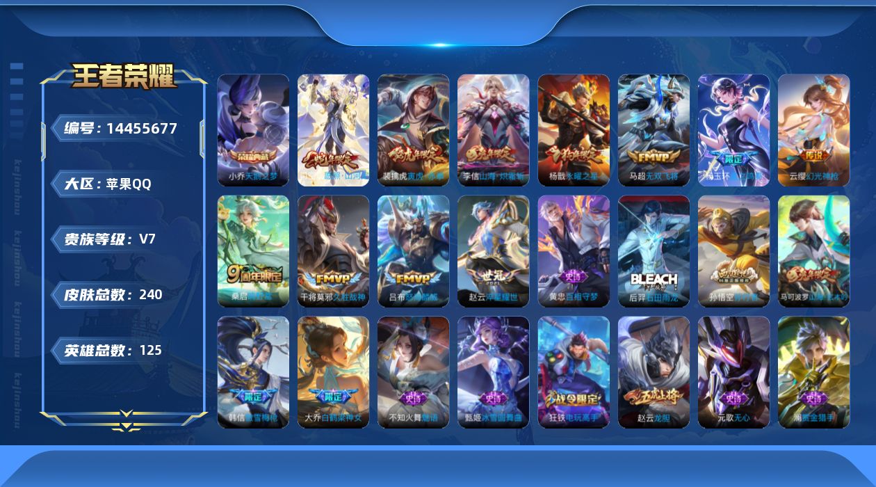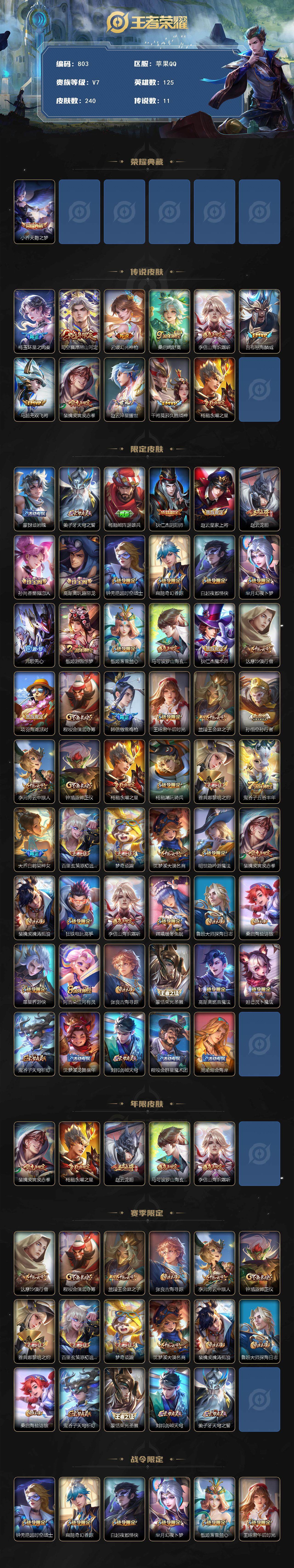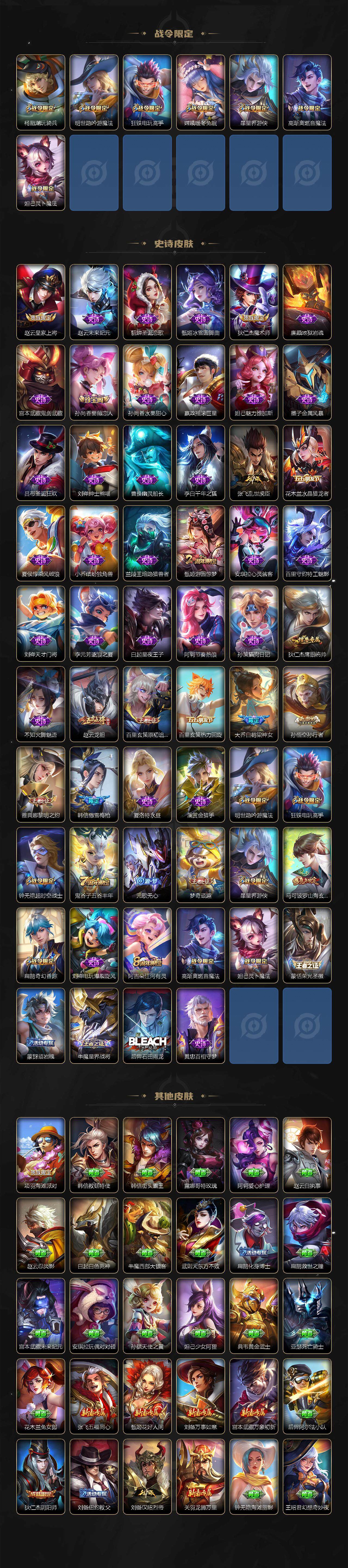 [14455677]v7-125英雄-240皮肤-1典藏皮肤-11传说-57史诗 省8牛魔战力8000 省50赵怀真战力6100 19市标 星币5500 cc8411 【英雄全皮】:影全皮 【荣耀典藏】:小乔天鹅之梦 【传说皮肤】:杨玉环星之鸣奏,司空震愿照山河定,云缨幻光神呛,桑启鸣野蒿,李信山海炽霜斩,吕布怒海麟威,马超无双飞将,裴擒虎寅虎赤拳,赵云淬星耀世,干将莫邪久胜战神,杨戬永曜之星 【限定皮肤】:蒙犽顽岩魄,姜子牙天穹之誓,杨戬破阵退雄兵,狄仁杰阴阳师,赵云皇家上将,赵云龙胆,孙尚香蔷薇恋人,高渐离玩趣恶龙,钟无艳超时空战士,扁鹊奇幻香踪,白起夜都怪侠,芈月幻夜卜梦,元歌无心,甄姬游园惊梦,甄姬落雪兰心,马可波罗山海玄木吟,狄仁杰魔术师,达摩沙漠行僧,项羽海滩派对,程咬金演武夺筹,韩信傲雪梅呛,王昭君午后时光,兰陵王金庭之子,孙悟空孙行者,李元芳云中旅人,钟馗驱傩正仪,杨戬永曜之星,杨戬潮玩骑兵,雅典娜黎明之约,鬼谷子五谷丰年,大乔白鹤梁神女,百里玄策原初追逐者,梦奇顽趣,沈梦溪大漠名商,明世隐吟游魔法,裴擒虎寅虎赤拳,裴擒虎擒涛扼浪,狂铁电玩高手,李信山海炽霜斩,嫦娥暖冬兔眠,鲁班大师探海日志,桑启海盐诗旅,暃星界游侠,阿古朵江河有灵,张良古海寻踪,蒙恬荣光圣徽,高渐离燃音魔法,妲己灵卜魔法,鬼谷子天穹祈灯,沈梦溪龙舞盛年,刘邦剑破天穹,程咬金群星魔术团,周瑜熔金海岸 【年限皮肤】:裴擒虎寅虎赤拳,杨戬永曜之星,赵云龙胆,马可波罗山海玄木吟,李信山海炽霜斩 【赛季限定】:达摩沙漠行僧,程咬金演武夺筹,兰陵王金庭之子,张良古海寻踪,李元芳云中旅人,钟馗驱傩正仪,雅典娜黎明之约,百里玄策原初追逐者,梦奇顽趣,沈梦溪大漠名商,裴擒虎擒涛扼浪,鲁班大师探海日志,桑启海盐诗旅,鬼谷子天穹祈灯,蒙恬荣光圣徽,刘邦剑破天穹,姜子牙天穹之誓 【战令限定】:钟无艳超时空战士,扁鹊奇幻香踪,白起夜都怪侠,芈月幻夜卜梦,甄姬落雪兰心,王昭君午后时光,杨戬潮玩骑兵,明世隐吟游魔法,狂铁电玩高手,嫦娥暖冬兔眠,暃星界游侠,高渐离燃音魔法,妲己灵卜魔法 【史诗皮肤】:赵云皇家上将,赵云未来纪元,貂蝉圣诞恋歌,甄姬冰雪圆舞曲,狄仁杰魔术师,廉颇地狱岩魂,宫本武藏鬼剑武藏,孙尚香蔷薇恋人,孙尚香水果甜心,嬴政摇滚巨星,妲己魅力维加斯,墨子金属风暴,吕布圣诞狂欢,刘禅绅士熊喵,曹操幽灵船长,李