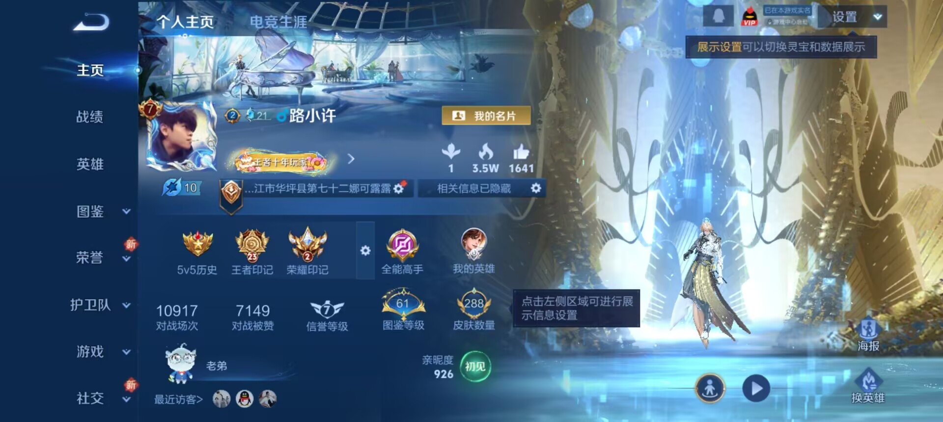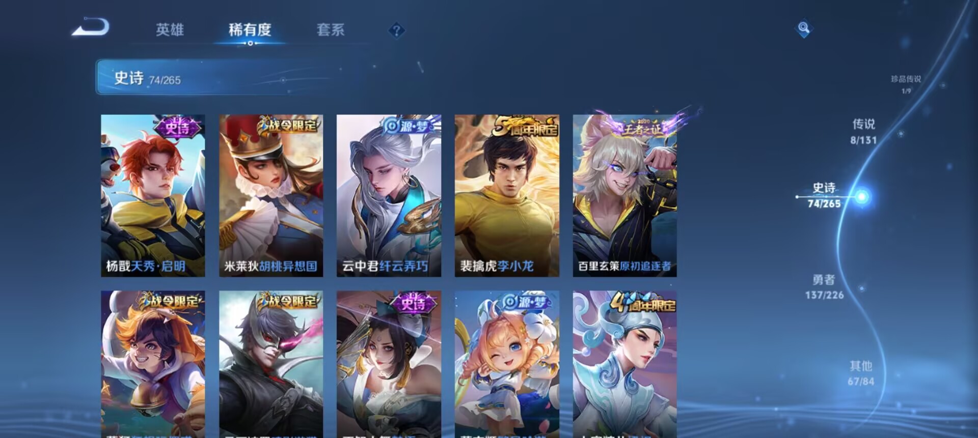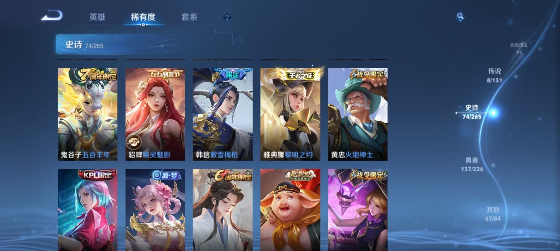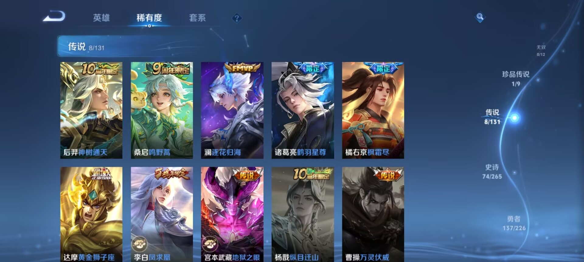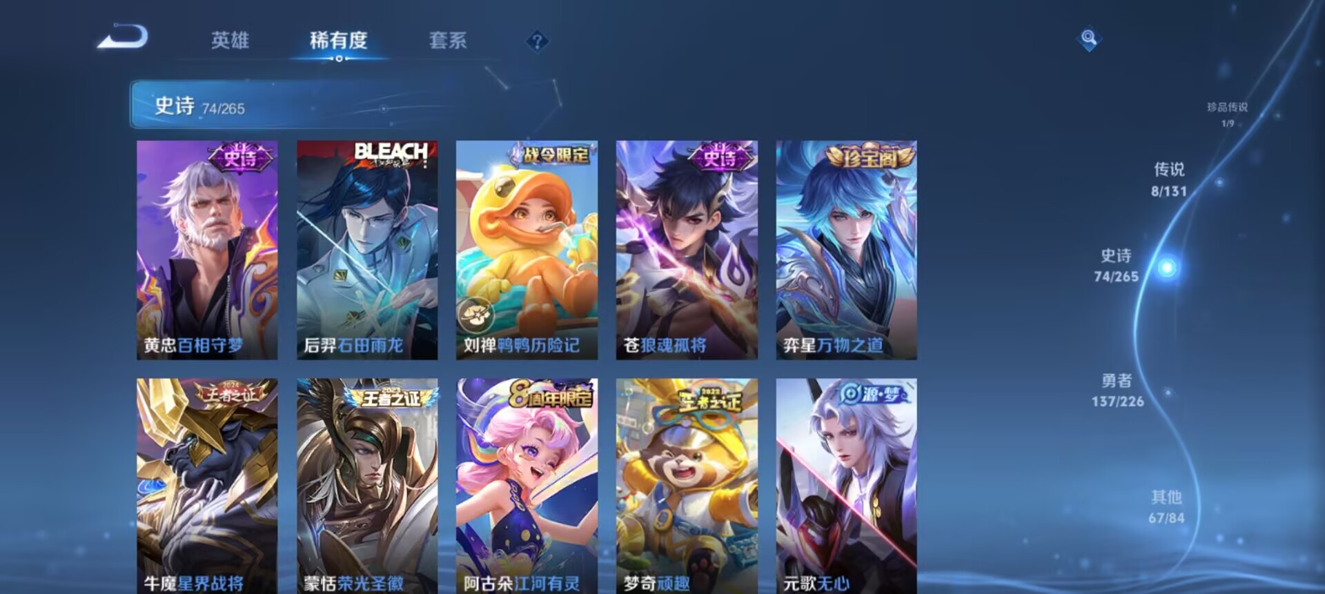 126英雄-288皮肤-珍品传说1 典藏1 传说8 史诗74 限定94 英雄126 皮肤288 稀有英雄9 贵族0级 总场次10858 皮肤价值: 【珍品传说1】 宫本武藏黑崎一护 【荣耀典藏1】 李白鸣剑曳影 【传说皮肤8】 宫本武藏地狱之眼 后羿神树通天 诸葛亮鹤羽星尊 达摩黄金狮子座 桑启鸣野蒿 澜逐花归