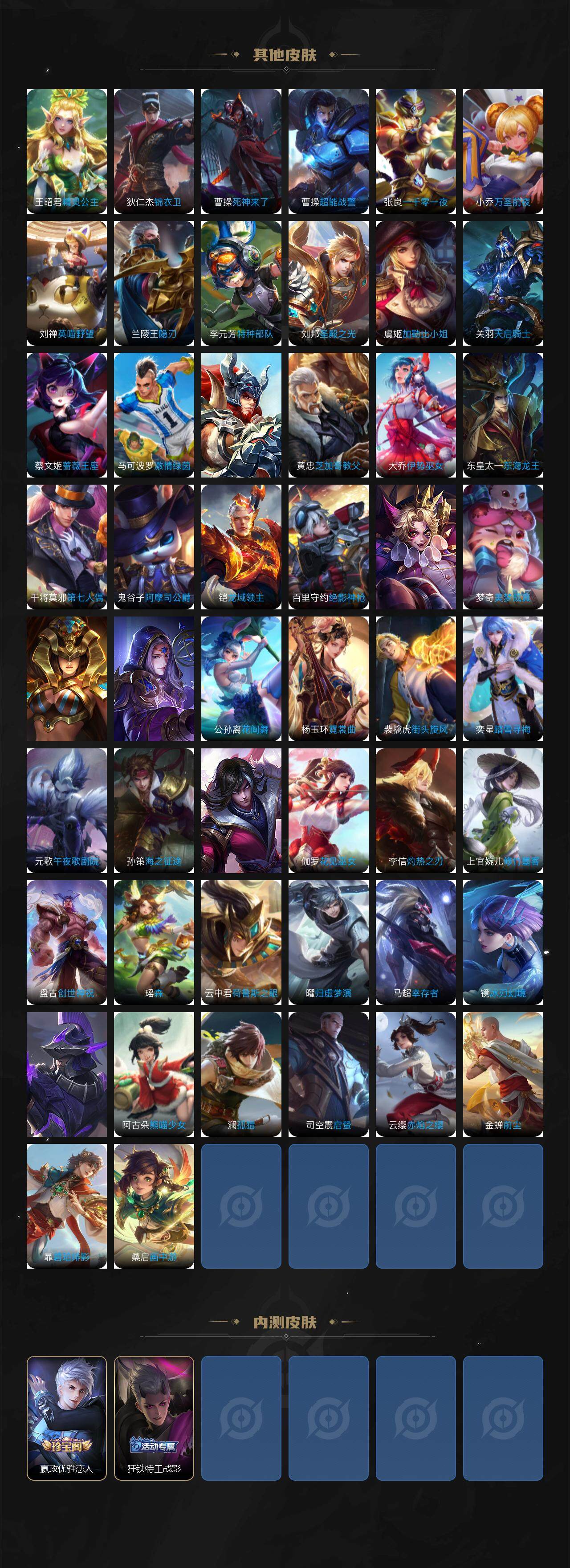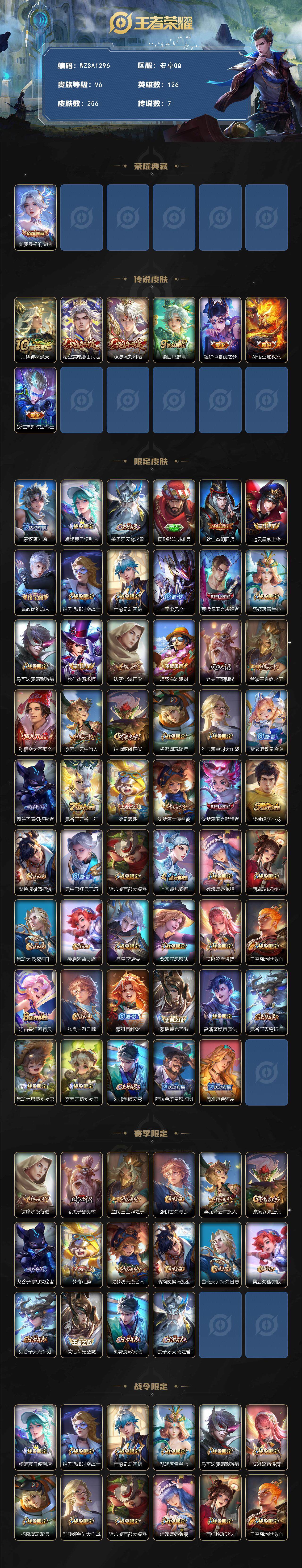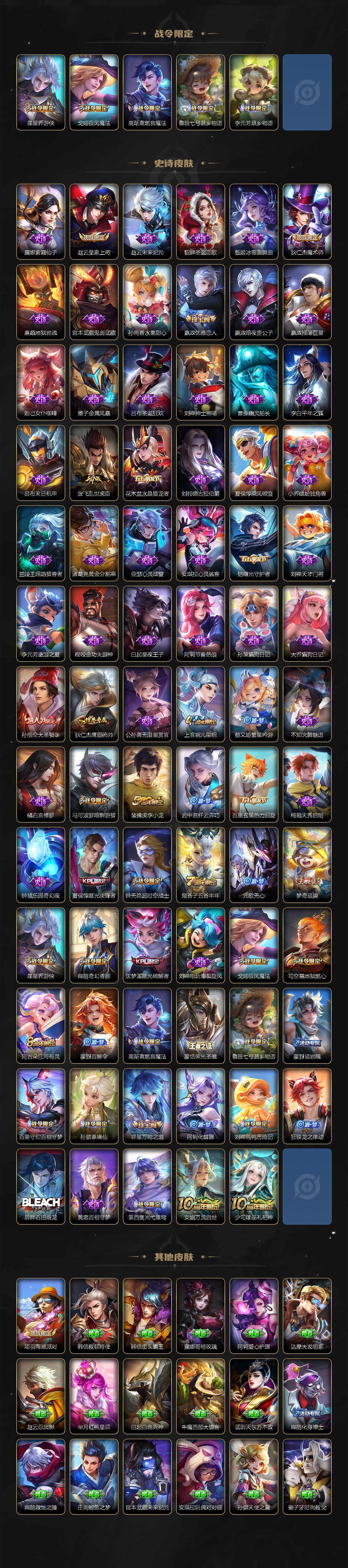 【wzsa1296】贵族6/皮肤256/典藏1/传说7/史诗77/英雄126/刘禅全皮/孙权全皮/鬼谷子全皮/蒙恬全皮/司空震全皮/戈娅全皮/伽罗最初的交响/后羿神树通天/司空震愿照山河定/澜愿照九州拓/桑启鸣野蒿/貂蝉仲夏夜之梦/孙悟空地狱火/狄仁杰超时空战士/蒙犽顽岩魄/虞姬夏日便利店/姜子牙天穹之誓/杨戬破阵退雄兵/狄仁杰阴阳师/赵云皇家上将/嬴政优雅恋人/钟无艳超时空战士/扁鹊奇幻香踪/元歌无心/夏侯惇匿光决锋者/甄姬落雪兰心/马可波罗暗影游猎/狄仁杰魔术师/达摩沙漠行僧/项羽海滩派对/老夫子醍醐杖/兰陵王金庭之子/孙悟空大圣娶亲/李元芳云中旅人/钟馗驱傩正仪/杨戬潮玩骑兵/雅典娜单词大作战/蔡文姬繁星吟游/鬼谷子原初探秘者/鬼谷子五谷丰年/梦奇顽趣/沈梦溪大漠名商/沈梦溪匿光破解者/裴擒虎李小龙/裴擒虎擒涛扼浪/云中君纤云弄巧/猪八戒西部大镖客/上官婉儿梁祝/嫦娥暖冬兔眠/西施玲珑珍味/鲁班大师探海日志/桑启海盐诗旅/暃星界游侠/戈娅驭风魔法/艾琳流音漫舞/司空震地狱燃心/阿古朵江河有灵/张良古海寻踪/蒙犽百解令/蒙恬荣光圣徽/高渐离燃音魔法/鬼谷子天穹祈灯/鲁班七号蔬乡物语/李元芳蔬乡物语/刘邦剑破天穹/程咬金群星魔术团/周瑜熔金海岸/露娜紫霞仙子/赵云未来纪元/貂蝉圣诞恋歌/甄姬冰雪圆舞曲/廉颇地狱岩魂/宫本武藏鬼剑武藏/孙尚香水果甜心/嬴政暗夜贵公子/嬴政摇滚巨星/妲己女仆咖啡/墨子金属风暴/吕布圣诞狂欢/刘禅绅士熊喵/曹操幽灵船长/李白千年之狐/吕布末日机甲/张飞乱世虎臣/花木兰水晶猎龙者/刘邦德古拉伯爵/夏侯惇乘风破浪/小乔缤纷独角兽/兰陵王暗隐猎兽者/诸葛亮黄金分割率/亚瑟心灵战警/安琪拉心灵骇客/铠曙光守护者/刘禅天才门将/李元芳逐浪之夏/程咬金功夫厨神/白起星夜王子/阿轲节奏热浪/孙策猫狗日记/大乔猫狗日记/狄仁杰鹰眼统帅/公孙离无限星赏官/不知火舞魅语/橘右京修罗/百里玄策热力回旋/杨戬天秀启明/钟馗乐园奇幻夜/刘禅电玩爆裂旋风/百里守约百相守梦/孙膑茶境仙/弈星万物之道/阿轲化蝶舞/刘禅鸭鸭历险记/狂铁龙之律动/后羿石田雨龙/黄忠百相守梦/莱西奥光弋星穹/女娲万灵启世/少司缘巫礼祀神/韩信教廷特使/韩信街头霸王/露娜哥特玫瑰/阿轲爱心护理/达摩大发明家/赵云忍炎影/芈月红桃皇后/白起白色死神/牛魔西部大镖客/武则天东方不败/扁鹊化身博士/扁鹊救世之瞳/庄周鲤鱼之梦/宫本武藏未来纪元/安琪拉玩偶对对碰/孙膑天使之翼/姜子牙时尚教父/妲己少女阿狸/典韦黄金武士/花木兰兔女郎/张飞五福同心/甄姬花好人间/刘备万事如意/后羿阿尔法小队/关羽龙腾万里/墨子进击墨子号/钟无艳海滩丽影/老夫子功夫老勺/孙尚香沉稳之力/诸葛亮掌控之力/李白敏锐之力/鬼谷子幻乐之宴/苏烈坚韧之力/大乔守护之力/明世隐虹云星官/孙膑归虚梦演/沈梦溪鲨炮海盗猫/姜子牙炽热元素使/哪吒次元突破/盾山圆桌骑士/狂铁特工战影/刘禅秘密基地/张良缤纷绘卷/盘古重装意志/鲁班大师乓乓大师/程咬金无双福将/刘禅唤灵魔甲/米莱狄契约魔法/蒙恬蔚蓝守将/戈娅危途狂花/海月幻泉雾影/猪八戒潮玩探月行/赵怀真太极少年/太乙真人劲辣红锅/莱西奥西部游侠/李元芳妄想特派/钟无艳聚星闪耀/亚连破局者/海诺时空谍影/廉颇功夫炙烤/大司命暗都幽影/东皇太一噬灭天穹/老夫子百相守梦/干将莫邪雾都夜雨/苍苍林狼骑/太乙真人谧流熔炉/典韦铁骨偃魂/马超访茗客/西施雪境奇遇/姜子牙星梦巡礼/少司缘灵卦秘语/明世隐景韶洛都/戈娅玫蓝誓约/刘备浪漫序章/钟馗虚灵犬护/沈梦溪鸭鸭历险记/苏烈春野闲踪/白起死霸装/甄姬逆浪荇歌/莱西奥踏浪烽翎/鬼谷子克喵/桑启青衿临川/哪吒罗小黑战记/亚瑟荣光之誓/明世隐往忆晖光/孙权径山谋武/艾琳鹤鸣心笺/鲁班七号福禄兄弟/鲁班七号木偶奇遇记/高渐离金属狂潮/钟无艳生化警戒/貂蝉异域舞娘/王昭君精灵公主/狄仁杰锦衣卫/曹操死神来了/曹操超能战警/张良一千零一夜/小乔万圣前夜/刘禅英喵野望/兰陵王隐刃/李元芳特种部队/刘邦圣殿之光/虞姬加勒比小姐/关羽天启骑士/蔡文姬蔷薇王座/马可波罗激情绿茵/苍维京掠夺者/黄忠芝加哥教父/大乔伊势巫女/东皇太一东海龙王/干将莫邪第七人偶/鬼谷子阿摩司公爵/铠龙域领主/百里守约绝影神呛/百里玄策威尼斯狂欢/梦奇美梦成真/女娲尼罗河女神/明世隐占星师/公孙离花间舞/杨玉环霓裳曲/裴擒虎街头旋风/弈星踏雪寻梅/元歌午夜歌剧院/孙策海之征途/司马懿魇语军师/伽罗花见巫女/李信灼热之刃/上官婉儿修竹墨客/盘古创世神祝/瑶森/云中君荷鲁斯之眼/曜归虚梦演/马超幸存者/镜冰刃幻境/蒙恬秩序猎龙将/阿古朵熊喵少女/澜孤猎/司空震启蛰/云缨赤焰之缨/金蝉前尘/暃碧珀绯影/桑启画中游