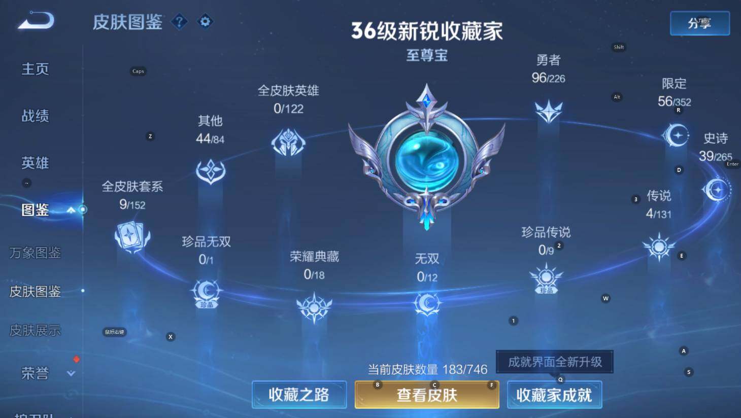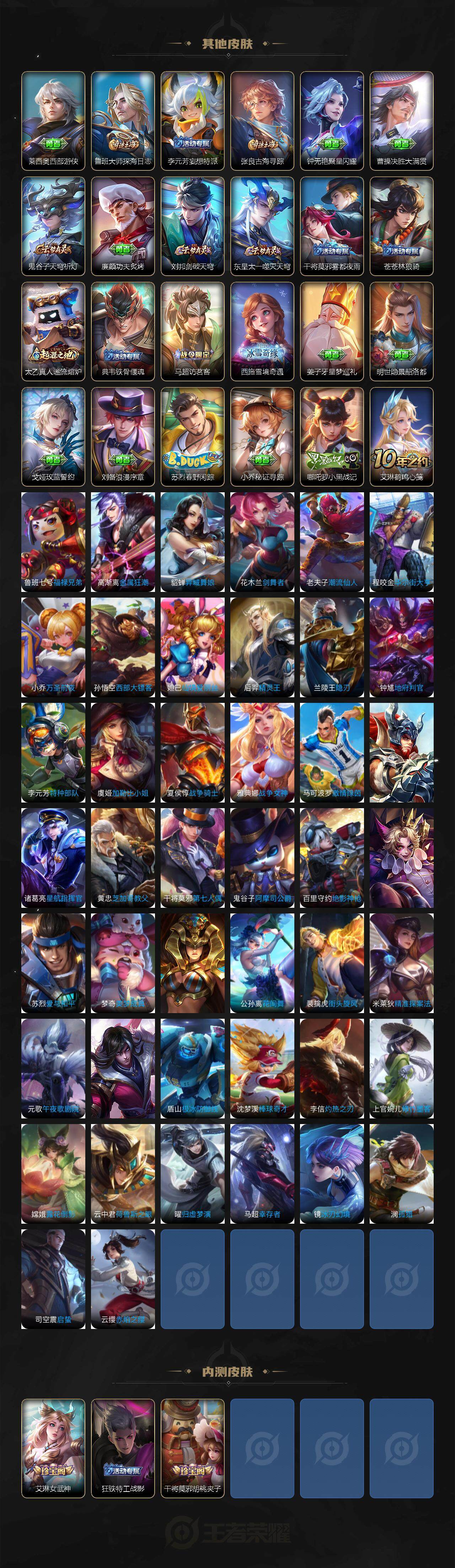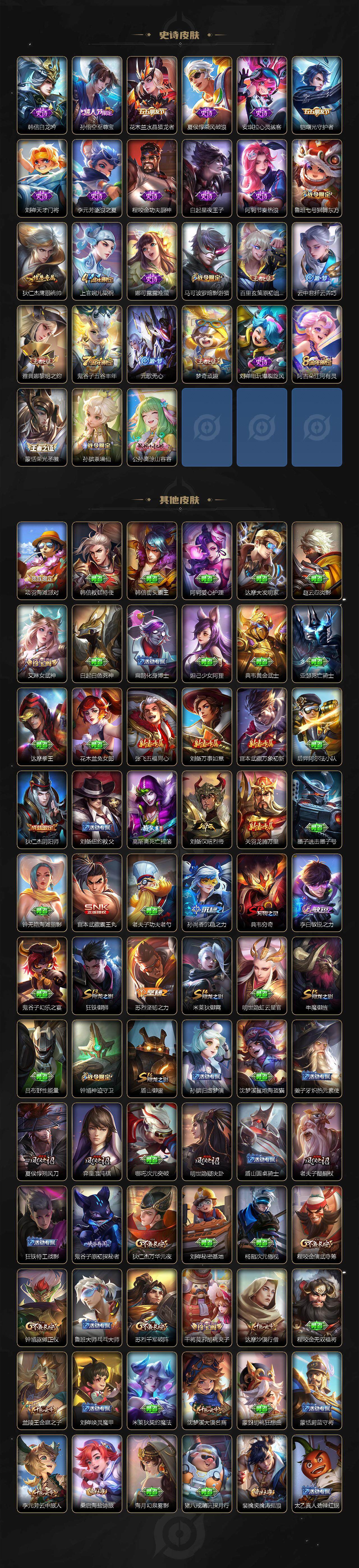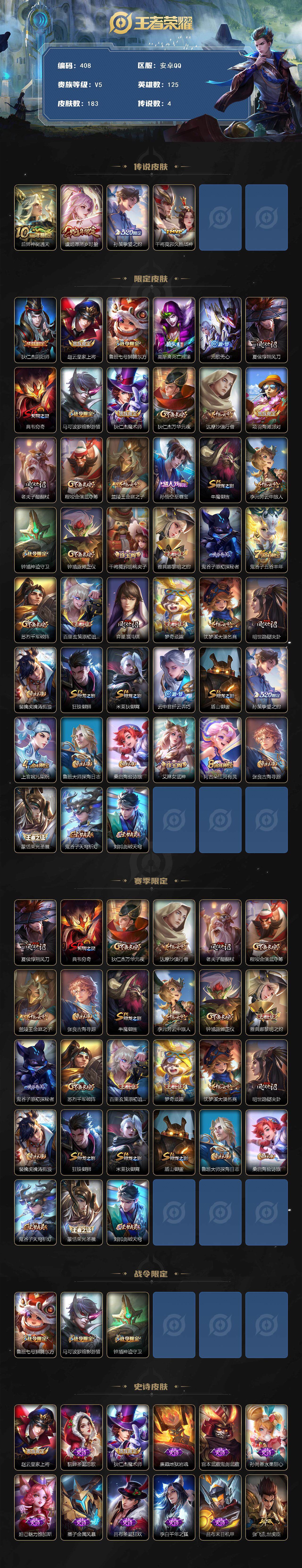 125英雄-183皮肤-贵族5/皮肤183/传说4/史诗39/英雄125/神树通天 后羿/愿照·岁时盈 虞姬/挚爱之约 孙策/久胜战神 干将莫邪/阴阳师 狄仁杰/皇家上将 赵云/狮舞东方 鲁班七号/死亡摇滚 高渐离/无心 元歌/朔风刀 夏侯惇/穷奇 典韦/暗影游猎 马可波罗/魔术师 狄仁杰/万华元夜 狄仁杰/沙漠行僧 达摩/海滩派对 项羽/醍醐杖 老夫子/演武夺筹 程咬金/金庭之子 兰陵王/至尊宝 孙悟空/御旌 牛魔