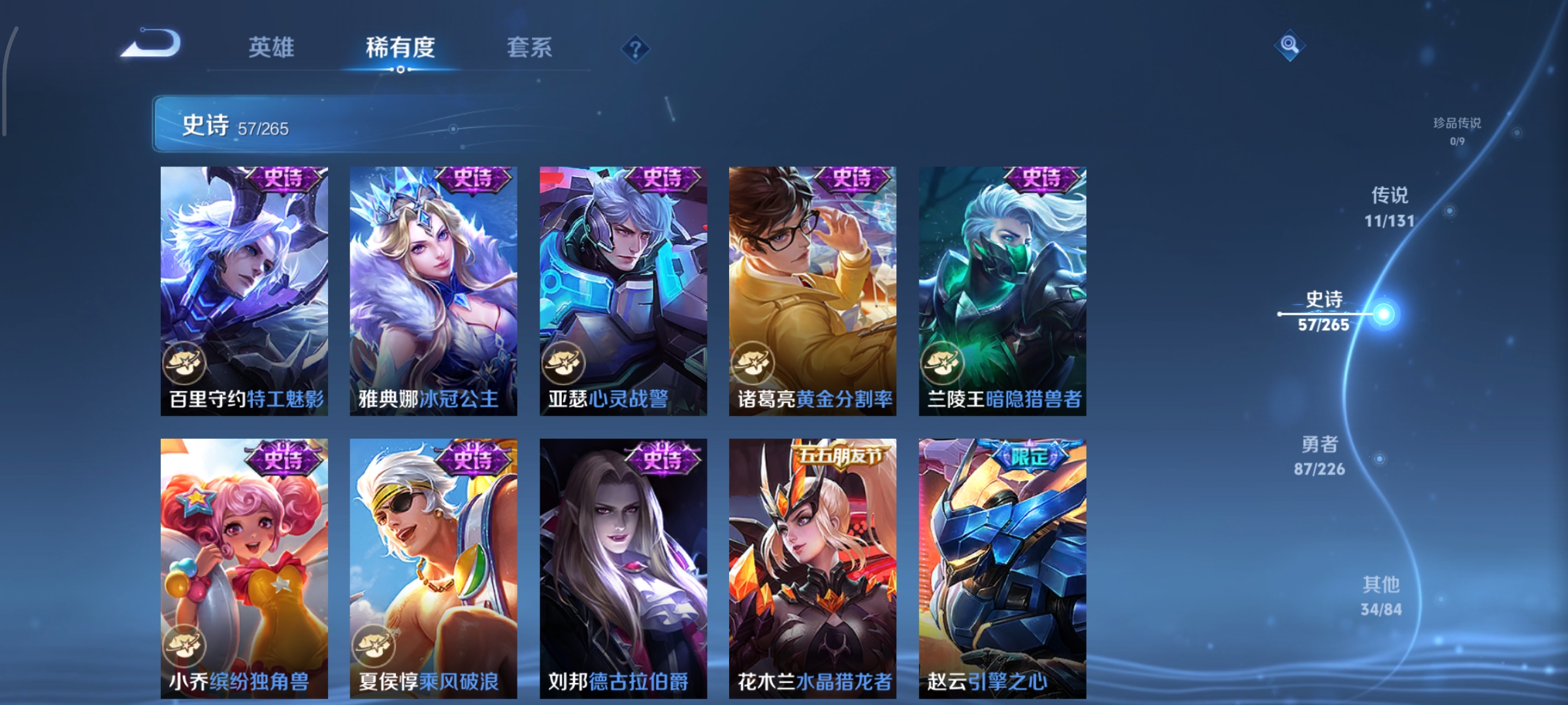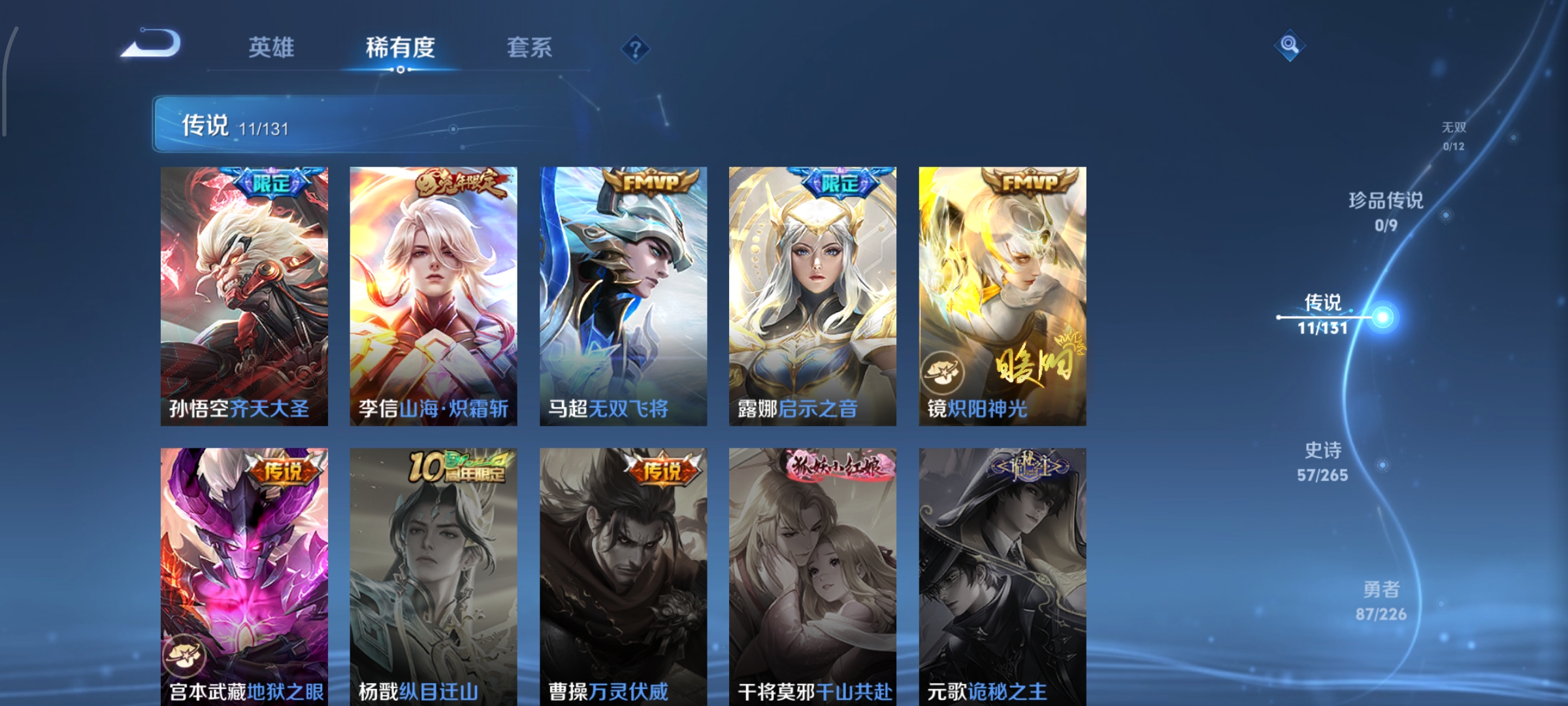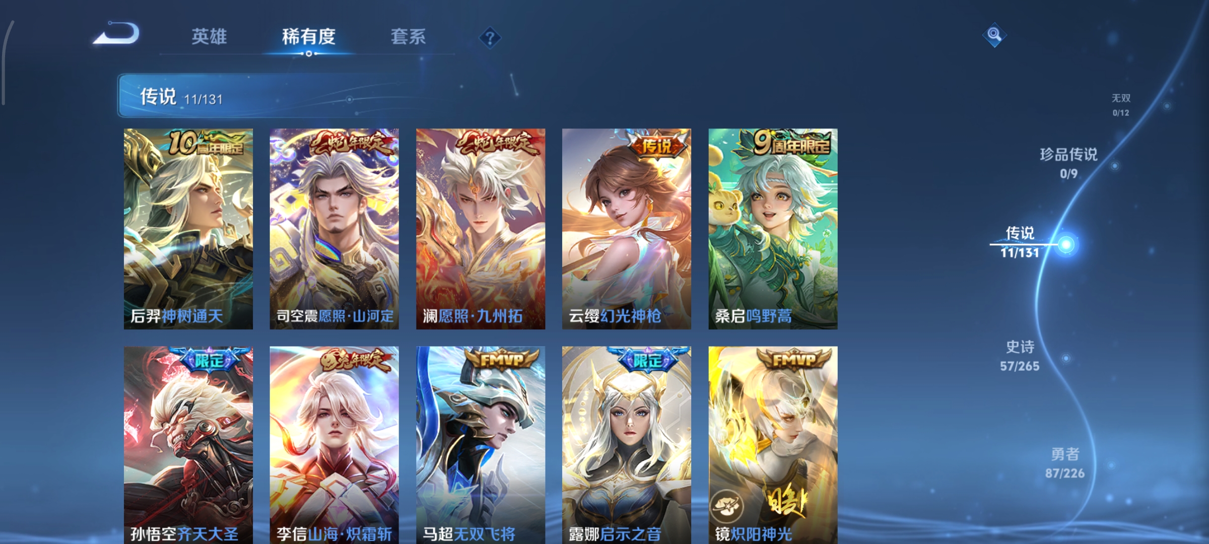125英雄-190皮肤-打野35段,天鹅之梦,11传说,炽阳神光无双飞将山海·炽霜斩启示之音齐天大圣地狱之眼鸣野蒿幻光神呛愿照·山河定愿照·九州拓神树通天,编号:sxtxo15