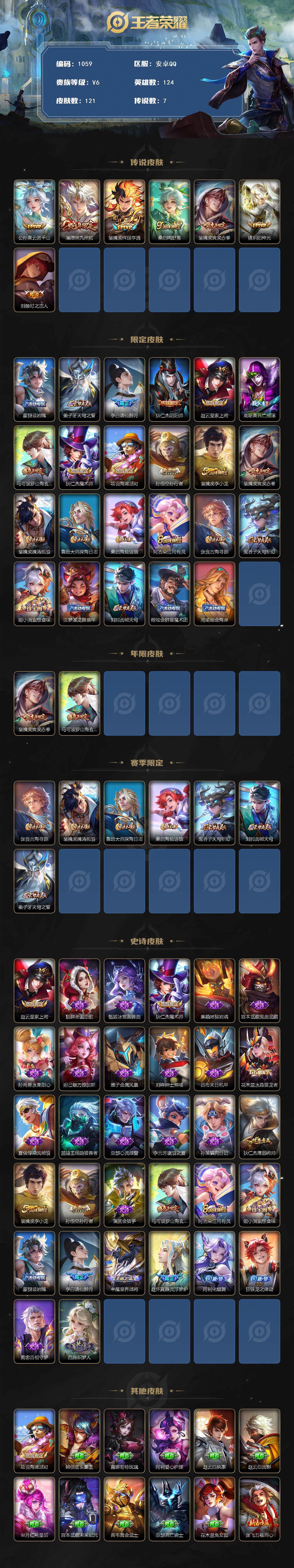 124英雄-121皮肤-【mj秒换绑 赤拳 7传说打野号】安卓q-v6-至尊星耀ii段位-124英雄-121皮肤-7传说-32史诗 【英雄全皮】:影全皮 【传说皮肤】:公孙离云诺千山,澜愿照九州拓,裴擒虎祥瑞亨通,桑启鸣野蒿,裴擒虎寅虎赤拳,镜炽阳神光,刘备时之恋人 【限定皮肤】:蒙犽顽岩魄,姜子牙天穹之誓,李白谪仙醉月,狄仁杰阴阳师,赵云皇家上将,高渐离死亡摇滚,马可波罗山海玄木吟,狄仁杰魔术师,项羽海滩派对,孙悟