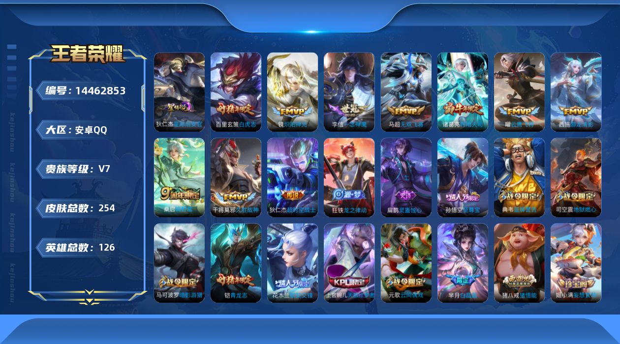 [14462853]v7-124英雄-247皮肤-10传说-67史诗,,,,,sa1062 【内测皮肤】:艾琳女武神,狂铁特工战影 【传说皮肤】:狄仁杰超时空战士,百里玄策白虎志,干将莫邪久胜战神,李信一念神魔,曜云鹰飞将,镜炽阳神光,诸葛亮时雨天司,西施游龙清影,马超无双飞将,桑启鸣野蒿 【限定皮肤】:白起狰,蔡文姬夏日便利店,大乔绒语心约,虞姬夏日便利店,姜子牙天穹之誓,狄仁杰阴阳师,赵云皇家上将,墨子神迹守卫,嬴政白昼王子,鲁班七号狮舞东方,庄周高山流水,钟无艳王者之锤,孙膑天狼运算者,白起夜都怪侠,芈月重明,芈月白晶晶,芈月幻夜卜梦,吕布猎兽之王,元歌云间偶戏,夏侯惇朔风刀,曹操烛龙,典韦穷奇,典韦蓝屏警告,马可波罗暗影游猎,狄仁杰魔术师,狄仁杰万华元夜,达摩沙漠行僧,项羽海滩派对,老夫子醍醐杖,老夫子航海奇遇记,程咬金演武夺筹,露娜一生所爱,韩信飞衡,兰陵王金庭之子,花木兰默契交锋,亚瑟潮玩骑士王,孙悟空至尊宝,牛魔御旌,李元芳云中旅人,虞姬霸王别姬,钟馗神迹守卫,钟馗驱傩正仪,女娲朔望之晖,雅典娜单词大作战,雅典娜黎明之约,蔡文姬繁星吟游,太乙真人饕餮,鬼谷子原初探秘者,鬼谷子五谷丰年,诸葛亮时雨天司,黄忠火炮绅士,铠青龙志,苏烈千军破阵,百里玄策白虎志,百里玄策原初追逐者,弈星混沌棋,梦奇顽趣,沈梦溪大漠名商,明世隐疑决卦,裴擒虎李小龙,裴擒虎擒涛扼浪,狂铁御狮,米莱狄御霄,云中君纤云弄巧,盾山御銮,猪八戒西部大镖客,猪八戒猪悟能,上官婉儿梁祝,上官婉儿天狼绘梦者,蒙犽狂想玩偶喵,鲁班大师探海日志,桑启海盐诗旅,艾琳女武神,艾琳流音漫舞,司空震地狱燃心,张良古海寻踪,蒙恬荣光圣徽,鬼谷子天穹祈灯,姬小满妄想食味,沈梦溪龙舞盛年,刘邦剑破天穹,程咬金群星魔术团,镜青焰无极,项羽苍威无极,芈月浮光幕影,周瑜熔金海岸 【年限皮肤】:百里玄策白虎志,铠青龙志,诸葛亮时雨天司,韩信飞衡 【赛季限定】:白起狰,芈月重明,夏侯惇朔风刀,曹操烛龙,典韦穷奇,狄仁杰万华元夜,达摩沙漠行僧,老夫子醍醐杖,程咬金演武夺筹,兰陵王金庭之子,张良古海寻踪,牛魔御旌,李元芳云中旅人,钟馗驱傩正仪,雅典娜黎明之约,太乙真人饕餮,鬼谷子原初探秘者,苏烈千军破阵,百里玄策原初追逐者,弈星混沌棋,梦奇顽趣,沈梦溪大漠名商,明世隐疑决卦,裴擒虎擒涛扼浪,狂铁御狮,米莱狄御霄,盾山御銮,鲁班大师探海日志,桑启
