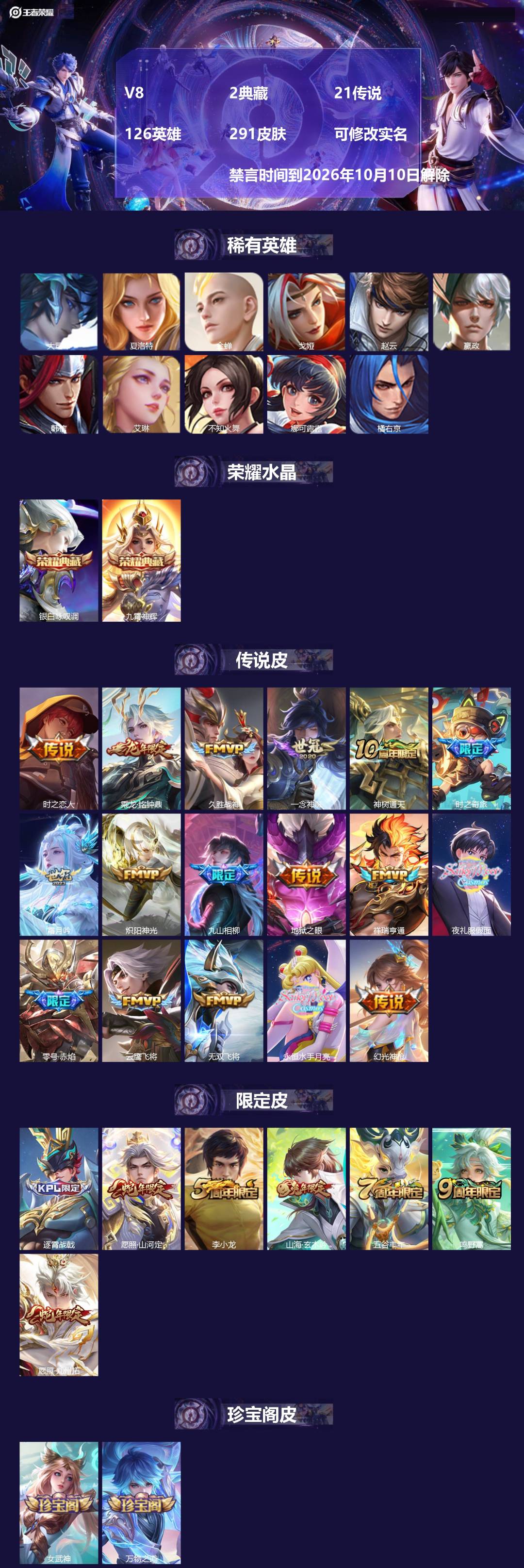 v8 2典藏 21传说 126英雄 291皮肤 可修改实名 禁言时间到2026年10月10日解除 【英雄全皮】:司空震全皮戈娅全皮赵怀真全皮 【稀有英雄】:大司命嬴政始皇帝韩信韩跳跳夏洛特夏师傅艾琳橘右京橘子娜可露露鸟人不知火舞赵云金蝉唐僧戈娅 【荣