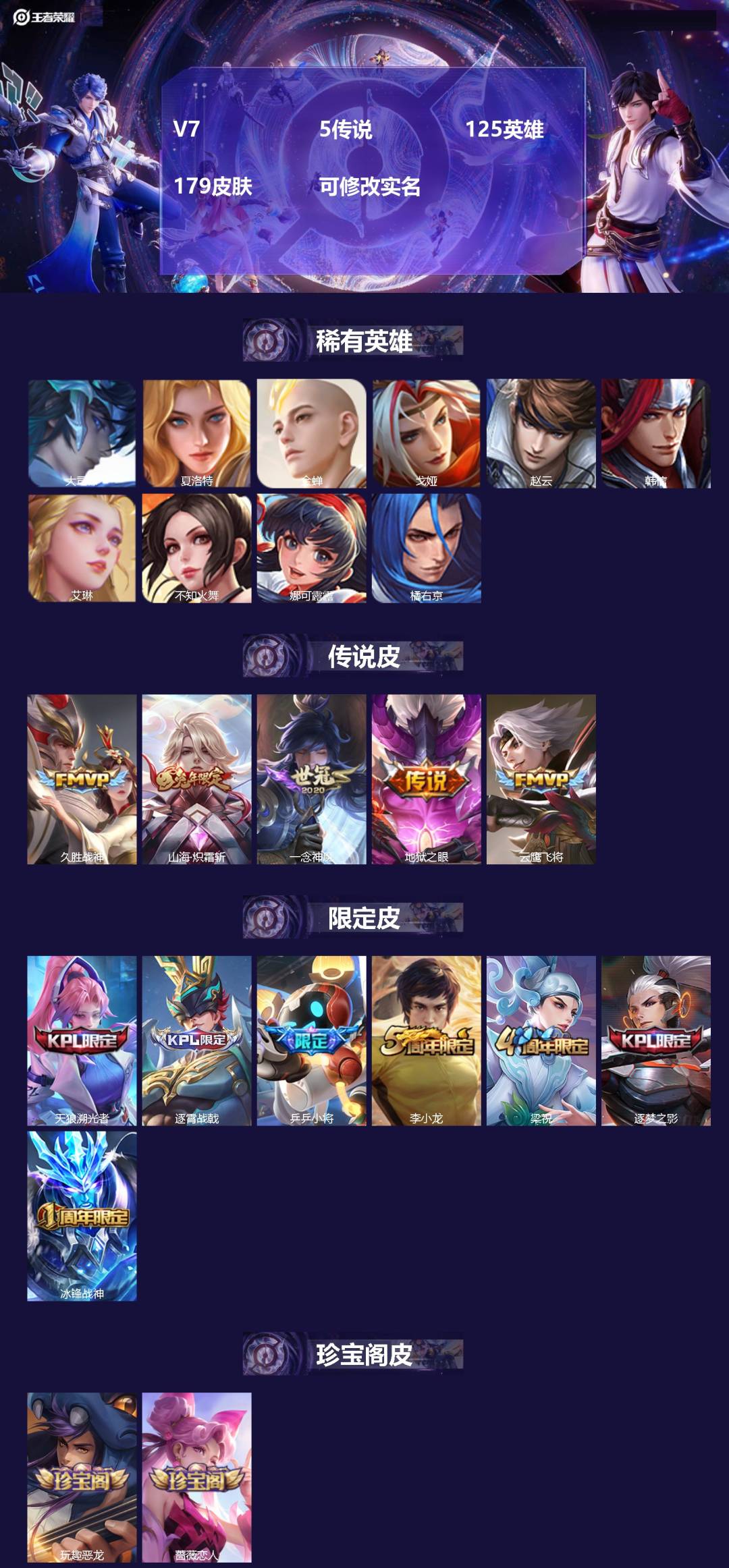 [14463144]v7 5传说 125英雄 179皮肤 可修改实名 【英雄全皮】:李信全皮影全皮 【稀有英雄】:大司命韩信韩跳跳夏洛特夏师傅艾琳橘右京橘子娜可露露鸟人不知火舞赵云金蝉唐僧戈娅 【传说皮】:山海·炽霜斩李信年限地狱之眼一念神魔久胜战