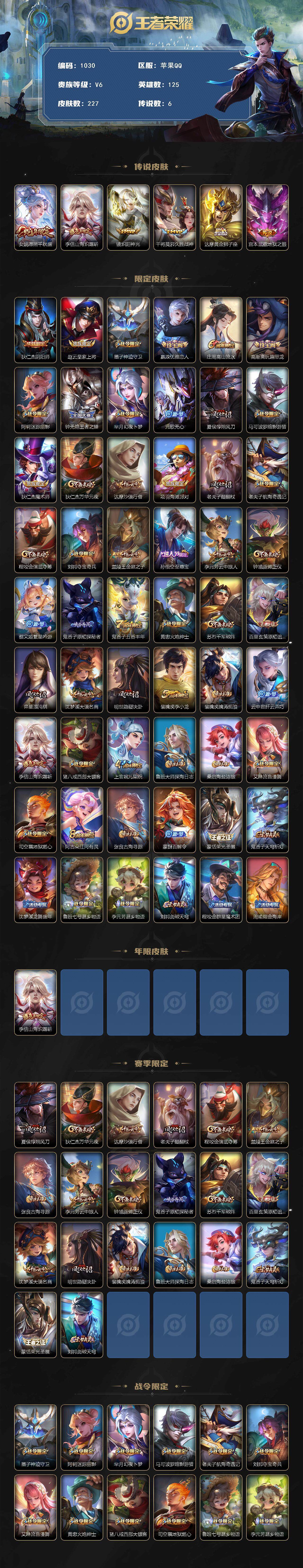 125英雄-227皮肤-【苹果 mj秒换绑 金标孙悟空 金标曹操 金标孙策 金标达摩 金标老夫子 对抗路34段 银标李信 银标夏洛特 银标马可波罗 对抗路34段 6传说 v6 】苹果q-v6-最强王者段位-125英雄-227皮肤-0典藏-0珍品无双-0无双-0珍品传说-6传说-53史诗 【英雄全皮】:蒙恬全皮 【传说皮肤】:女娲愿照千秋盛,李信山海炽霜斩,镜炽阳神光,干将莫邪久胜战神,达摩黄金狮子座,宫本武藏地