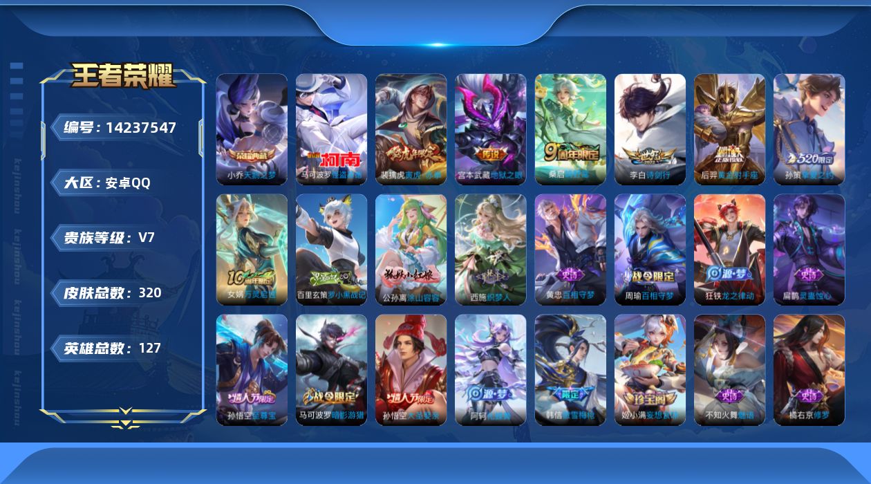 127英雄-320皮肤-v7 1典藏 1珍品传说 6传说 127英雄 320皮肤 可修改实名 女号 【英雄全皮】:敖隐全皮孙权全皮鬼谷子全皮影全皮 【稀有英雄】:敖隐小龙人大司命嬴政始皇帝韩信韩跳跳夏洛特夏师傅艾琳橘右京橘子娜可露露鸟人不知火舞赵云金蝉唐僧戈娅 【荣耀