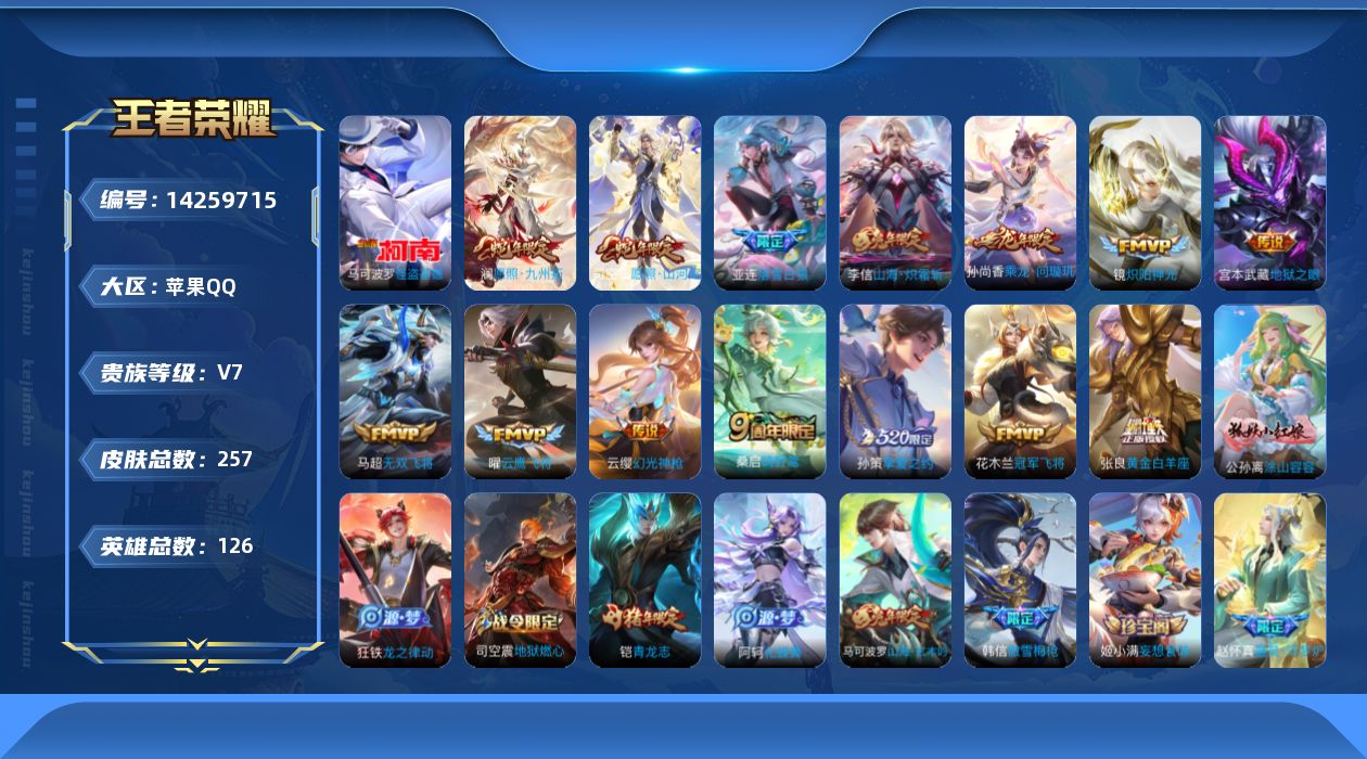 126英雄-257皮肤-v7 1珍品传说 14传说 126英雄 257皮肤 可修改实名 【英雄全皮】:司空震全皮影全皮戈娅全皮 【稀有英雄】:敖隐小龙人大司命韩信韩跳跳夏洛特夏师傅艾琳橘右京橘子娜可露露鸟人不知火舞赵云金蝉唐僧戈娅 【珍品传说】:怪盗基德 【传说皮】:乘龙·