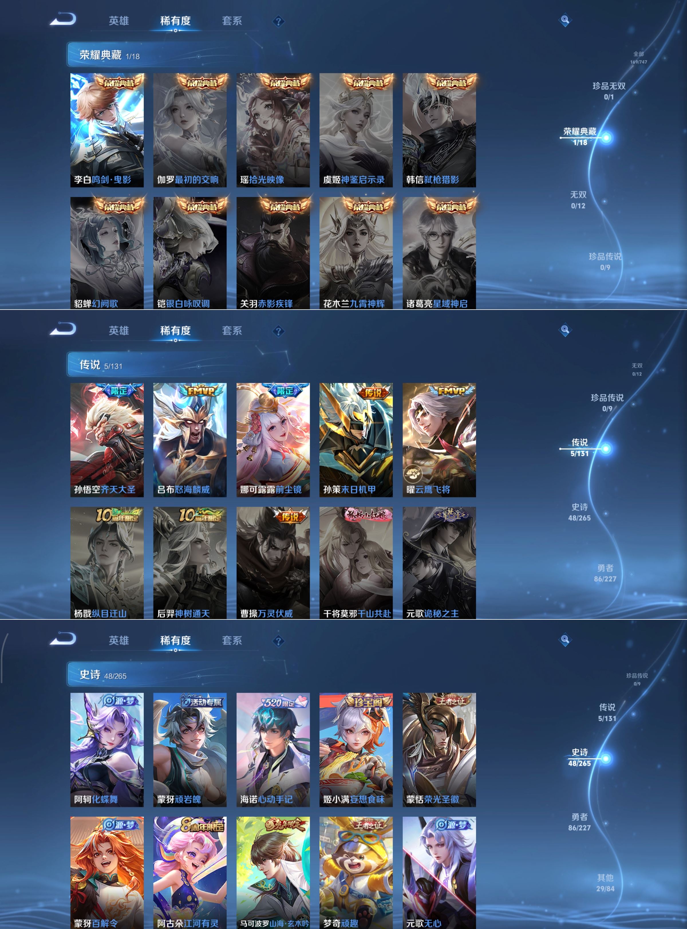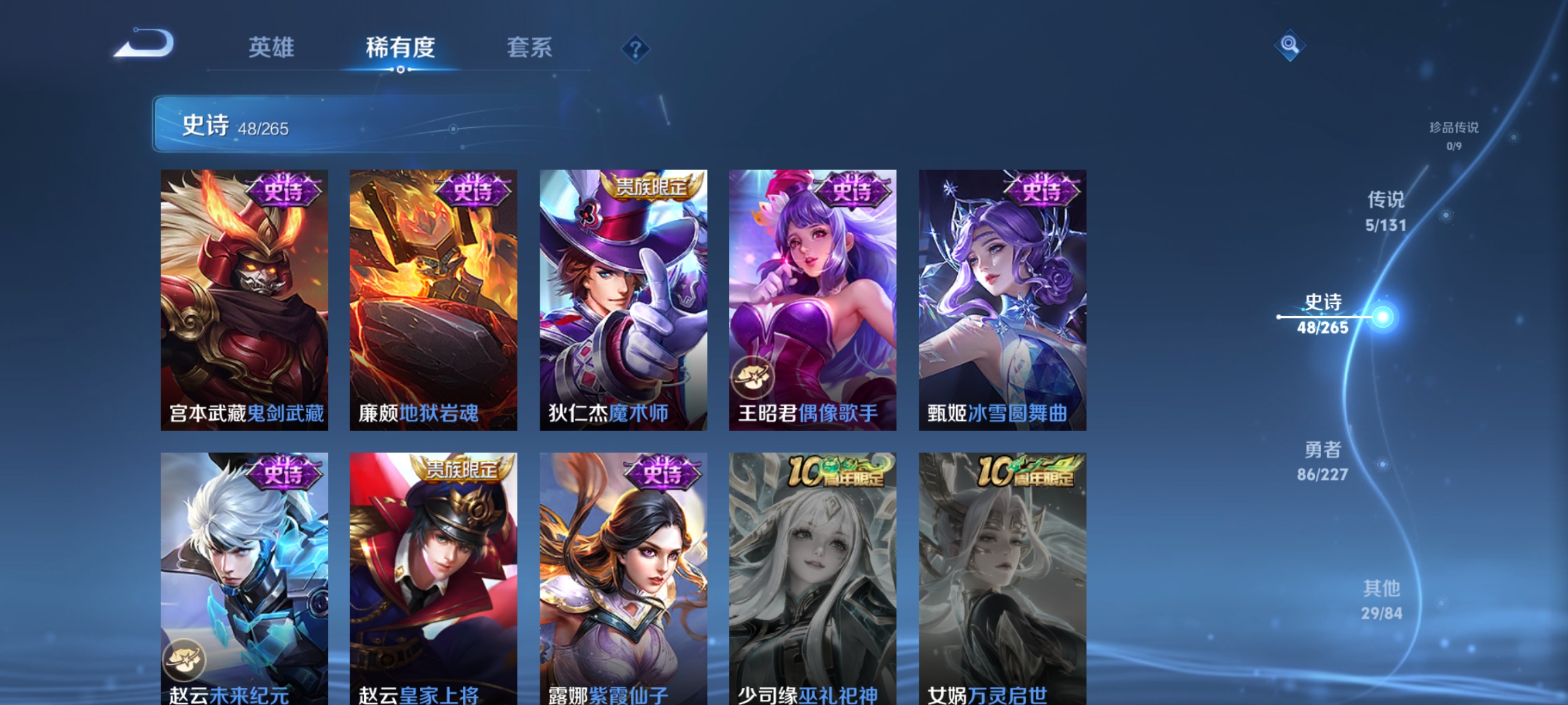 126英雄-169皮肤-【v7 典藏1 5传说 金标万战廉颇金标墨子】安卓q-169皮肤-126英雄 【典藏皮肤】 鸣剑·曳影 【传说皮肤】齐天大圣 末日机甲 云鹰飞将 怒海麟威 【史诗皮肤】 冰锋战神 山海·玄木吟 心动手记 江河有灵 完美运算 百解令 荣光圣徽 顽岩魄 化蝶舞 超时空战士 顽趣 幽灵船长 繁星吟游 功夫厨神 魅力维加斯 魔术师 鹰眼统帅 鬼剑武藏 水晶猎龙者 暗隐猎兽者 逐浪之夏
