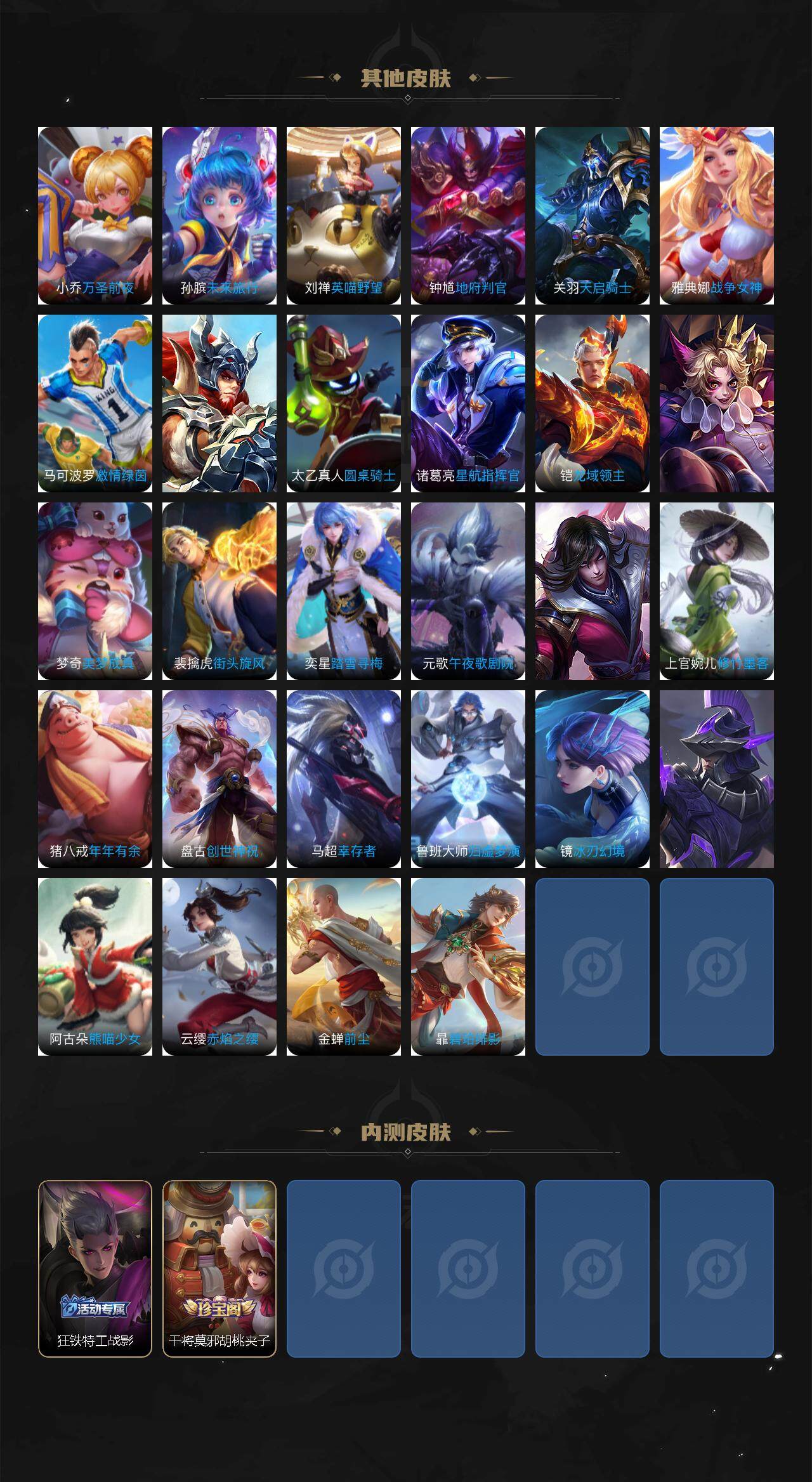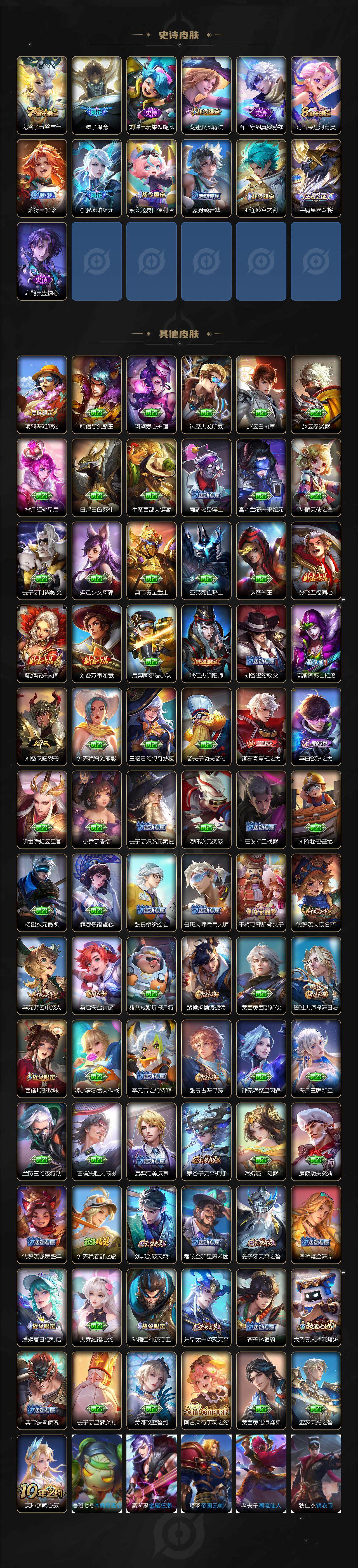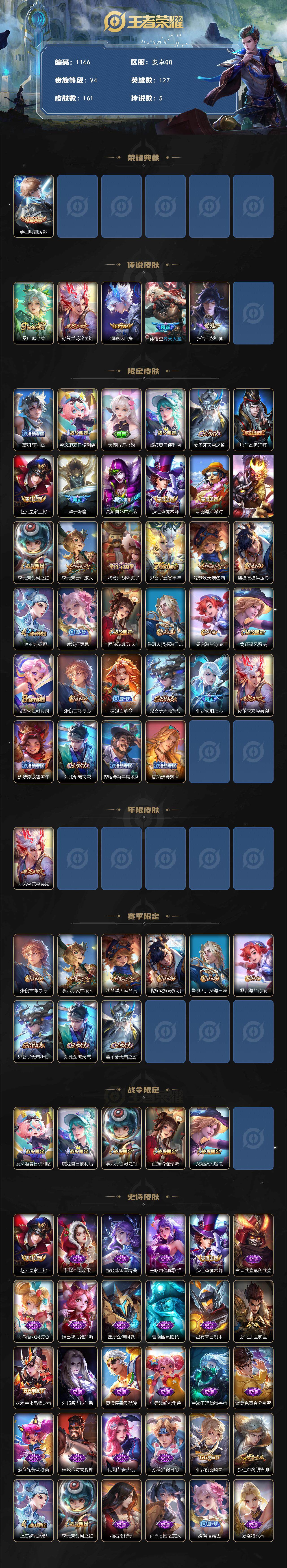 127英雄-161皮肤-贵族4/皮肤161/典藏1/传说5/史诗43/英雄127/鸣剑·曳影 李白/鸣野蒿 桑启/乘龙·淬吴钩 孙策/逐花归海 澜/齐天大圣 孙悟空/一念神魔 李信/顽岩魄 蒙犽/夏日便利店 蔡文姬/绒语心约 大乔/夏日便利店 虞姬/天穹之誓 姜子牙/阴阳师 狄仁杰/皇家上将 赵云/降魔 墨子/死亡摇滚 高渐离/魔术师 狄仁杰/海滩派对 项羽/银河之约 李元芳/云中旅人 李元芳/胡桃夹子 干将莫邪/五