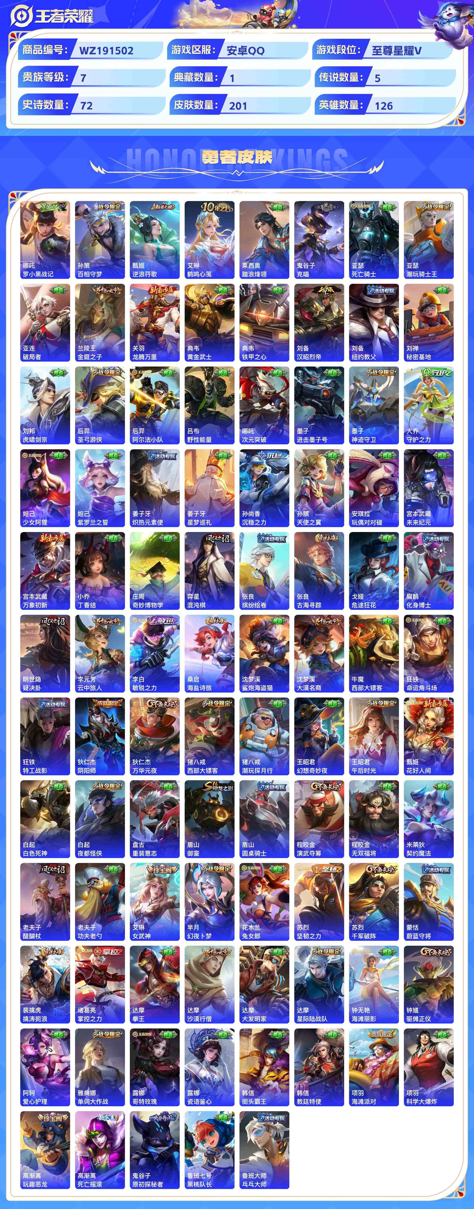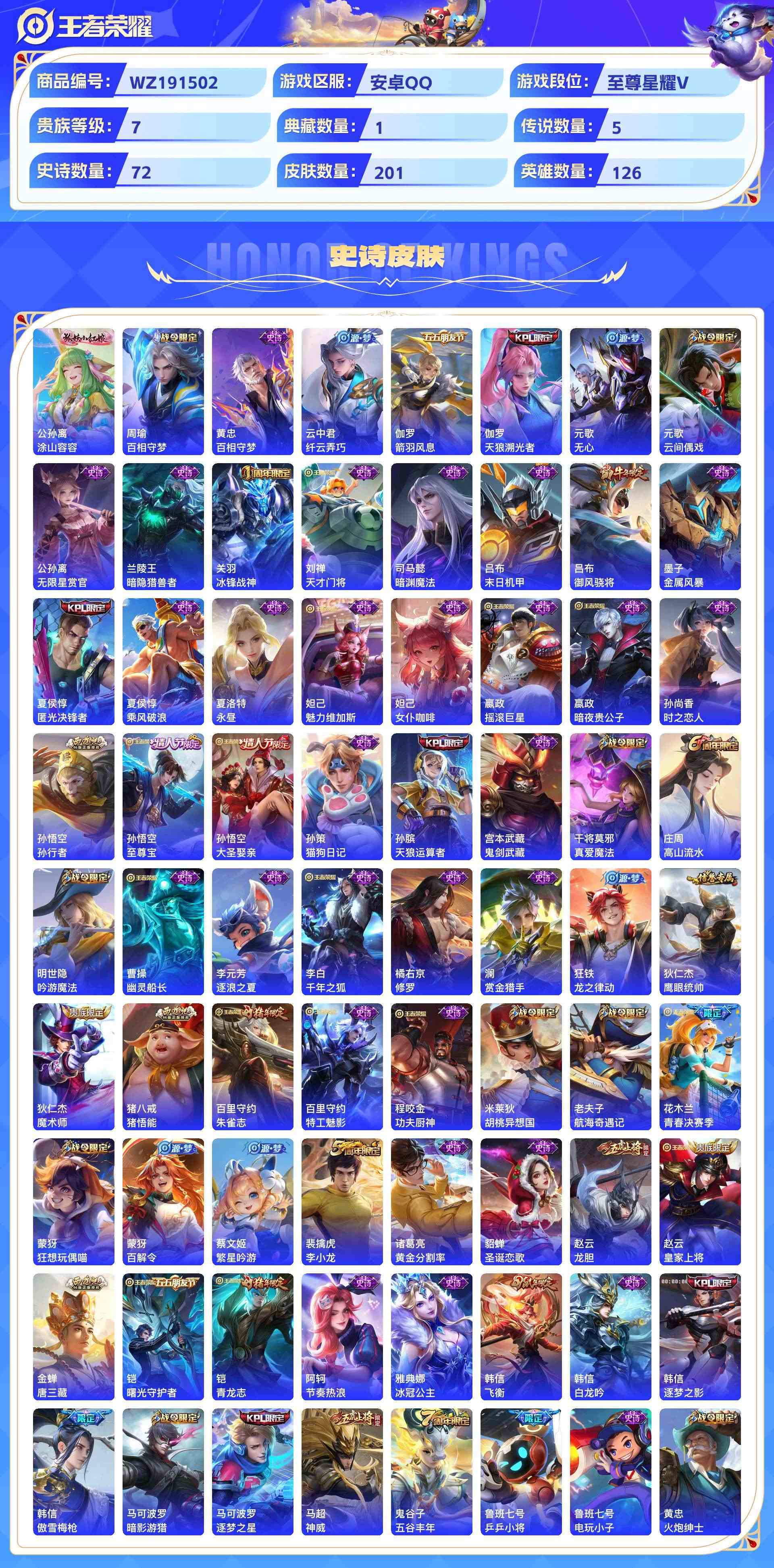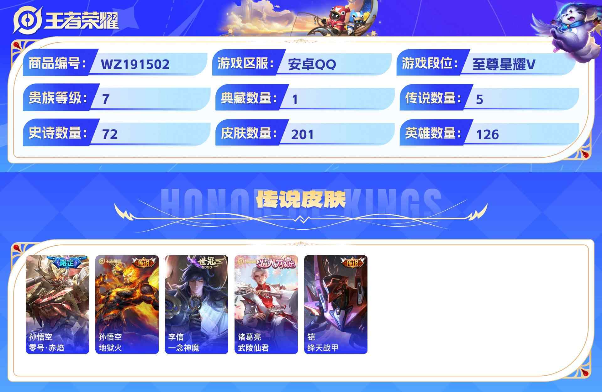 wz191502|精品野王小号低价出!!!可二次安卓qq 贵族7级 201皮1典藏 5传说 72史诗1个性按键1天幕【荣耀典藏】全息碎影
