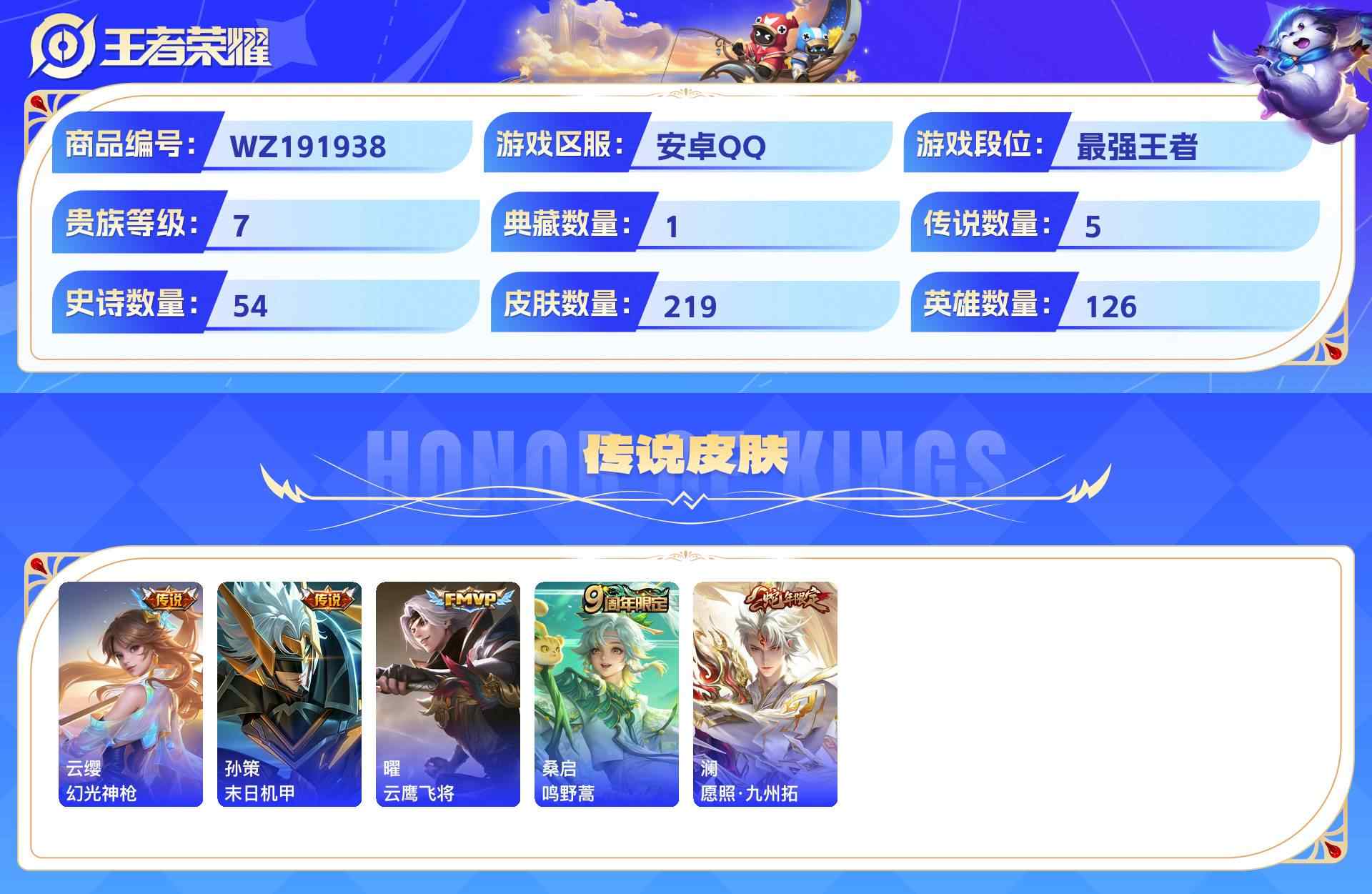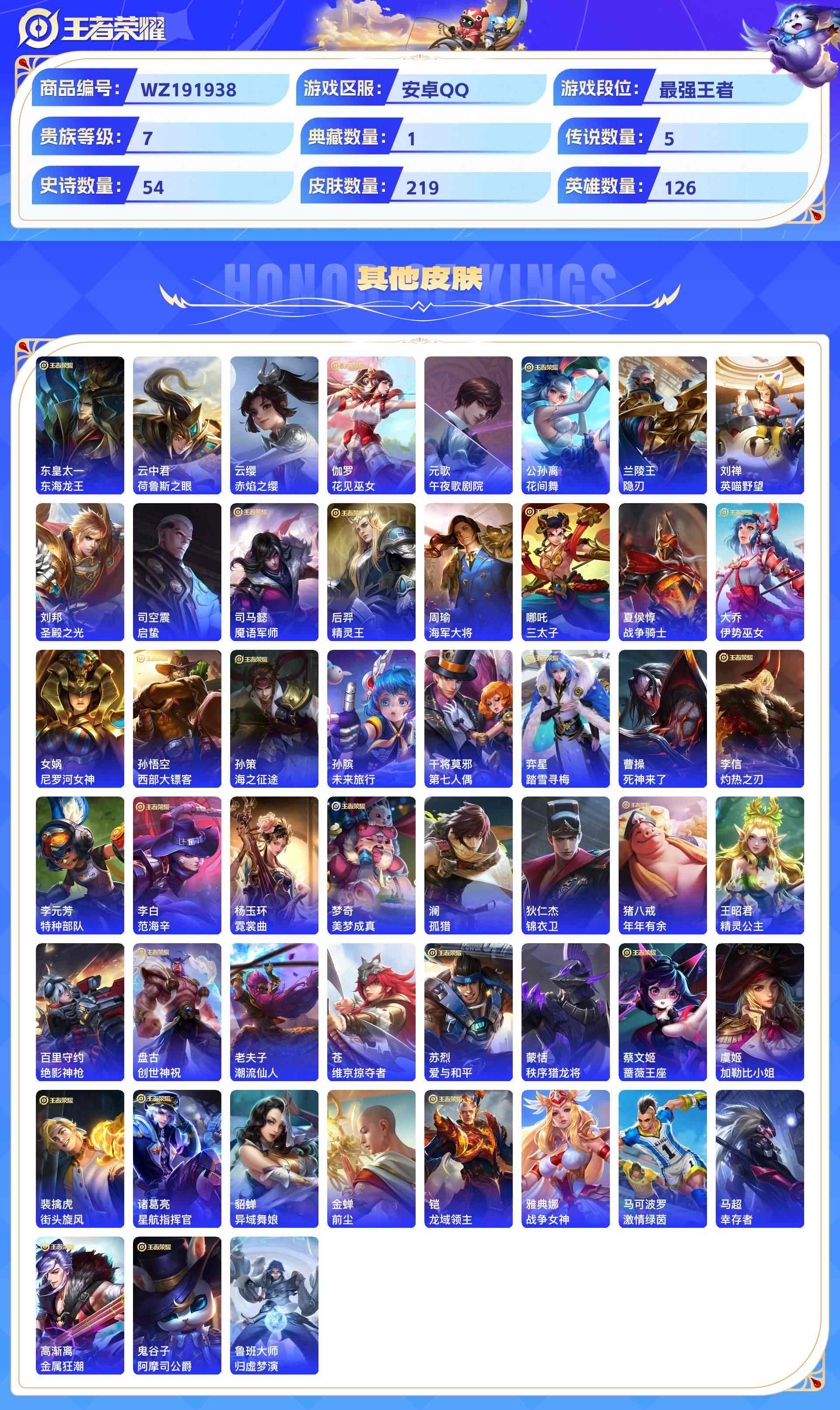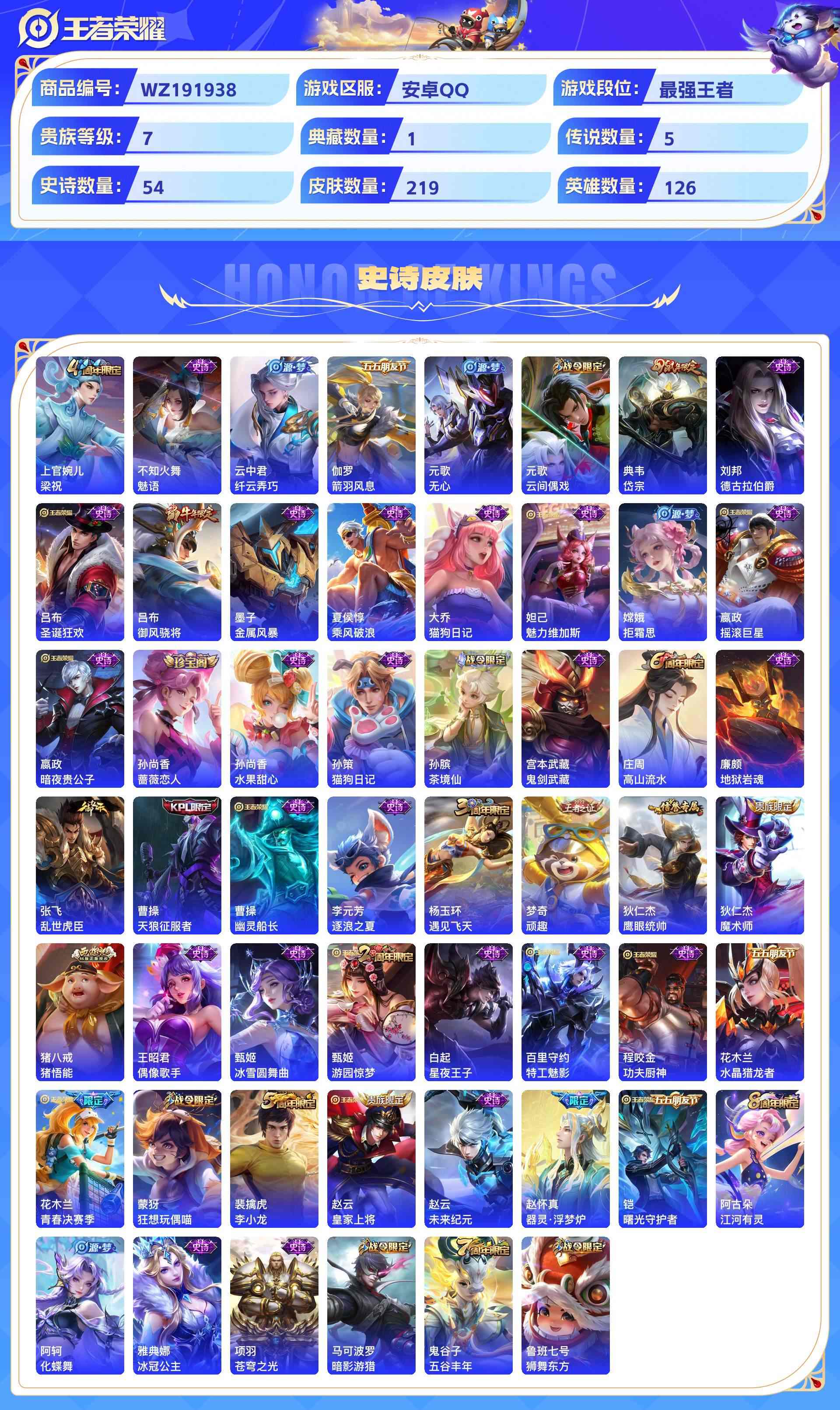 wz191938|精品打野号安卓qq 3个性按键1天幕219皮 贵族7级 1典藏 5传说 54史诗【荣耀典藏】银白咏叹调 幻光神呛末日机甲云鹰飞将鸣野蒿愿照·九州拓 低价出