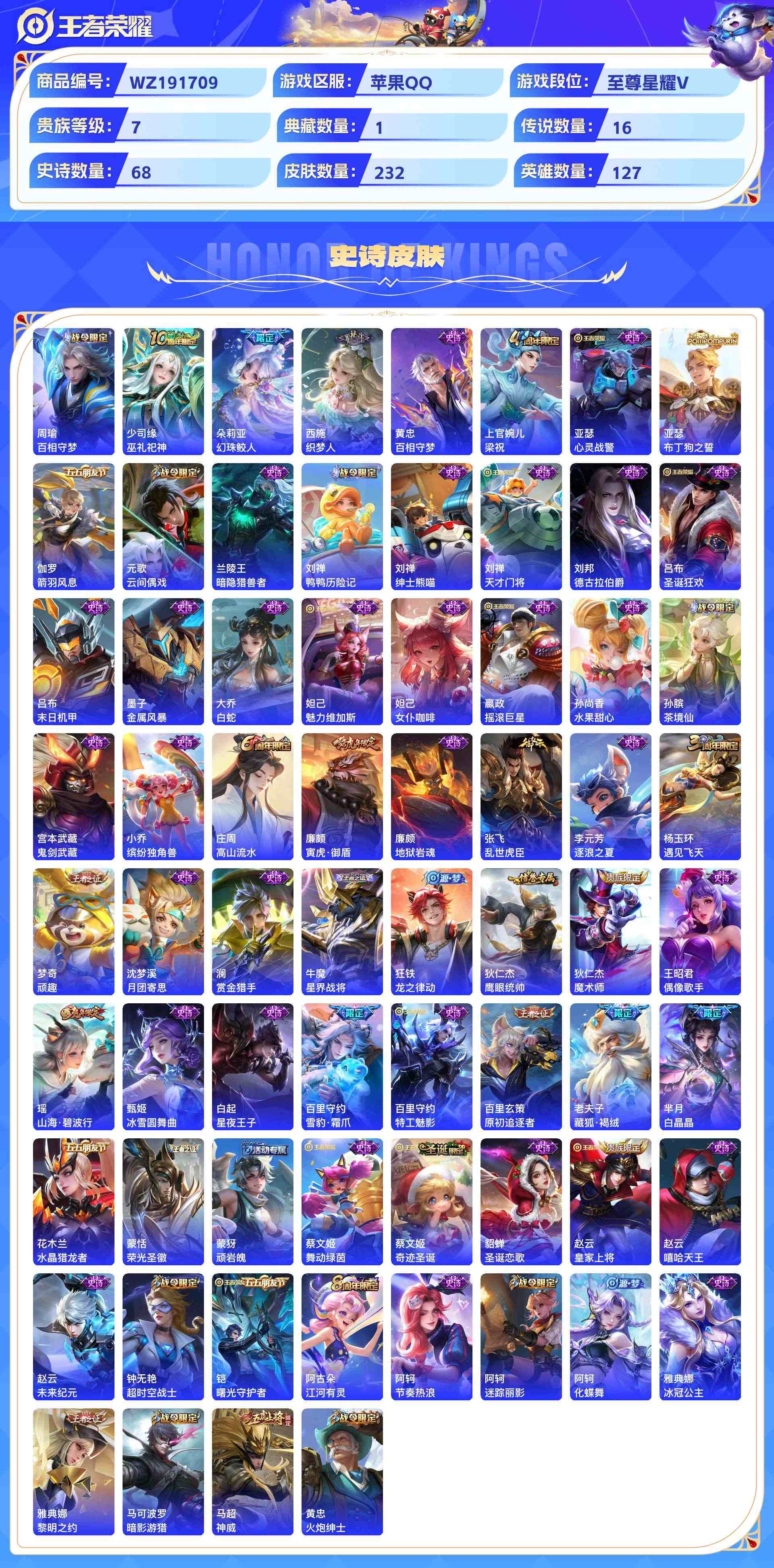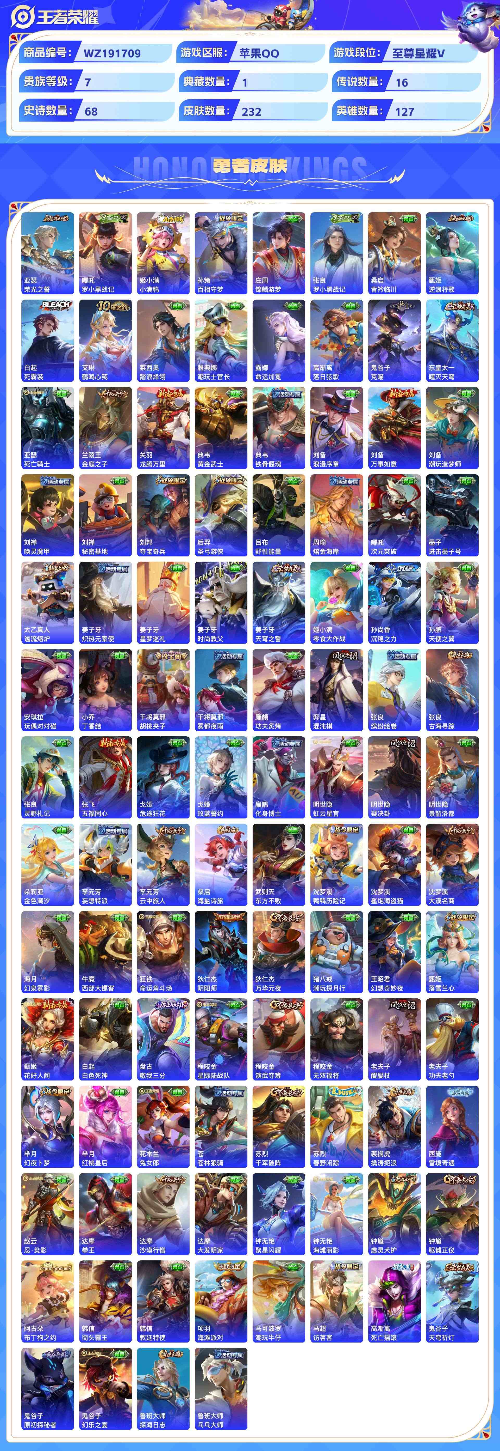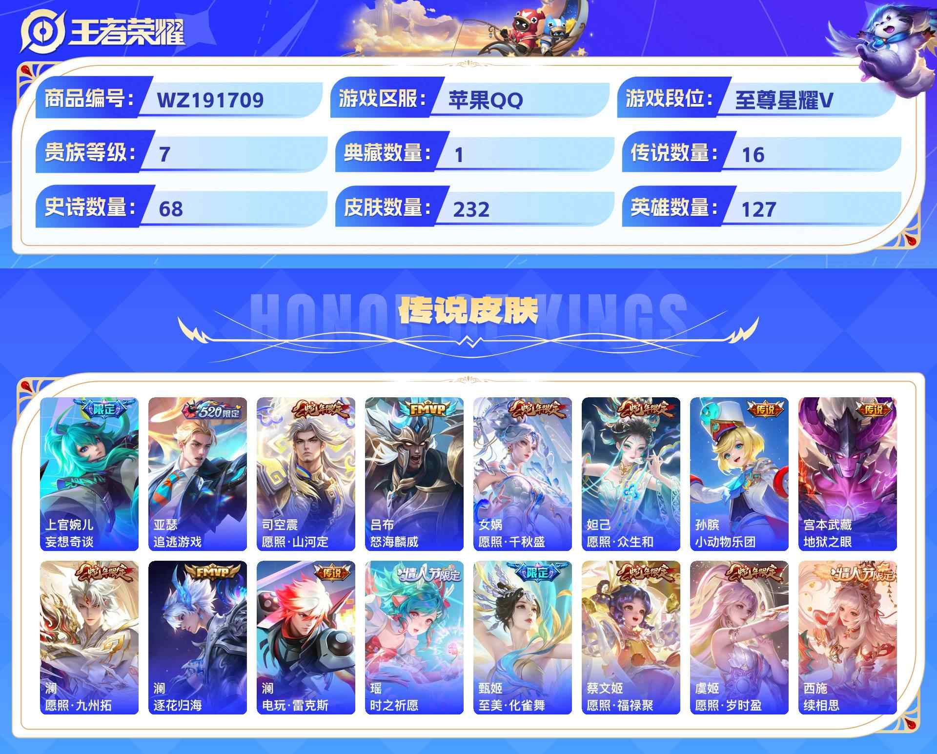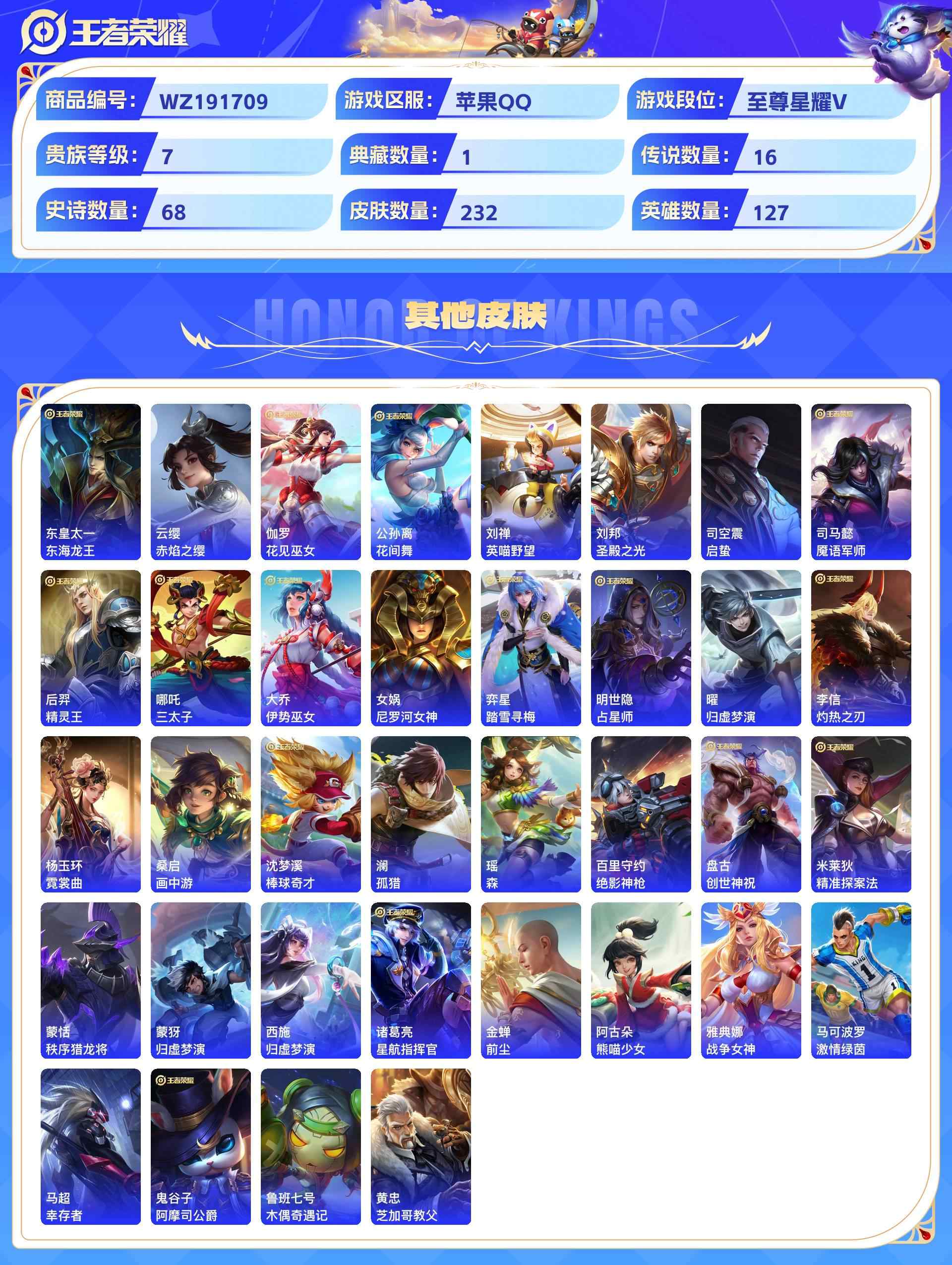 wz191709|精品国标万战号可二次苹果qq1万战国标(亚瑟)3金标(明世隐 刘婵 扁鹊)42段游走 对抗36段 贵族7级 232皮 1典藏 3珍品传说 16传说 68史诗2星传说12个性按键2天幕【荣耀典藏】拾光映像库洛米大耳狗之梦